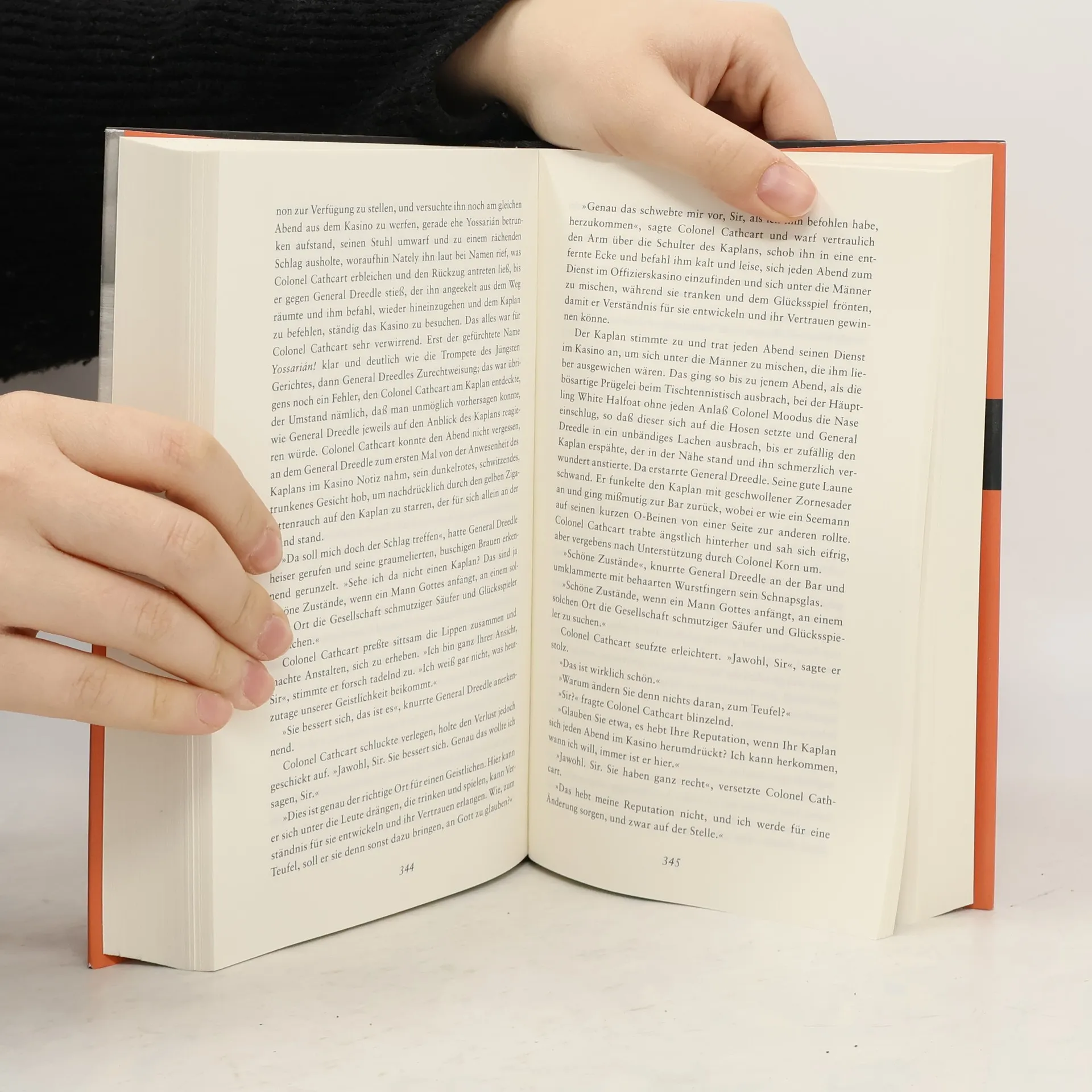 "Catch 22, also Falle 22 oder Trick 22- das ist die ebenso irrsinnige wie ausweglose Dienstanweisung für das amerikanische Bombengeschwader, der zufolge Bomberpilot Yossarian nur dann von weiteren Einsätzen verschont bleibt, wenn er als verrückt anerkannt wird. Verrückt aber kann niemand sein, der sich weigern will, immer weitere großenteils sinnlose Einsätze zu fliegen. Also muß Yossarian ebenso wie seine Kameraden weiterfliegen, obwohl er sich die größte Mühe gibt, als verrückt zu erscheinen. Durch scheinbar absurdes Verhalten der militärischen Maschinerie ihre eigene Absurdität zu demonstrieren. Aber die Kriegsmaschinerie, gespeist aus persönlichem Ehrgeiz, Dummheit, Brutalität und Duckmäuserei, erkennt ihren eigenen Irrsinn nicht in dem Spiegel, den Yossarian - im Grunde der einzig Normale unter lauter Verrückten - vorhält." (fischer)