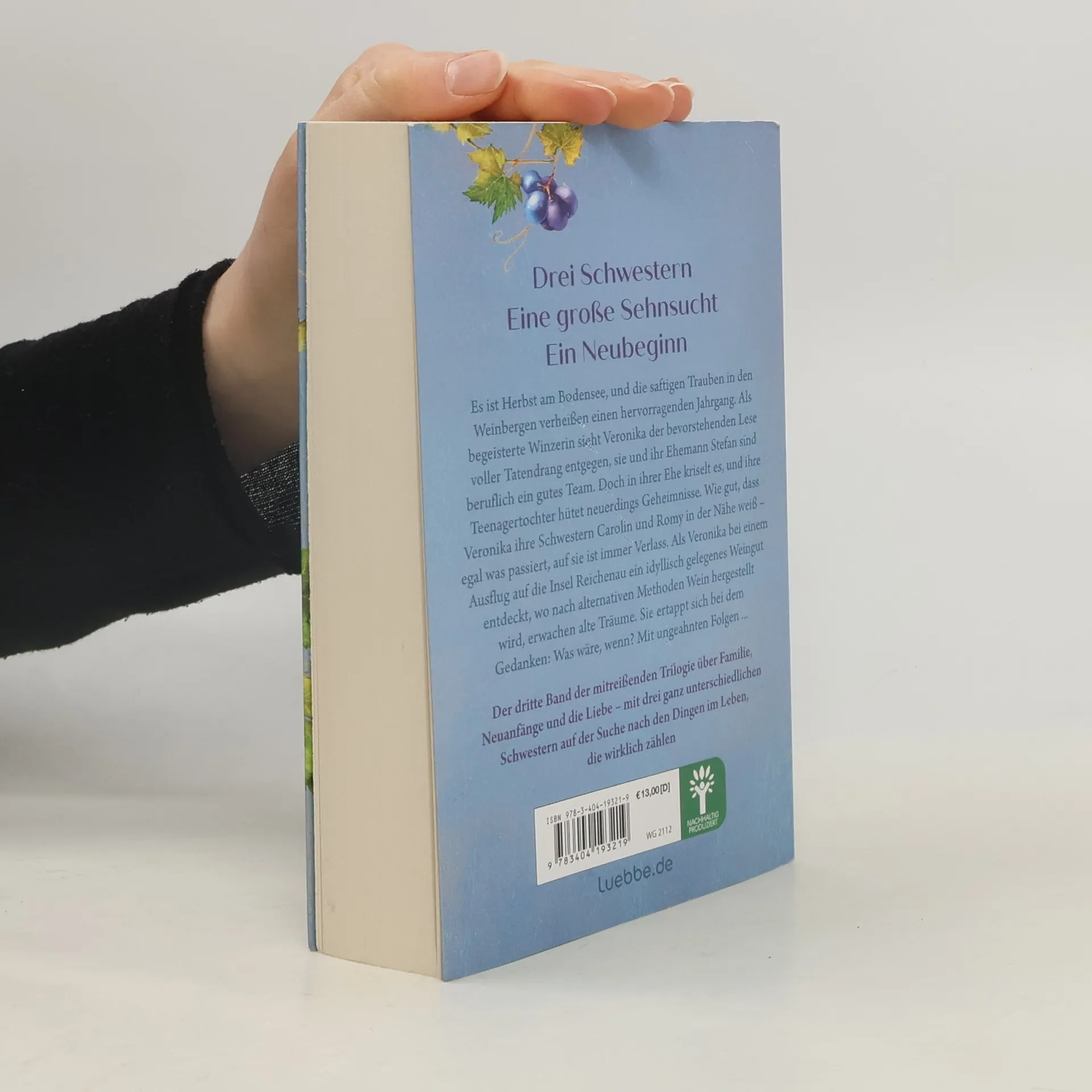 Drei Schwestern. Eine große Sehnsucht. Ein Neubeginn. Es ist Herbst am Bodensee, und die saftigen Trauben in den Weinbergen verheißen einen hervorragenden Jahrgang. Als erfahrene Winzerin weiß Veronika, dass dem kostbaren Geschenk der Natur nun alle Aufmerksamkeit gelten sollte. Doch in ihrer Ehe kriselt es, ihre Teenagertochter Rosalie hütet neuerdings Geheimnisse, und Veronika ist froh, ihre beiden Schwestern Carolin und Romy in ihrer Nähe zu wissen. Da entdeckt sie bei einem Ausflug auf die Insel Reichenau ein idyllisches Ökoweingut, dessen Anblick alte Träume aufleben lässt, und sie ertappt sich beim Gedanken: Was wäre, wenn? Aber ist sie wirklich bereit, beruflich neue Wege zu gehen und auch privat eine längst fällige Entscheidung zu treffen? Traubenfest ist der dritte Band einer mitreißenden Trilogie über Familie, Neuanfänge und die Liebe - mit drei bezaubernden Hauptfiguren auf der Suche nach den Dingen im Leben, die wirklich zählen.