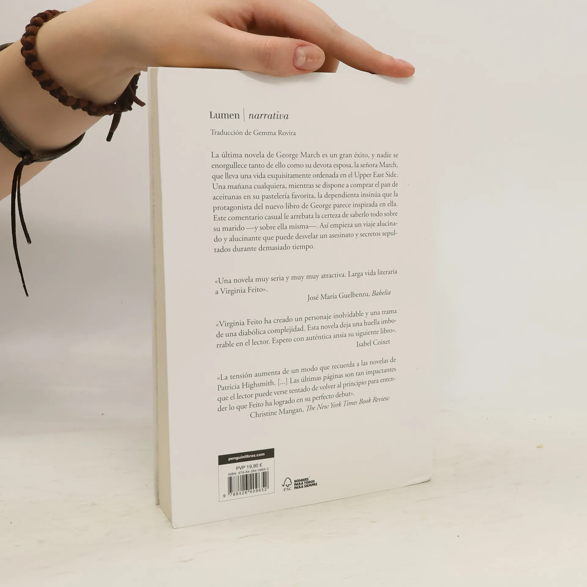 Virginia Feito, una Highsmith del siglo XXI, evoca a la inolvidable Sra. March, un ama de casa del Upper East Side cuya vida se ve destrozada por la última novela de su marido. En este asombroso debut, la venerable pero chismosa escena literaria de Nueva York se tuerce en una casa de diversión claustrofóbica de paranoia, horror y humor perversamente oscuro. La última novela de George March es un éxito. Nadie está más orgulloso que la señora March, su cariñosa esposa. Pero una mañana, el tendero de su pastelería favorita sugiere que su protagonista está basada en la propia Sra. March: "'Pero... -no es ella...' La Sra. March se inclinó y casi en un susurro dijo: ' ¿una puta?'" Agarrando su cartera de cuero de avestruz, ella huye, ese comentario casual destruye su creencia de que sabía todo sobre su esposo, así como sobre sí misma. De repente, la Sra. March se ve envuelta en un viaje desgarrador que se acerca a la psicosis, uno que comienza meramente dentro de las páginas de un libro, pero que puede descubrir tanto a un asesino como los secretos enterrados durante mucho tiempo de su pasado