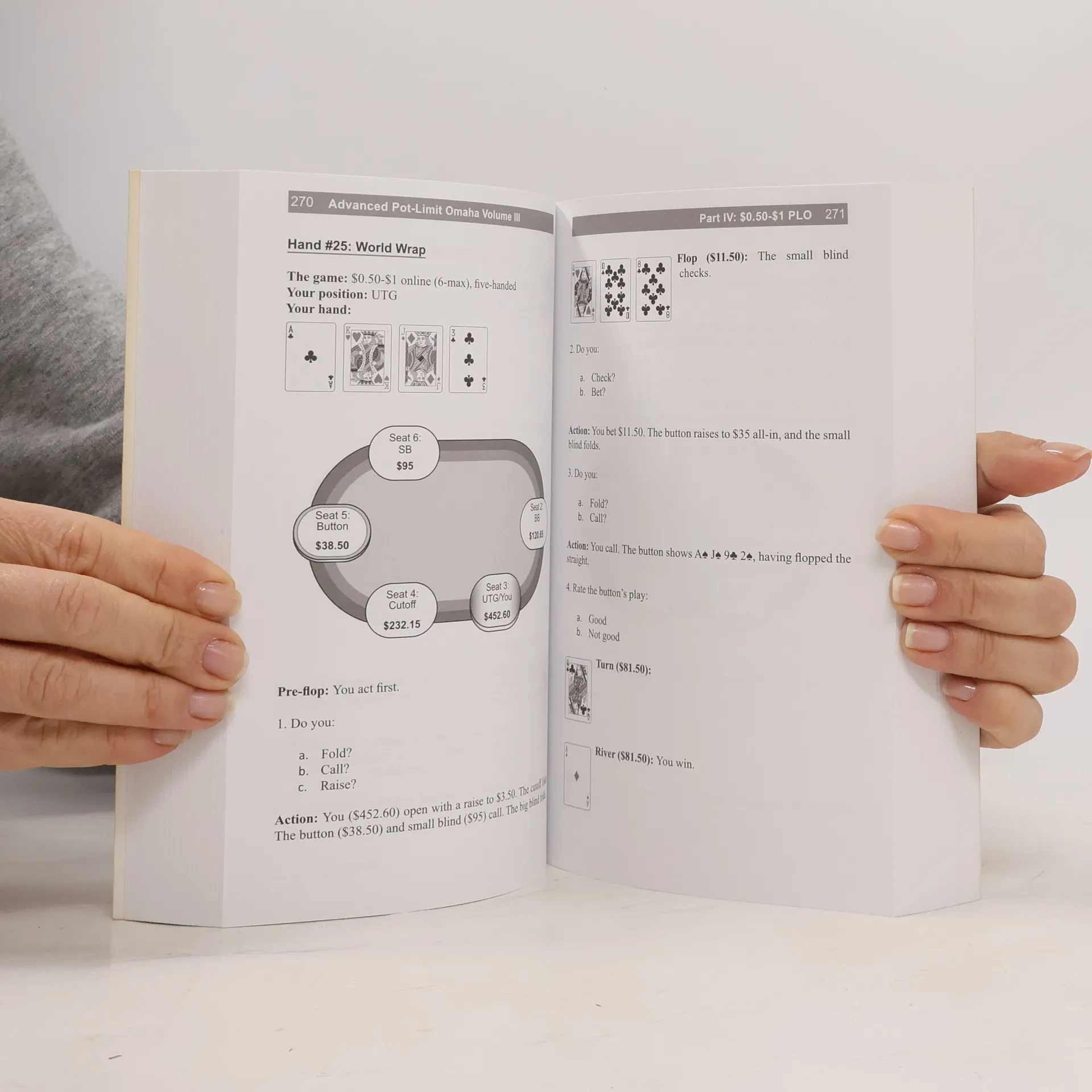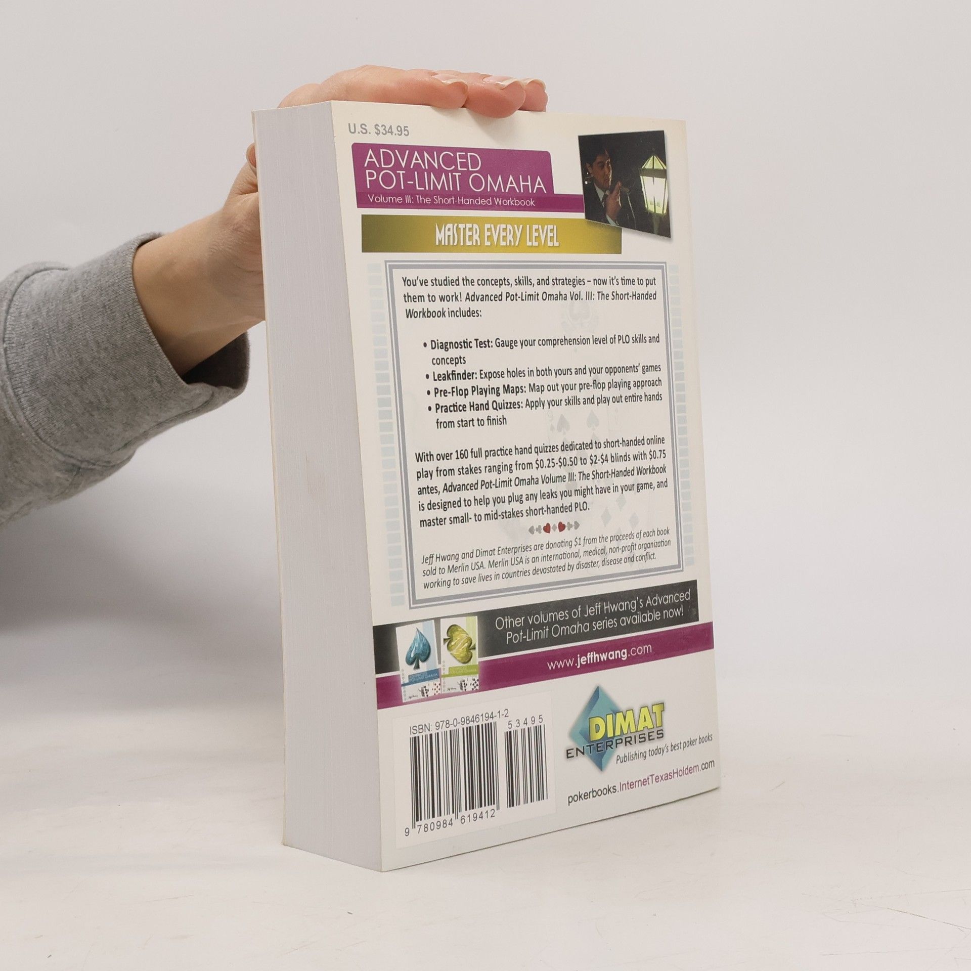 MASTER EVERY LEVEL You've studied the concepts, skills, and strategies -- now it's time to put them to work! Advanced Pot-Limit Omaha Vol. The Short-Handed Workbook - Diagnostic Gauge your comprehension level of PLO skills and concepts - Expose holes in both yours and your opponents' games - Pre-Flop Playing Map out your pre-flop playing approach - Practice Hand Apply your skills and play out entire hands from start to finish With over 160 full practice hand quizzes dedicated to short-handed online play from stakes ranging from $0.25-$0.50 to $2-$4 blinds with $0.75 antes, Advanced Pot-Limit Omaha Volume The Short-Handed Workbook is designed to help you plug any leaks you might have in your game, and master small- to mid-stakes short-handed PLO. Jeff Hwang and Dimat Enterprises are donating $1 of the proceeds of this book to Merlin USA, which specializes in health, saving lives in times of crisis and helps rebuild shattered health ser