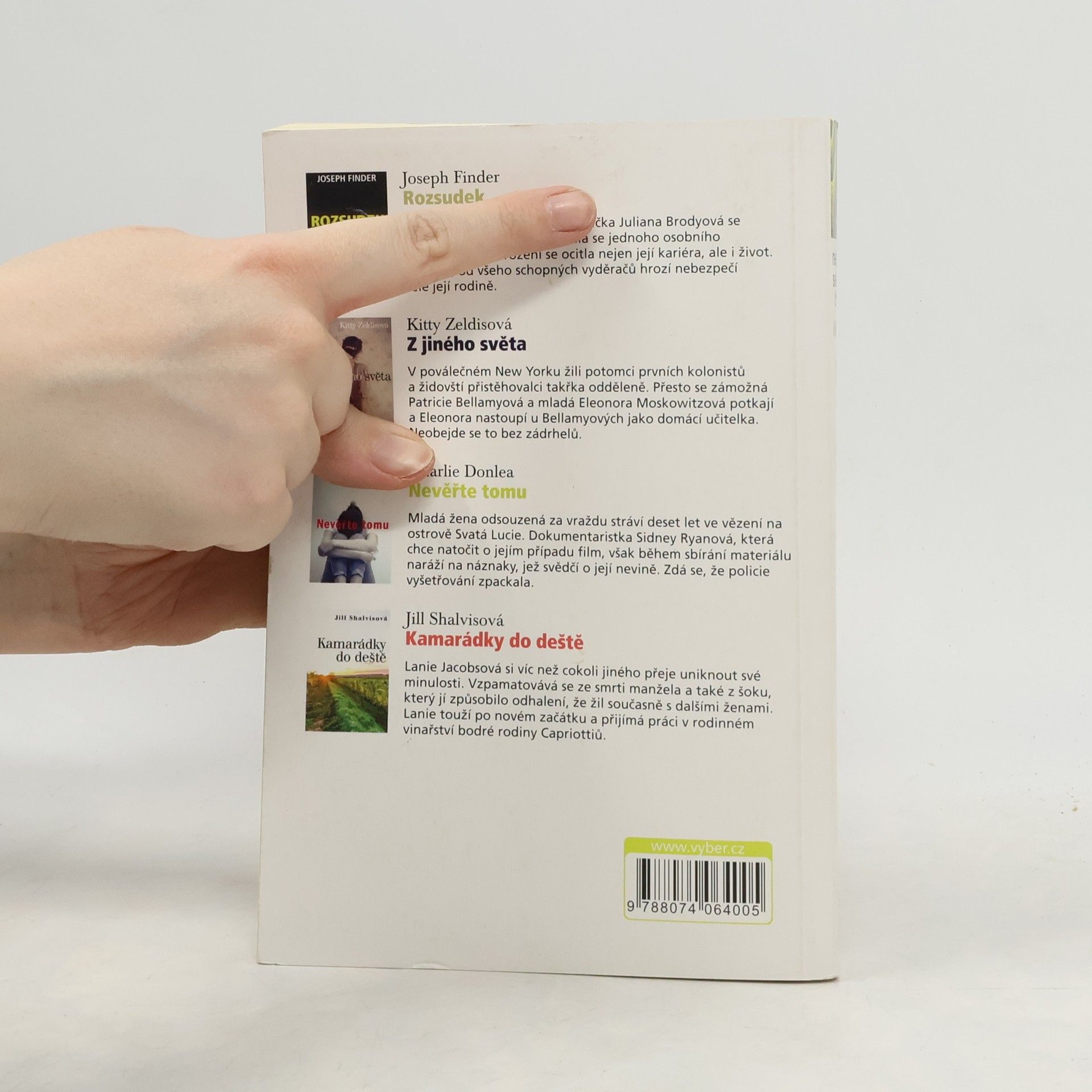 Joseph Finder - Rozsudek: Právnička Juliana Brodyová se stane obětí vydírání. Její rodině hrozí nebezpečí. Kitty Zeldis - Z jiného světa: Poválečný New York. Smí zámožnou slečnu Bellamyovou učit židovská dívka Eleonora Moskowitzová? Charlie Donlea - Nevěřte tomu: Odsouzená žena stráví deset let ve vězení. Nebyl její případ zpackaný? Jill Shalvis - Kamarádky do deště: Lanie Jacobsová je v šoku ze smrti manžela - a z toho, že zjistila, jak ji celý život klamal. Najde novou šanci ve vinařství příjemných Capriottiů?