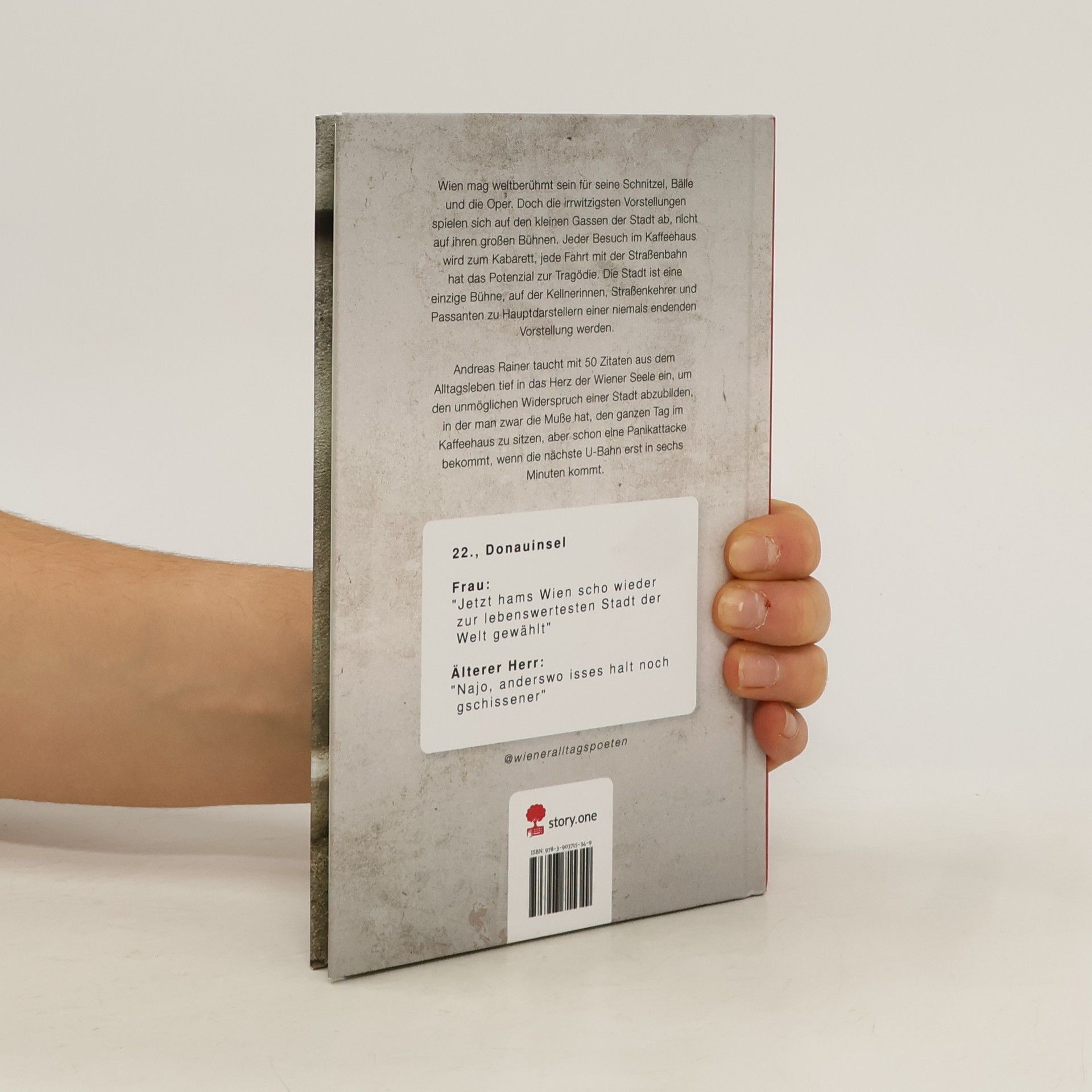 Wien mag weltberühmt sein für seine Schnitzel, Bälle und die Oper. Doch die irrwitzigsten Vorstellungen spielen sich auf den kleinen Gassen der Stadt ab, nicht auf ihren großen Bühnen. Jeder Besuch im Kaffeehaus wird zum Kabarett, jede Fahrt mit der Straßenbahn hat das Potenzial zur Tragödie. Wo auch immer man hingeht, die Stadt ist eine einzige Bühne, auf der Kellnerinnen, Straßenkehrer und Passanten zu Hauptdarstellern einer niemals endenden Vorstellung werden. Andreas Rainer taucht mit 50 Zitaten aus dem Alltagsleben tief in das Herz der Wiener Seele ein, um den unmöglichen Widerspruch einer Stadt abzubilden, in der man zwar die Muße hat, den ganzen Tag im Kaffeehaus zu sitzen, aber schon eine Panikattacke bekommt, wenn die U-Bahn erst in sechs Minuten kommt.