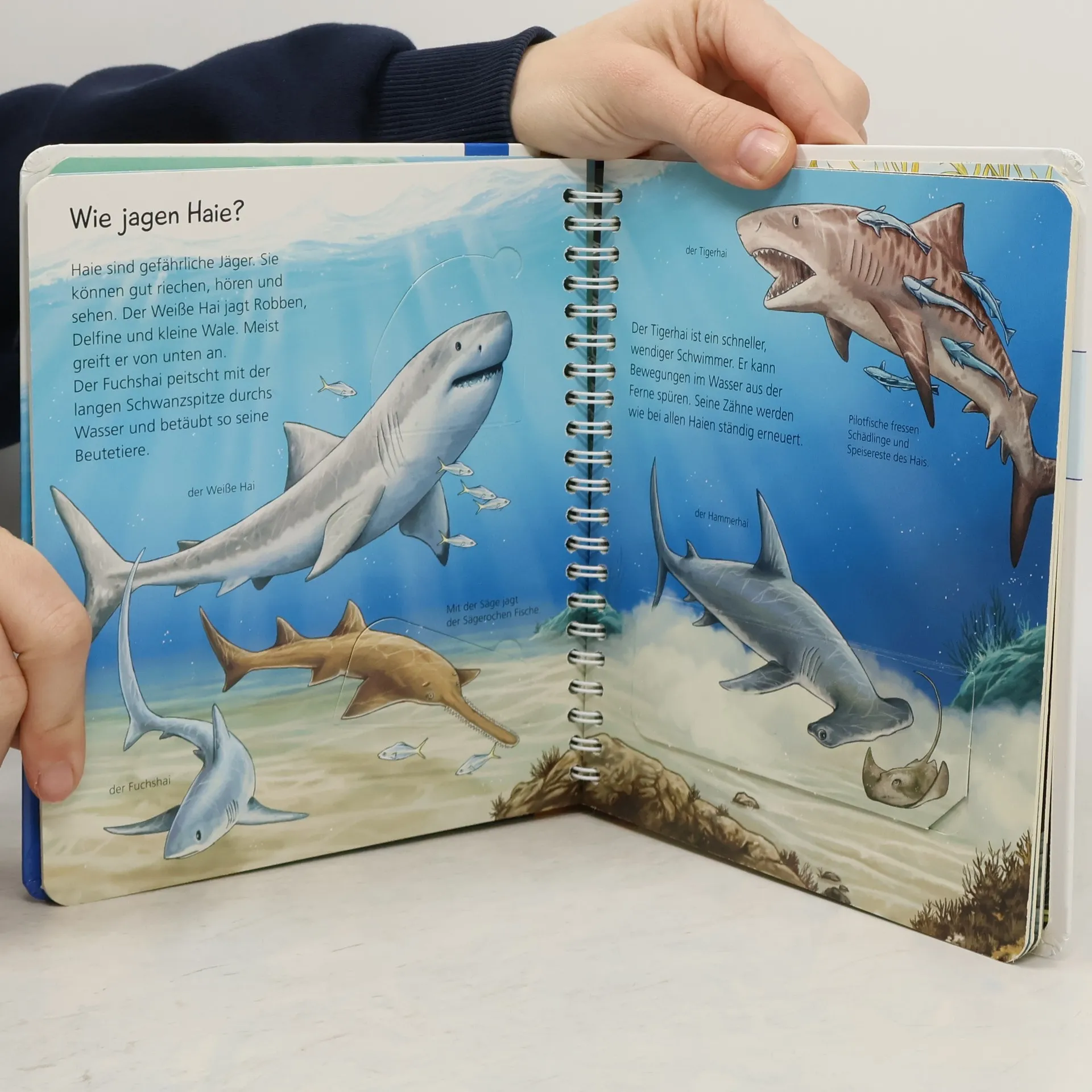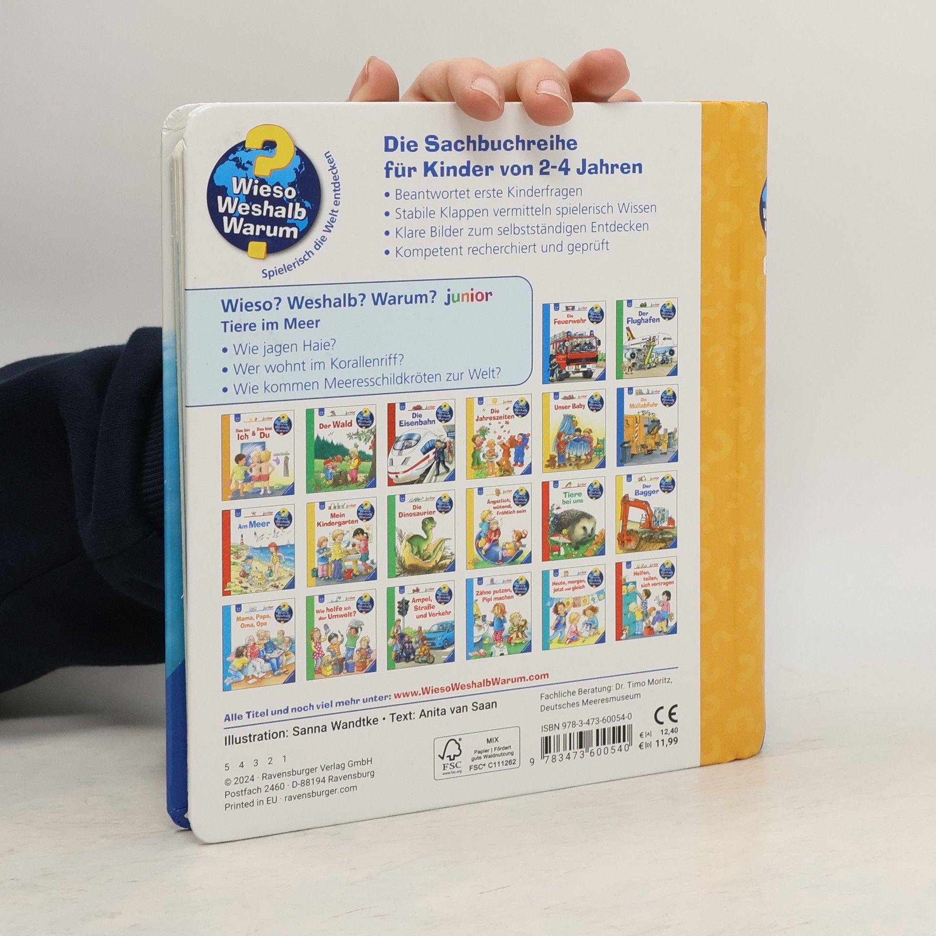 Abtauchen in Unterwasserwelten und Tiere hautnah entdecken Die Ozeane bergen viele Geheimnisse, die Kinder hier endlich lüften können. In diesem Buch entdecken sie die Vielfalt der Tierwelt unter Wasser in ihrer schönsten Farbenpracht. Anhand von eindrucksvollen Klappen erfahren sie, wie sich Meeresbewohner fortbewegen und tarnen. Und wie kommen Seepferdchen zur Welt? Mit welchen Tricks jagen Haie und Rochen? Wie kommen Tiere in der dunklen Tiefsee zurecht? Zum Schluss gibt es noch ein lustiges Such- und Zählspiel. Wieso? Weshalb? Warum? junior Die Sachbuchreihe für Kinder von 2-4 Jahren Jeden Tag entdecken Kinder etwas Neues – und haben viele Fragen. Wann kommt die Feuerwehr? Was machen die Tiere im Winter? Warum muss ich Zähne putzen? Die beliebte Sachbuchreihe Wieso? Weshalb? Warum? junior beantwortet die Fragen der Kinder auf Augenhöhe. Sie beleuchtet unterschiedlichste Themen aus ihrer Alltags- und Interessenswelt altersgerecht und mit viel Liebe zum Detail. Die Reihe ist speziell auf kleine Hände und die Bedürfnisse der Kleinsten angepasst. Klare und liebevolle Bilder, kurze Sachtexte sowie handliche Klappen, die Bewegungen veranschaulichen und überraschende und lustige Einblicke gewähren, ermöglichen Kindern, sich ihre Themen selbst zu erschließen. Der Spaß am eigenhändigen Entdecken, die liebevolle Umsetzung und die hochwertige Ausstattung garantieren langanhaltende Freude an jedem Buch.