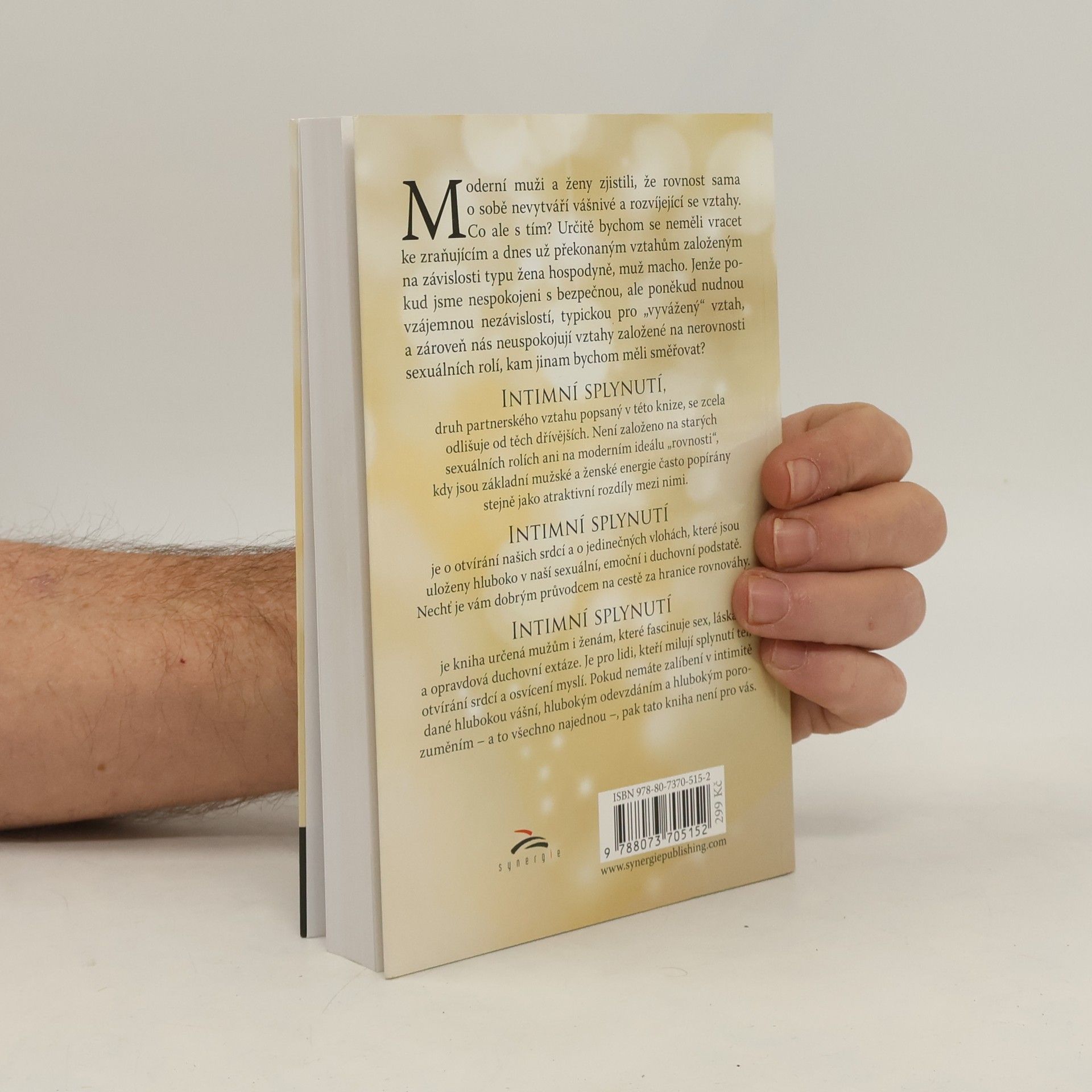 Vydejte se na cestu "za hranice rovnováhy". Tato kniha je o otvírání našich srdcí a o jedinečných vlohách, které jsou uloženy hluboko v naší sexuální, emoční i duchovní podstatě. Moderní muži a ženy totiž zjistili, že rovnost sama o sobě nevytváří vášnivé a rozvíjející se vztahy. Co ale s tím? Určitě bychom se neměli vracet ke zraňujícím a dnes už překonaným vztahům založeným na závislosti typu žena hospodyně, muž macho. Jenže pokud jsme nespokojeni s bezpečnou, ale poněkud nudnou vzájemnou nezávislostí, typickou pro „vyvážený“ vztah, a zároveň nás neuspokojují vztahy, založené na nerovnosti sexuálních rolí, kam jinam bychom měli směřovat? Intimní splynutí, druh partnerského vztahu popsaný v této knize, se zcela odlišuje od těch dřívějších. Není založen na starých sexuálních rolích ani na moderním ideálu „rovnosti“, kdy jsou základní mužské a ženské energie často popírány stejně jako rozdíly mezi nimi. Je třeba nahlédnout "za hranice rovnováhy".