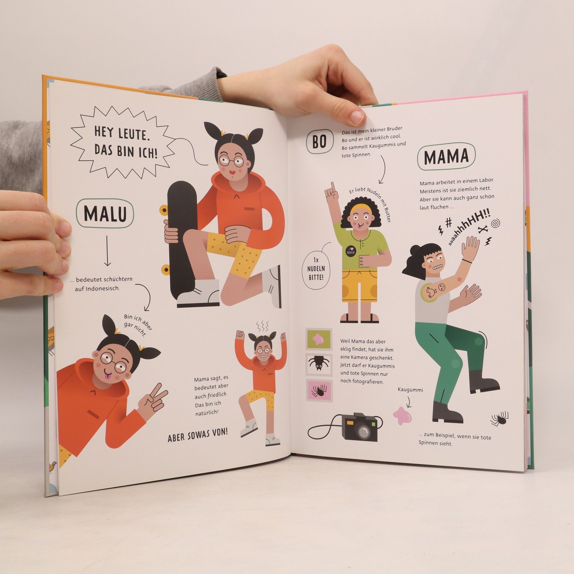 Ein Kinderbuch, das Diversität feiert und zum gemeinsamen Kochen anregt. Mit vielen tollen Kinderlieblingsrezepten. Kennst du Pommessuppe? Oder Goldklumpen mit Piratensauce? Wusstest du, dass man manchmal von Sauerkraut pupsen muss? Und warum hortet die Zack-Oma eigentlich so viele Dosensuppen in ihrer Wohnung? Malu und ihr kleiner Bruder Bo dürfen eine Woche lang ganz ohne Mama bei den unterschiedlichsten Familien zu Mittag essen. Dabei lernen die Geschwister nicht nur verschiedene Familienkonstellationen kennen, sondern auch allerhand neue Lieblingsgerichte. Gut, dass Malu immer ihr Notizbuch dabeihat, um die besten Rezepte zum Nachkochen aufzuschreiben.