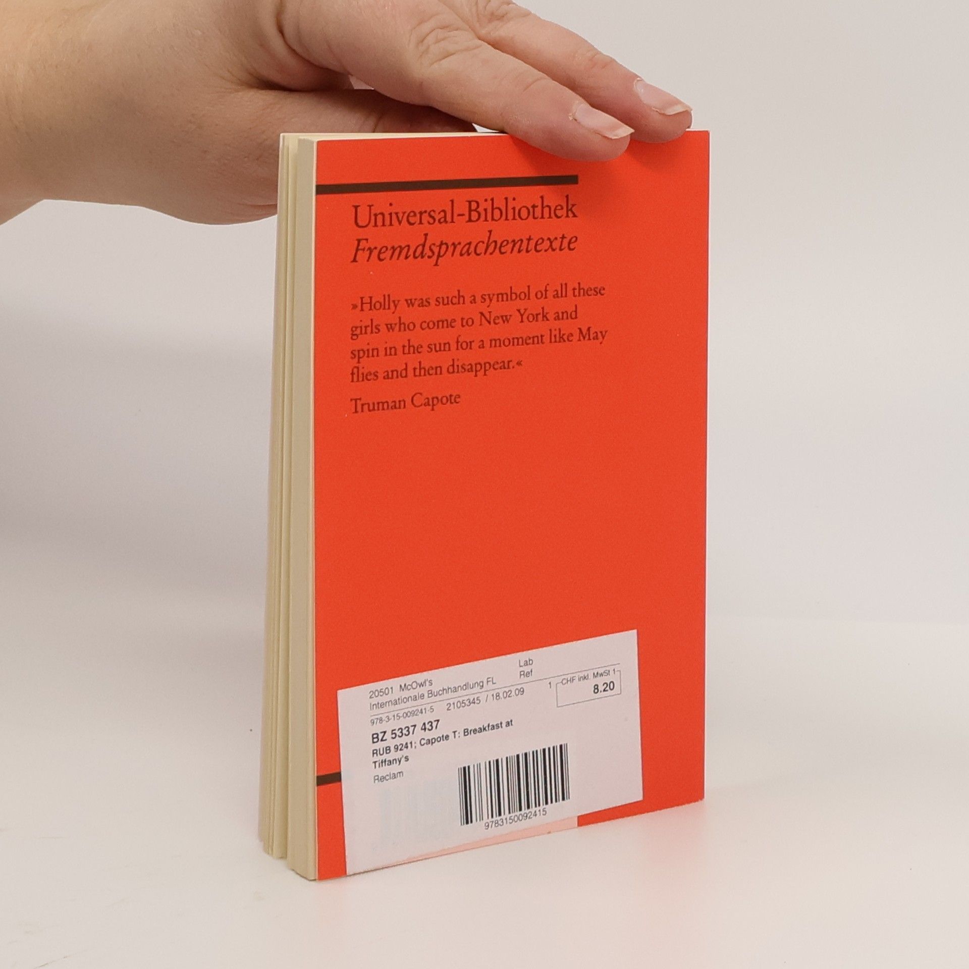 Englische Literatur in Reclams Roter Reihe: das ist der englische Originaltext – mit Worterklärungen am Fuß jeder Seite, Nachwort und Literaturhinweisen. Die Geschichte der rätselhaften, unschuldig-verruchten Holly-Golightly, die aus der tiefsten Provinz nach New York kommt, die Stadt und viele ihrer Bewohner unsicher macht und zu guter Letzt mysteriös aus dem Gesichtskreis all derer verschwindet, die das berückende Nachtschattengewächs lieben. Englische Lektüre: Niveau C1 (GER)