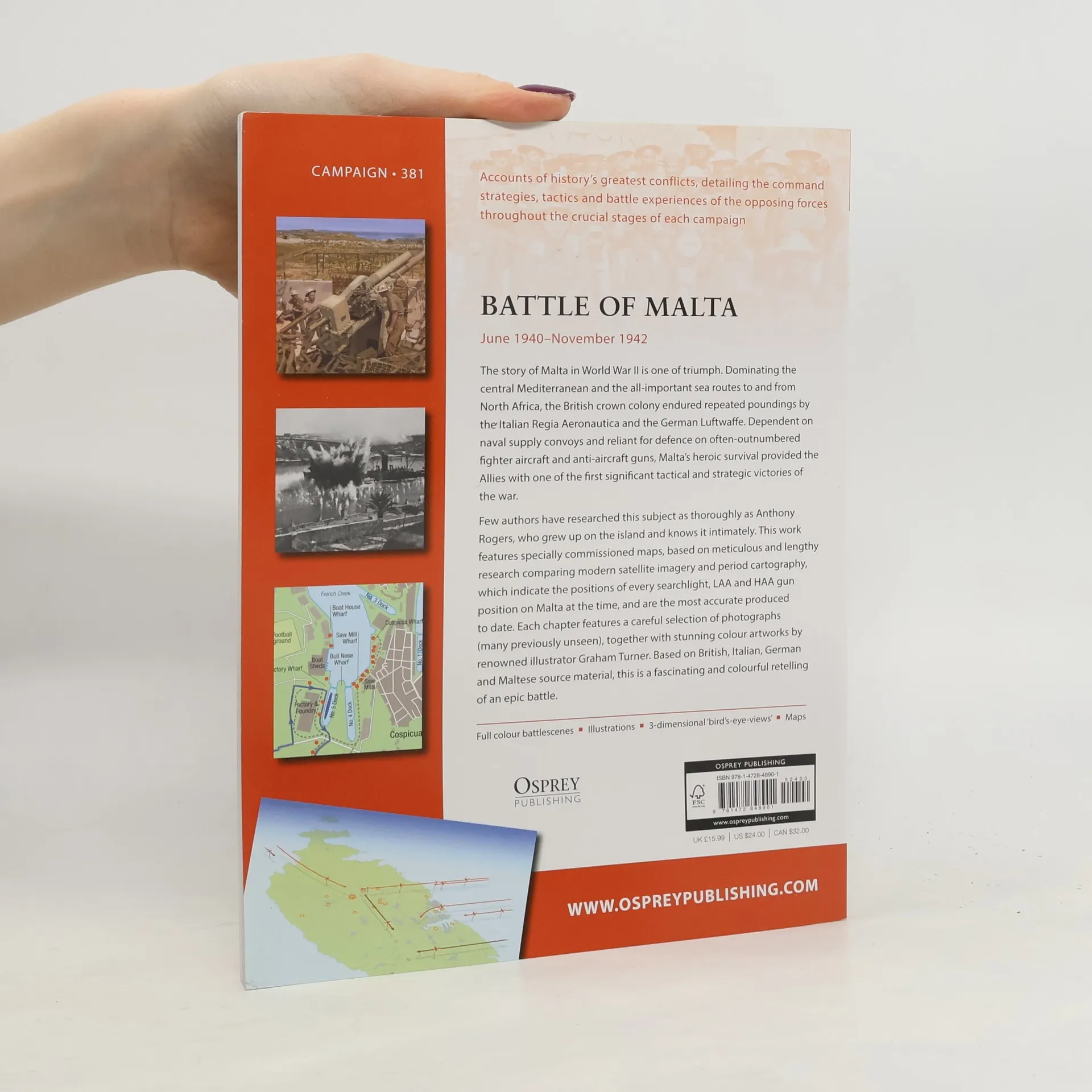 A detailed, illustrated exploration of the land, sea and air units that defended Malta, and the repeated Axis attempts to bring the crucial Allied island fortress to its knees.On 11 June 1940, the British crown colony of Malta – which dominated the central Mediterranean and all-important sea routes to and from North Africa – was bombed for the first time by aircraft of the Italian Regia Aeronautica. The Italians were joined in their efforts by the German Luftwaffe in January 1941. Malta was effectively beleaguered for nearly two and a half years, dependent for survival on naval supply convoys and reliant for defence on often-outnumbered fighter aircraft and anti-aircraft guns.Anthony Rogers provides a retelling of these events, drawing on accounts from both sides. This work features carefully selected photographic images, some previously unpublished. Seven specially commissioned colour maps explore the stategic situation in the Mediterranean in this period, the military sectors into which Malta's defence was divided, and German minelaying operations around the island. The three stunning battlescene artworks and 3D BEVs show key events from the battle, including the 26 July 1941 German attack on the Grand Harbour, and the major Luftwaffe raid 21 March 1942.