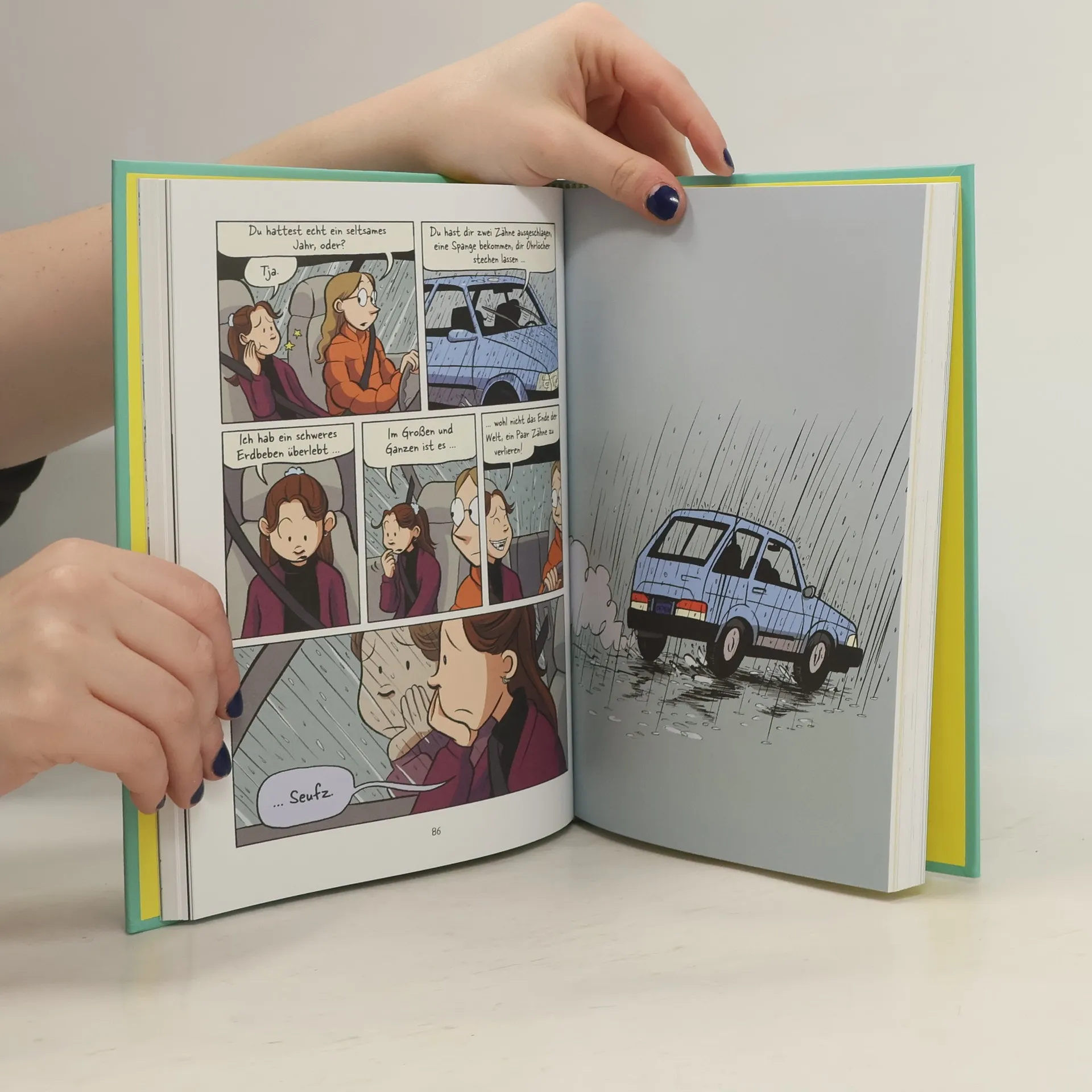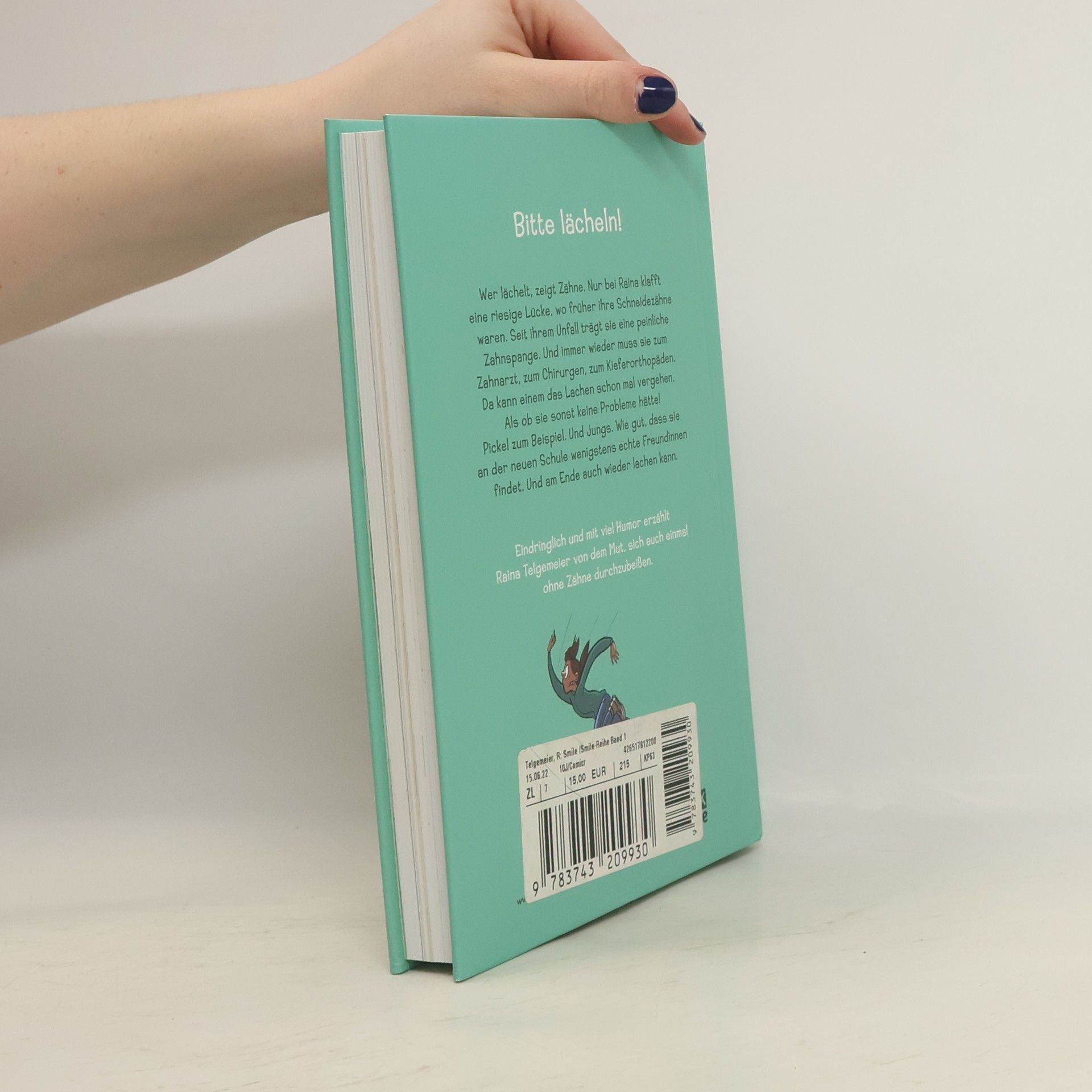 "Bitte lächeln! Wer lächelt, zeight Zähne. Nur bei Raina klafft eine riesige Lücke, wo früher ihre Schneidezähne waren. Seit ihrem Unfall trägt sie eine peinliche Zahnspange. Und immer wieder muss sie zum Zahnarzt, zum Chirurgen, zum Kieferorthopäden. Da kann einem das Lachen schon mal vergehen. Als ob sie sonst keine Probleme hätte! Pickel zum Beispiel. Und Jungs. Wie gut, dass sie an der neuen Schule wenigstens echte Freundinnen findet. Und am Ende auch wieder lachen kann." -- back cover