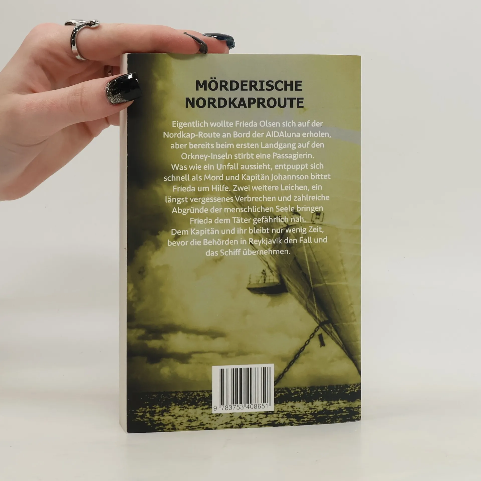 MÖRDERISCHE NORDKAPROUTE. Krimispannung auf der AIDAluna. Eigentlich wollte Frieda Olsen sich auf der Nordkap-Route an Bord der AIDAluna erholen, aber bereits beim ersten Landgang auf den Orkney-Inseln stirbt eine Passagierin. Was wie ein Unfall aussieht, entpuppt sich schnell als Mord und Kapitän Johannson bittet Frieda um Hilfe. Zwei weitere Leichen, ein längst vergessenes Verbrechen und zahlreiche Abgründe der menschlichen Seele bringen Frieda dem Täter gefährlich nah. Dem Kapitän und ihr bleibt nur wenig Zeit, bevor die Behörden in Reykjavik den Fall und das Schiff übernehmen. Sämtliche Handlungen und Personen sind frei erfunden.