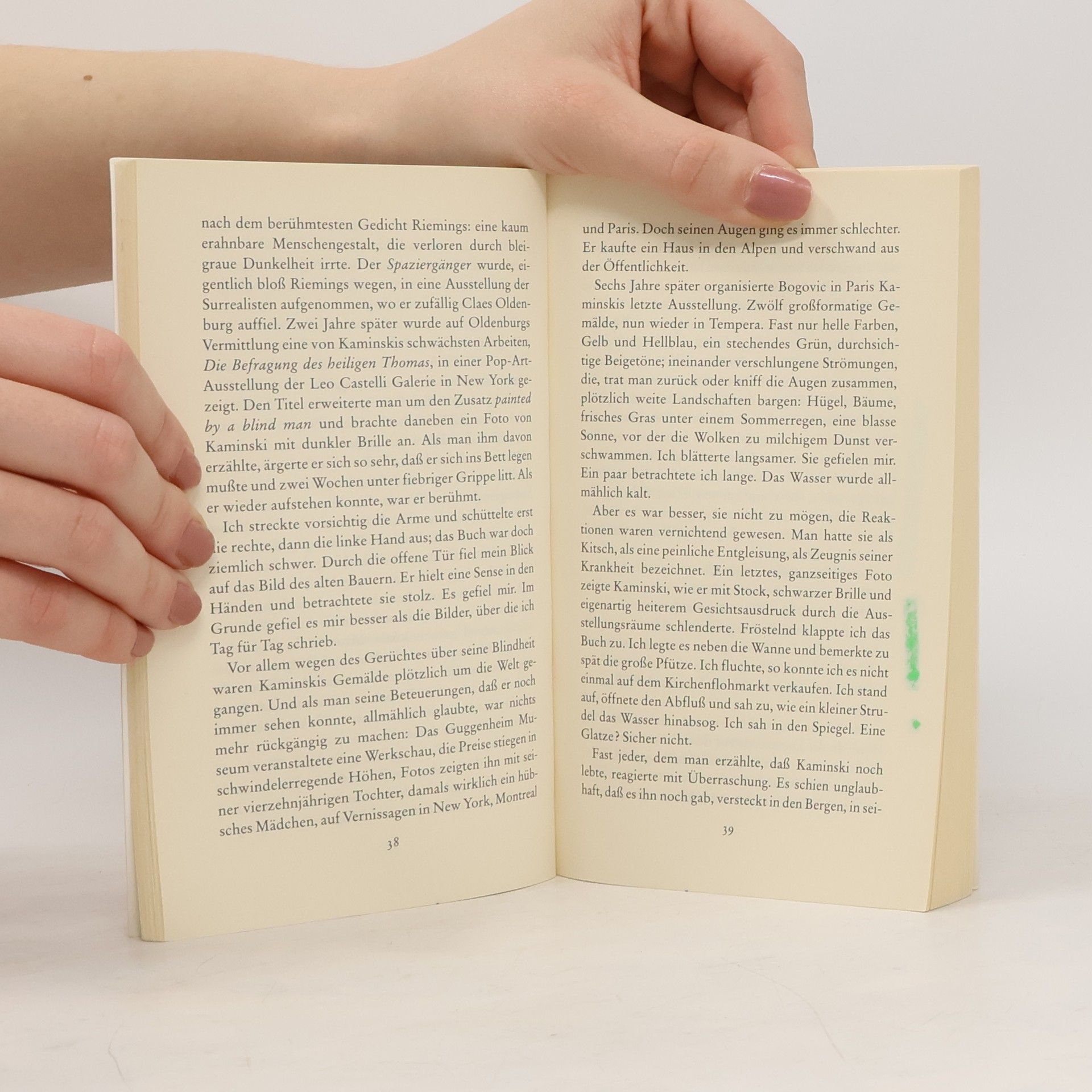 Mit kleineren Gelegenheitsarbeiten schlägt sich Sebastian Zöllner nach seinem Kunstgeschichtsstudium so durch, aber nun hat er einen ganz großen Fisch an der Angel: Er schreibt die Biographie des Malers Kaminski, der, entdeckt und gefördert einst von Matisse und Picasso, durch eine Pop-Art-Ausstellung, seine dunkle Brille und die Bildunterschrift „Painted by a blind man“ weltberühmt wurde. Inzwischen lebt Kaminski zurückgezogen in den Alpen und ist ein wenig in Vergessenheit geraten. Soll die Biographie noch rechtzeitig zum Ableben fertig werden, und dieser Termin lässt natürlich größere Aufmerksamkeit erwarten, dann ist Eile geboten. Zöllner, der zunächst mit alten Freunden und Feinden, mit Sammlern und Galeristen gesprochen hat, macht sich zum Objekt seiner Begierde auf den Weg, um exklusive O-Töne zu bekommen. Womit er nicht gerechnet hat: Kaminski ist abgeschirmt durch ein ganzes Heer von Vertrauten, und als es dem Biographen endlich trickreich gelingt, die Bewacher loszuwerden und den Maler auf eine tagelange Reise im Auto mitzunehmen, erkennt er, dass er dem Alten, blind oder auch nicht, in keiner Weise gewachsen ist. Daniel Kehlmann hat einen hochironischen Roman geschrieben, in dem die Ereignisse immer neue und überraschende Wendungen nehmen, ein brillant witziges Verwirrspiel um Lebenslügen und Wahrheit, um Manipulation, um Moral und Kunst.