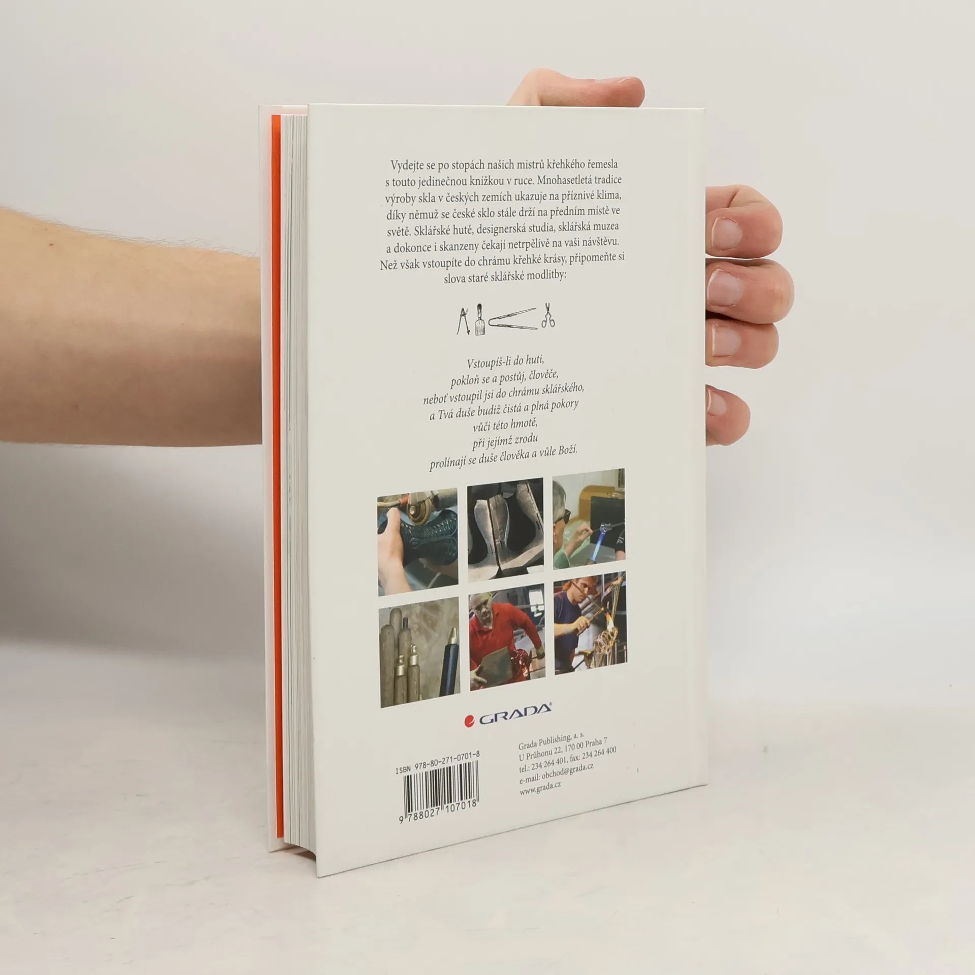 Vydejte se po stopách našich mistrů křehkého řemesla s touto jedinečnou knížkou v ruce. Mnohasetletá tradice výroby skla v českých zemích ukazuje na příznivé klima, díky němuž se české sklo stále drží na předním místě ve světě. Sklářské hutě, designerská studia, sklářská muzea a dokonce i skanzeny čekají netrpělivě na vaši návštěvu. Než však vstoupíte do chrámu křehké krásy, připomeňte si slova staré sklářské modlitby: Vstoupíš-li do huti, pokloň se a postůj, člověče, neboť vstoupil jsi do chrámu sklářského, a Tvá duše budiž čistá a plná pokory vůči této hmotě, při jejímž zrodu prolínají se duše člověka a vůle Boží.