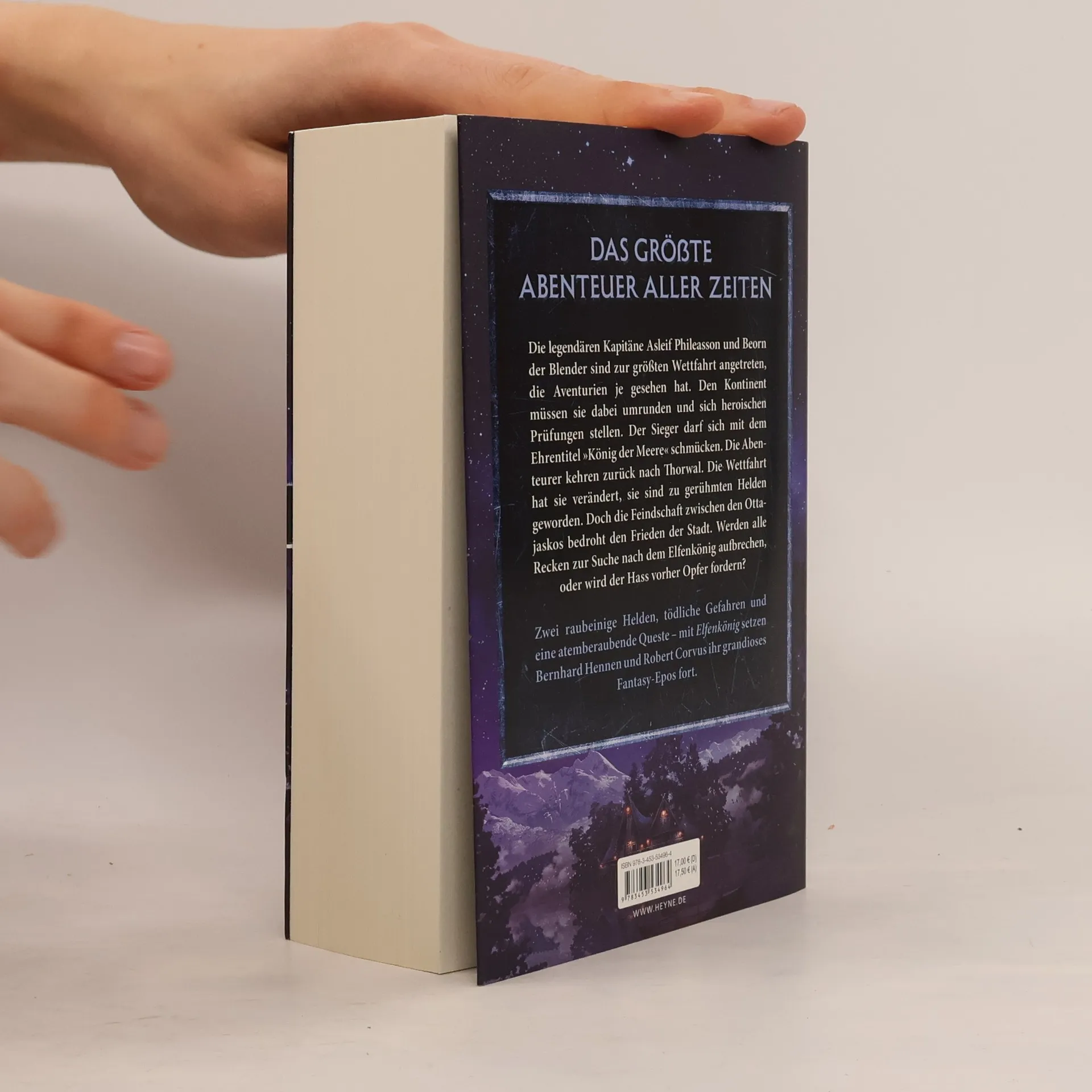 Die legendären Kapitäne Asleif Phileasson und Beorn der Blender sind zur größten Wettfahrt angetreten, die Aventurien je gesehen hat. Den Kontinent müssen sie dabei umrunden und sich heroischen Prüfungen stellen. Der Sieger darf sich mit dem Ehrentitel "König der Meere" schmücken. Die Abenteurer kehren zurück nach Thorwal. Die Wettfahrt hat sie verändert, sie sind zu gerühmten Helden geworden. Doch die Feindschaft zwischen den Ottajaskos bedroht den Frieden der Stadt. Werden alle Recken zur Suche nach dem Elfenkönig aufbrechen, oder wird der Hass vorher Opfer fordern?Zwei raubeinige Helden, tödliche Gefahren und eine atemberaubende Queste - mit Elfenkönig setzen Bernhard Hennen und Robert Corvus ihr grandioses Fantasy-Epos fort.