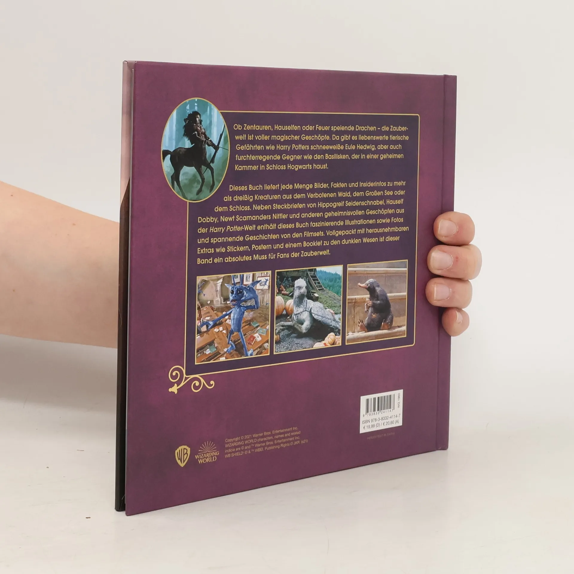 Ob Zentauren, Hauselfen oder Feuer speiende Drachen – die Zauberwelt ist voller magischer Geschöpfe. Da gibt es liebenswerte tierische Gefährten wie Harry Potters schneeweiße Eule Hedwig, aber auch furchterregende Gegner wie den Basilisken, der in einer geheimen Kammer in Schloss Hogwarts haust. Dieses Buch liefert jede Menge Bilder, Fakten und Insiderinfos zu mehr als dreißig Kreaturen aus dem Verbotenen Wald, dem Großen See oder dem Schloss. Neben Steckbriefen von Hippogreif Seidenschnabel, Hauself Dobby, Newt Scamanders Niffler und anderen geheimnisvollen Geschöpfen aus der "Harry Potter"- Welt enthält dieses Buch faszinierende Illustrationen sowie Fotos und spannende Geschichten von den Filmsets. Vollgepackt mit herausnehmbaren Extras wie Stickern, Postern und einem Booklet zu den dunklen Wesen ist dieser Band ein absolutes Muss für Fans der Zauberwelt.