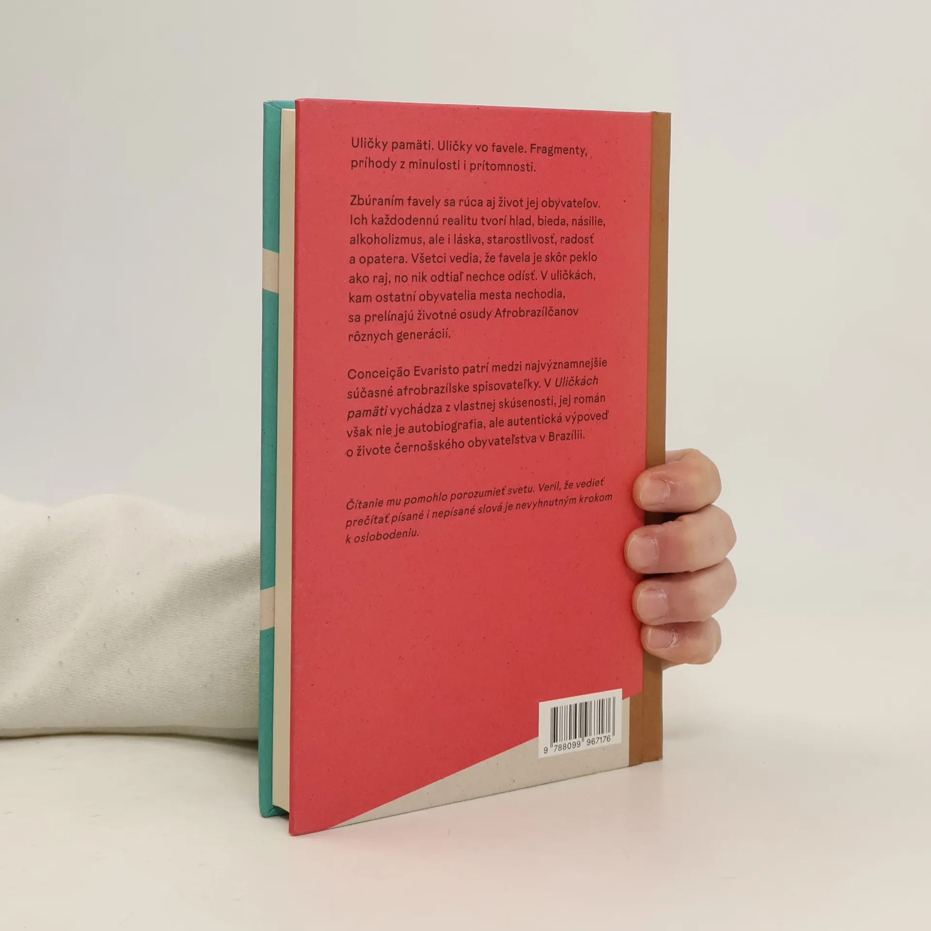 Uličky pamäti. Uličky vo favele. Fragmenty, príhody z minulosti i prítomnosti. Zbúraním favely sa rúca aj život jej obyvateľov. Ich každodennú realitu tvorí hlad, bieda, násilie, alkoholizmus, ale i láska, starostlivosť, radosť a opatera. Všetci vedia, že favela je skôr peklo ako raj, no nik odtiaľ nechce odísť. V uličkách, kam ostatní obyvatelia mesta nechodia, sa prelínajú životné osudy Afrobrazílčanov rôznych generácií. Conceiçao Evaristo patrí medzi najvýznamnejšie súčasné afrobrazílske spisovateľky. V Uličkách pamäti vychádza z vlastnej skúsenosti, jej román však nie je autobiografia, ale autentická výpoveď o živote černošského obyvateľstva v Brazílii. Vydanie publikácie z verejných zdrojov podporil Fond na podporu umenia. Čítanie mu pomohlo porozumieť svetu. Veril, že vedieť prečítať písané i nepísané slová je nevyhnutným krokom k oslobodeniu.