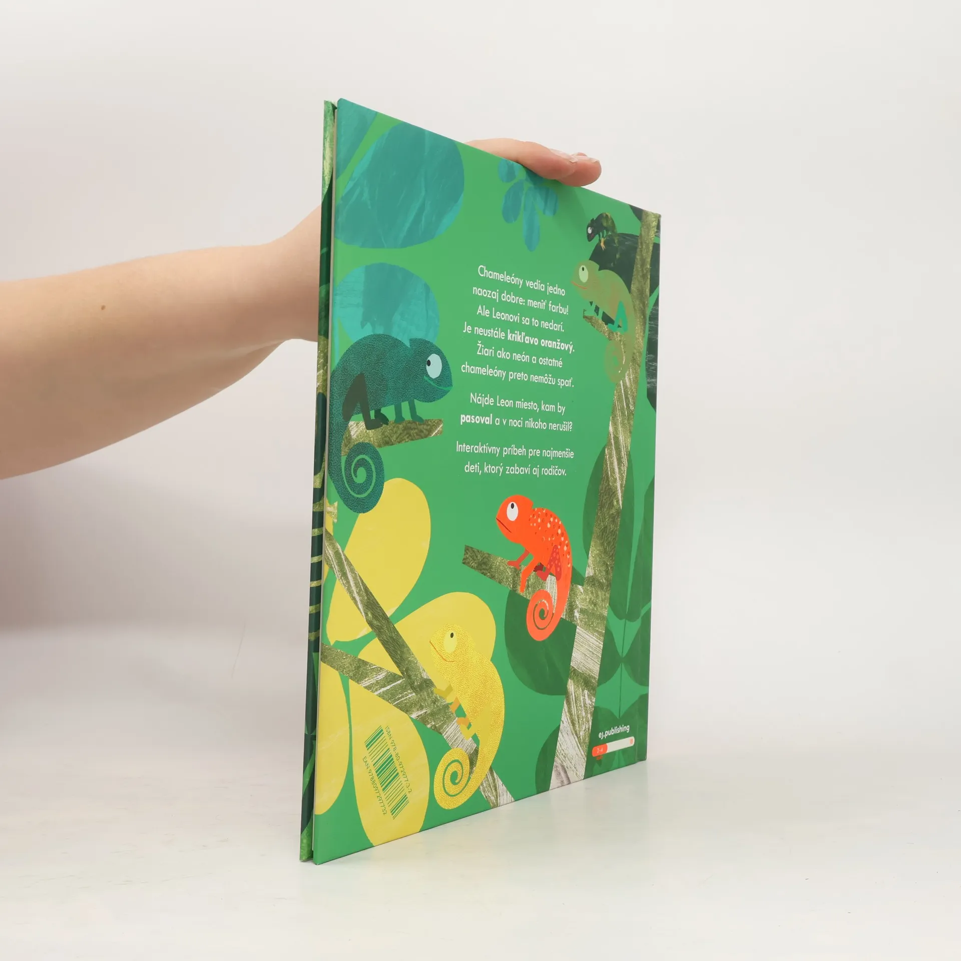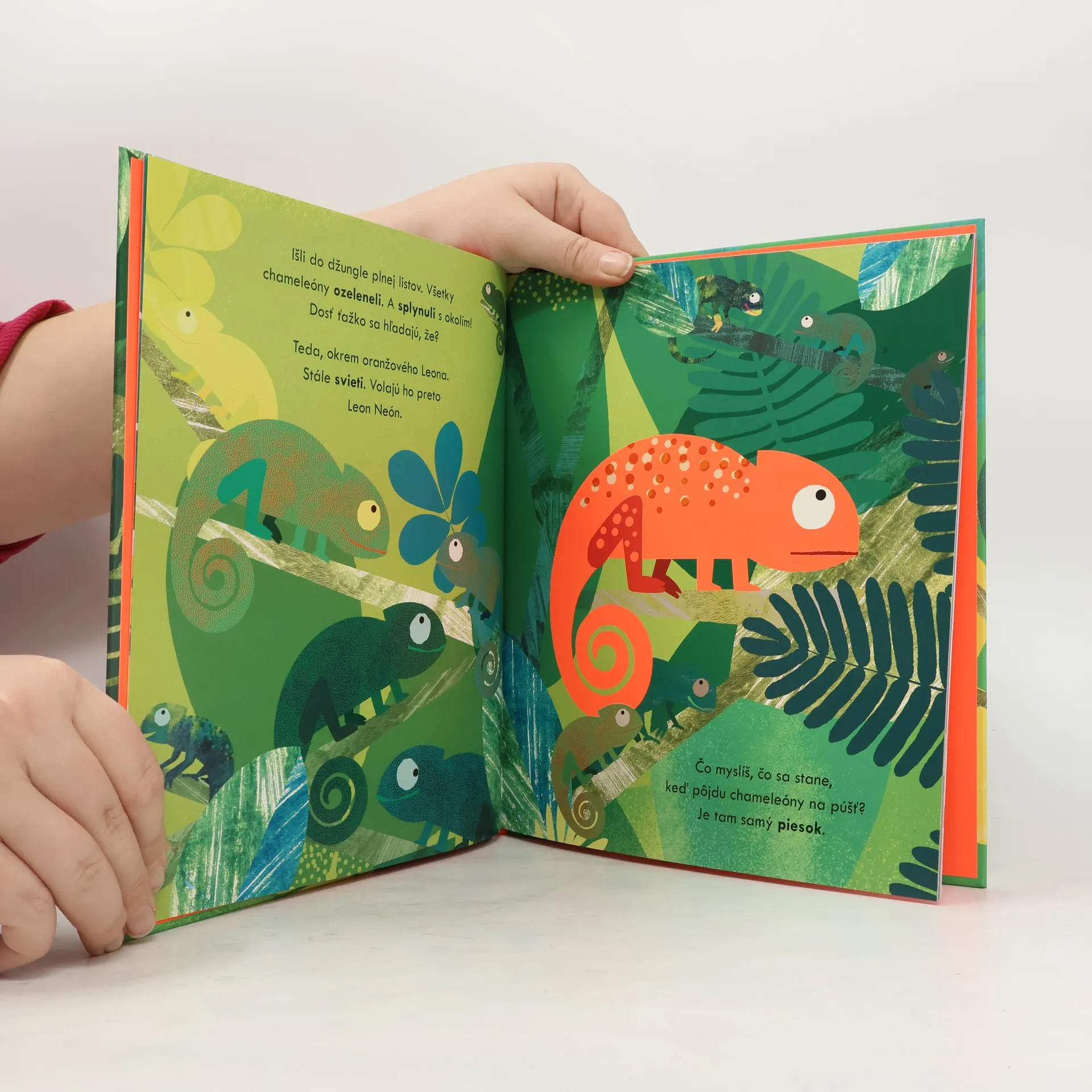 Leon je chameleón, ktorému sa nedarí zmeniť farbu, a tak nikam nepasuje. Je krikľavo oranžový. V noci žiari tak, že ostatné chameleóny nemôžu spať. Podarí sa mu napokon nájsť miesto kam by sa predsa len hodil? Interaktívna knižka pre najmenších s krásnymi ilustráciami, žiarivými farbami a textom, ktorý deti vtiahne do deja a zabaví aj dospelých.