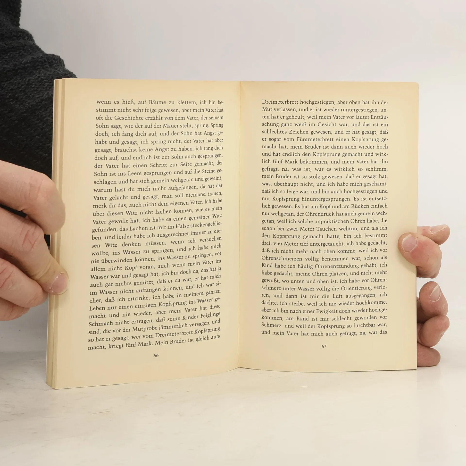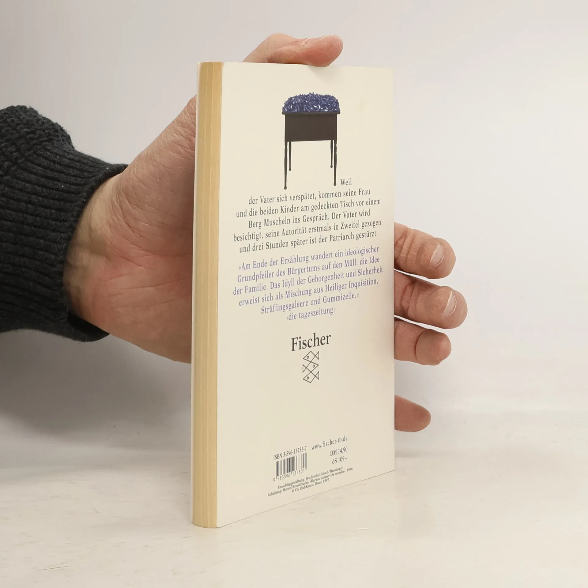 Die wenigen Stunden, die der Familienvater sich verspätet, und während derer die Frau und die beiden jugendlichen Kinder wartend am Abendessenstisch sitzen, genügen, um aus der sorgfältig ausbalancierten Kleinfamilie einen Haufen zersprengter Einzelteile zu machen. Die drei sitzen vor einem Berg Muscheln, die sich eklig schmatzend öffnen und die eigentlich niemand außer dem Vater gerne ißt, und sie beginnen in dieser unerwarteten Auszeit miteinander zu sprechen. Es entsteht so plötzlich wie überraschend ein Riß in der familiären Scheinidylle. Der Vater wird besichtigt und es bleibt nicht besonders viel übrig von diesem Mann und seiner fragwürdigen väterlichen Autorität. Birgit Vanderbeke läßt das Labor Familie in die Luft fliegen, sie zieht den Stöpsel, und durch eine kleine Veränderung in der Versuchsanordnung kommen der repressive Mief und der kleinbürgerliche Ehrgeiz, aber auch die versteckte Liebe zutage.