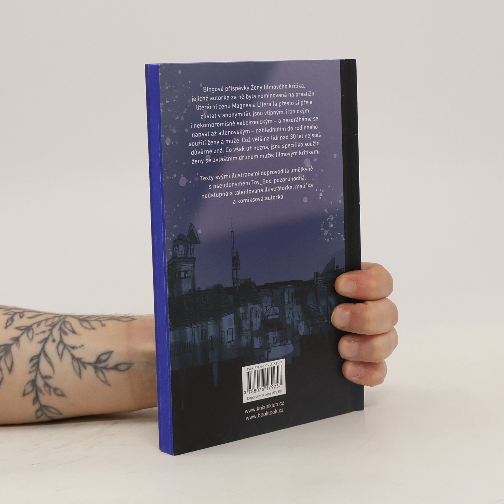 Facebookové příspěvky Ženy filmového kritika, jejichž autorka za ně byla nominovaná na prestižní literární cenu Magnesia Litera (a přesto si přeje zůstat v anonymitě), jsou vtipným, ironickým i nekompromisně sebeironickým – a nezdráháme se napsat až allenovským – nahlédnutím do rodinného soužití ženy a muže. Což většina lidí nad 30 let nejspíš důvěrně zná. Co však už nezná, jsou specifika soužití ženy se zvláštním druhem muže: filmovým kritikem. Texty svými ilustracemi doprovodila umělkyně s pseudonymem Toy_Box, pozoruhodná, neuhýbající a mimořádně talentovaná ilustrátorka, malířka a komiksová autorka.