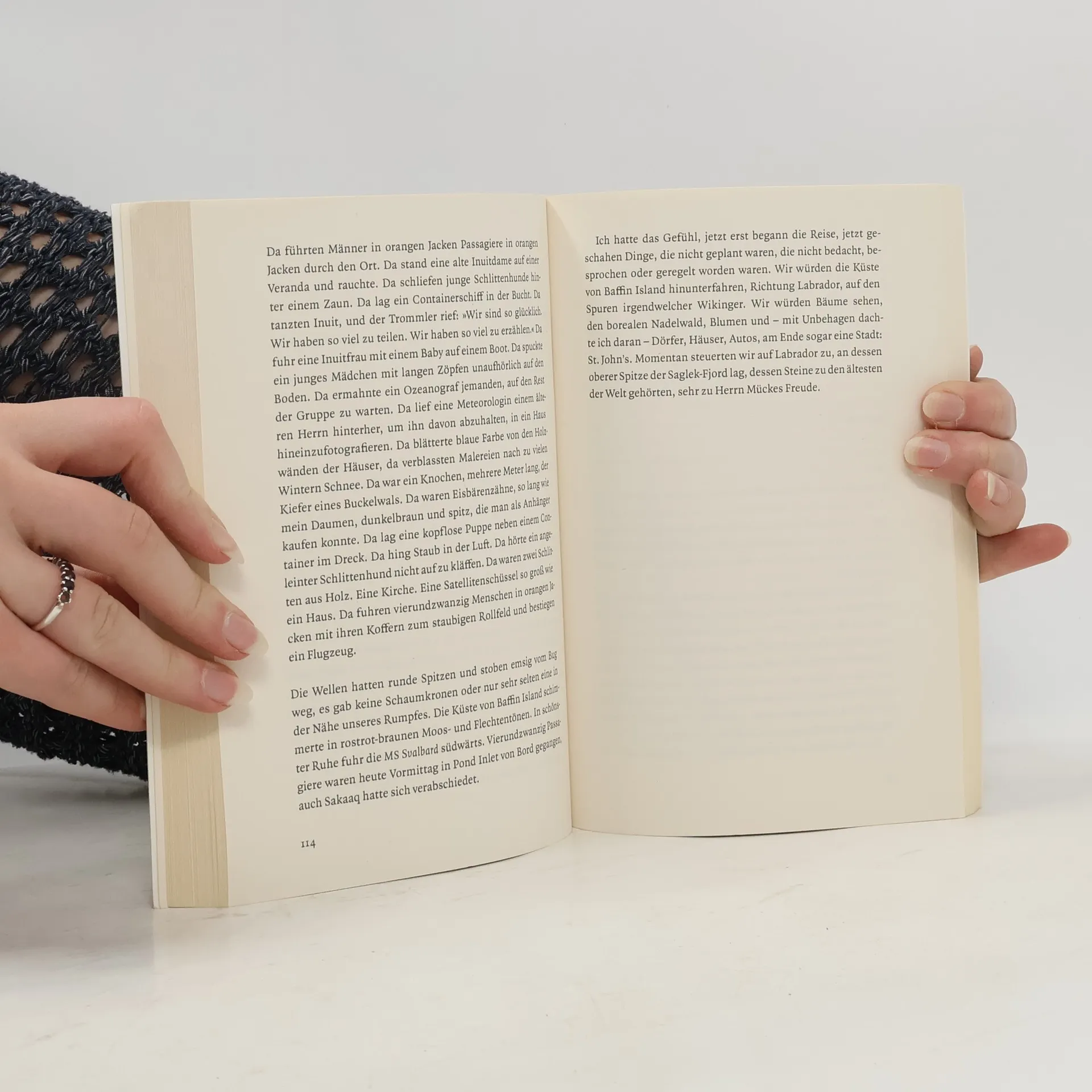 Eine Fotografin, 45, kein Partner, keine Kinder, keine Eltern mehr, geht auf eine Expeditionskreuzfahrt von Grönland nach Alaska. Sie ist froh, dass ihr Beruf es ihr erlaubt, "dauernd nach vorn zu sehen". Doch natürlich melden sich die nicht zu Ende gedachten Gedanken und offenen Fragen, irgendwo zwischen der Enge an Bord unter nicht ausnahmslos angenehmen Mitreisenden (wie Schriftsteller, die Buchclub-Schreibkurse geben, oder Influencer mit fragwürdigen Tischmanieren) und den kühlen Weiten der Arktis. Der Blick der Erzählerin auf die anderen, die Natur und sich selbst ist so hintergründig-witzig wie warmherzig-entlarvend. Als das Schiff vor der vereisten Bellotstraße kehrtmachen muss, mit neuem Kurs auf Neufundland, begreift sie nach und nach, dass der Trick manchmal gerade im Beinahe-Ankommen besteht, auf Reisen wie im Leben.