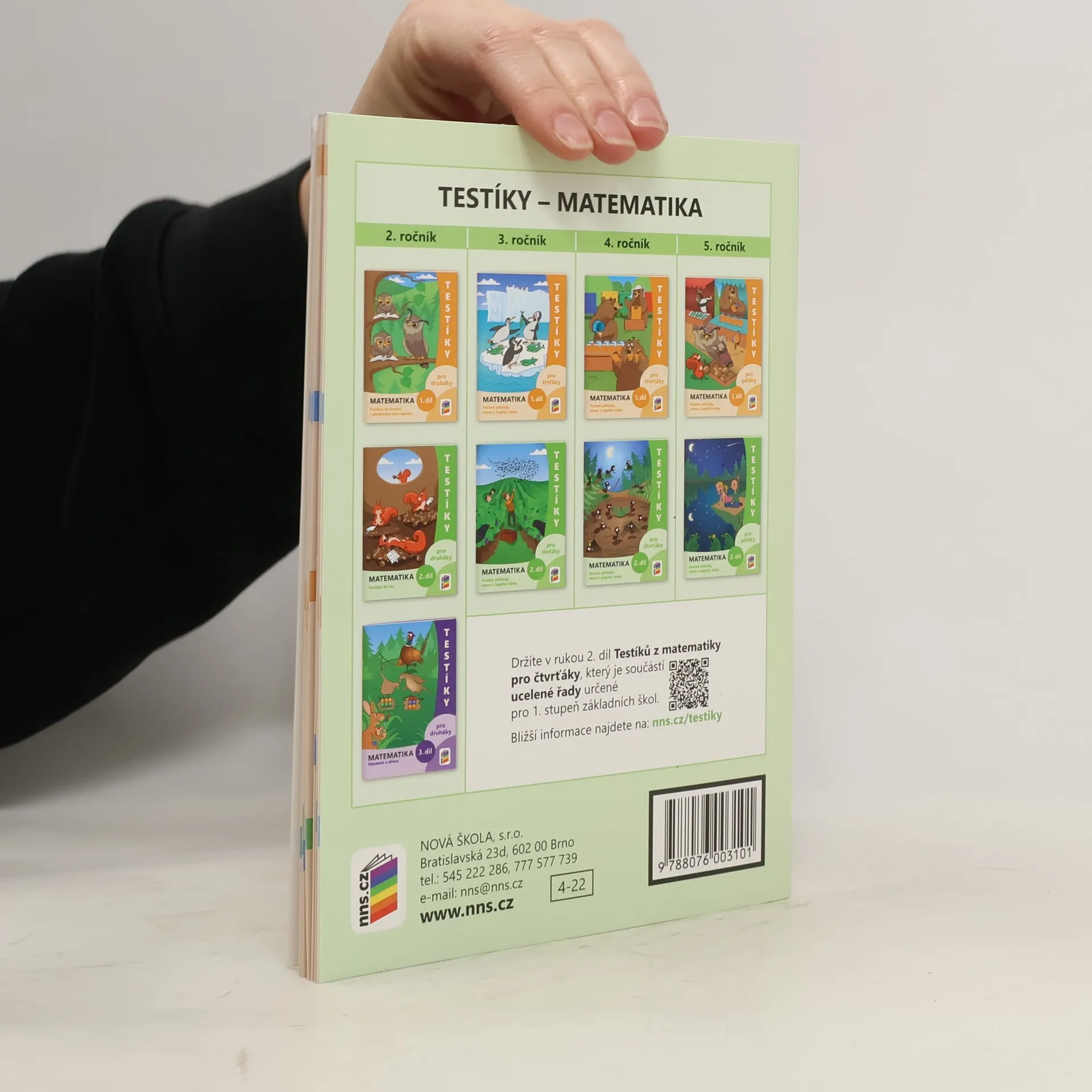 Testíky pro čtvrťáky – matematika, 2. díl (barevný pracovní sešit) Testíky z matematiky jsou součástí ucelené řady určené pro 1. stupeň základních škol. Testíky slouží k procvičování, rozvoji a průběžnému testování dovedností žáků a umožňují rychlé vyhodnocení. Testíky obsahují: • velké množství početních příkladů na rychlé procvičení probíraného učiva • slovní úlohy, ve kterých žáci uplatňují nejen počtářské, ale i čtenářské dovednosti slovní úlohy využívající zadání oživené ilustracemi praktické slovní úlohy zadávané s pomocí fotografií reálných předmětů slovní úlohy zaměřené na finanční gramotnost • logické úkoly, ve kterých žáci dostávají možnost se postupně seznámit s typy cvičení, která se v obtížnějších variantách objevují v různých matematických soutěžích Práci s testíky můžete zařadit dle vlastního uvážení, např.: • jako průběžné procvičení a testování úrovně dovedností všech žáků • pro doplnění výuky pro rychlejší žáky • k domácí práci žáků Pro 2. ročník jsou v matematice určeny tři díly a pro 3., 4. a 5. ročník dva díly Testíků. NNS422