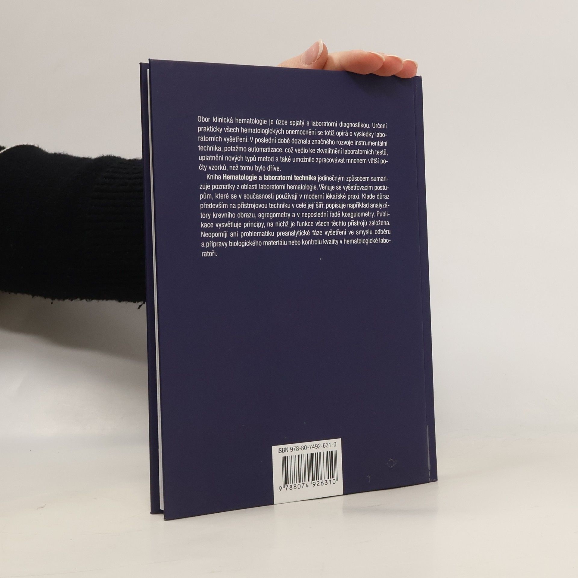 Obor klinická hematologie je úzce spjatý s laboratorní diagnostikou. Určení prakticky všech hematologických onemocnění se totiž opírá o výsledky laboratorních vyšetření. V poslední době doznala značného rozvoje instrumentální technika, potažmo automatizace, což vedlo ke zkvalitnění laboratorních testů, uplatnění nových typů metod a také umožnilo zpracovávat mnohem větší počty vzorků, než tomu bylo dříve. Kniha Hematologie a laboratorní technika jedinečným způsobem sumarizuje poznatky z oblasti laboratorní hematologie. Věnuje se vyšetřovacím postupům, které se v současnosti používají v moderní lékařské praxi. Klade důraz především na přístrojovou techniku v celé její šíři: popisuje například analyzátory krevního obrazu, agregometry a v neposlední řadě koagulometry. Publikace vysvětluje principy, na nichž je funkce všech těchto přístrojů založena. Neopomíjí ani problematiku preanalytické fáze vyšetření ve smyslu odběru a přípravy biologického materiálu nebo kontrolu kvality v hematologické laboratoři.