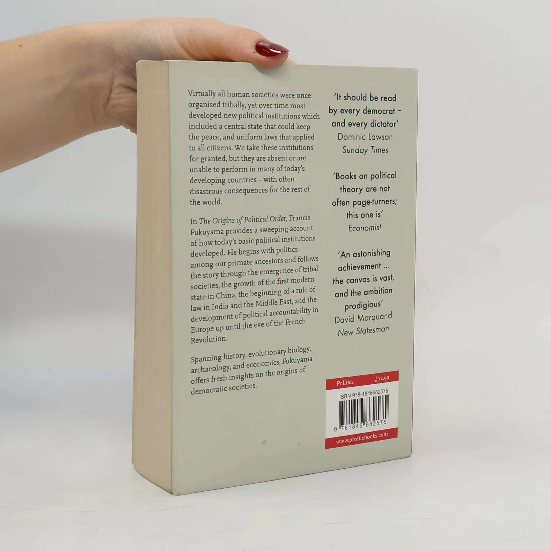 Nations are not trapped by their pasts, but events that happened hundreds or even thousands of years ago continue to exert huge influence on present-day politics. If we are to understand the politics that we now take for granted, we need to understand its origins. Francis Fukuyama examines the paths that different societies have taken to reach their current forms of political order. This book starts with the very beginning of mankind and comes right up to the eve of the French and American revolutions, spanning such diverse disciplines as economics, anthropology and geography. The Origins of Political Order is a magisterial study on the emergence of mankind as a political animal, by one of the most eminent political thinkers writing today.