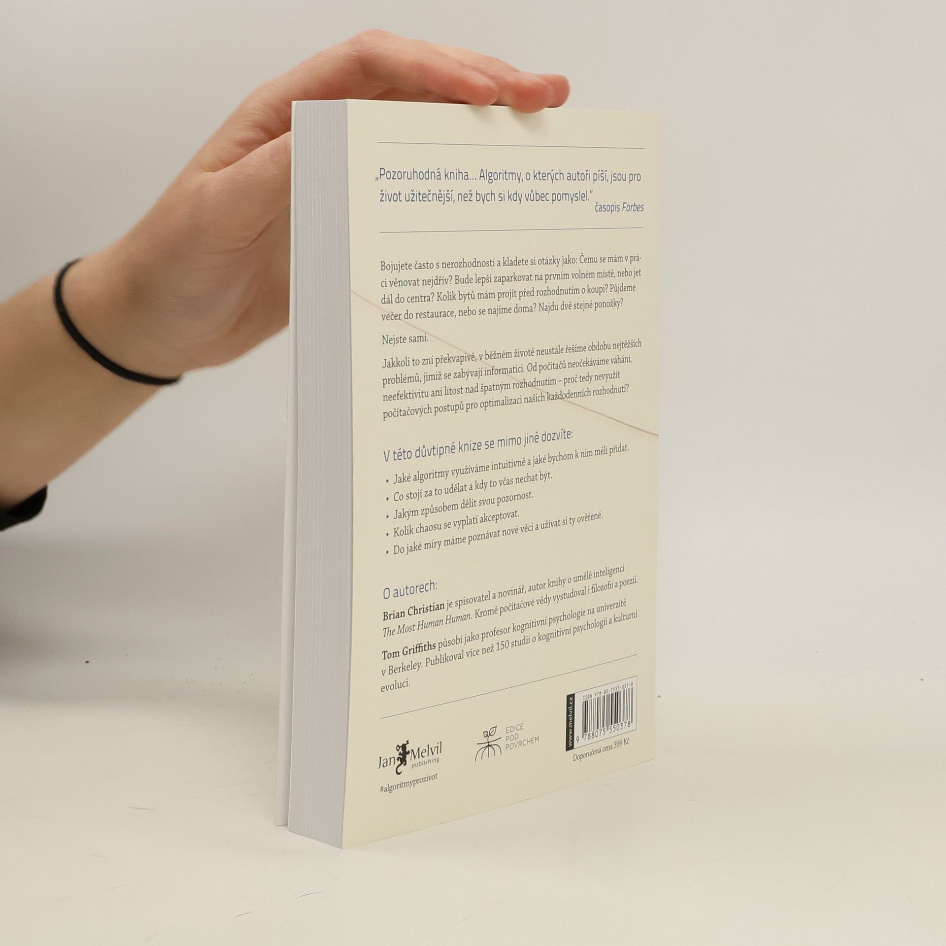 Kniha Algoritmy pro život je strhující pojednání o způsobech využití počítačových algoritmů v každodenním životě. Autoři dokázali proměnit poznatky z oblasti informatiky ve strategie k řešení mnoha problémů v lidském životě — od hledání partnera či partnerky po nalezení parkovacího místa, od řazení obsahu e-mailové schránky po pochopení fungování vlastní paměti. Kniha předkládá řešení rozhodovacích problémů a osvětluje mechanismy lidské mysli. Životy nás všech jsou svázané prostorem a časem, omezeními spjatými s určitou skupinou problémů: Čemu se mám věnovat a na co se naopak vykašlat (dnes, anebo vůbec v životě)? Jak velkou míru chaosu a nepořádku mám ještě přijmout? Jaký poměr mezi novými a oblíbenými činnostmi mě naplňuje nejvíc? Že za vás tato specificky lidská dilemata nemůže vyřešit žádný algoritmus? Omyl! I počítače se potýkají s omezeními a informatici s nimi zápolí již desítky let. Z řešení, která za tu dobu nalezli, se můžeme mnohému přiučit. Uznávaný autor Brian Christian a kognitivní vědec Tom Griffiths v tomto mezioborovém a nečekaném díle ukazují, jak počítačem využívané algoritmy dokážou rozetnout i velice lidské otázky. Vysvětlují, jak zlepšit vlastní intuici a kdy je lepší vše ponechat náhodě, jak se vypořádat s přehršlem možností volby a jak se nejlépe spojit s ostatními.