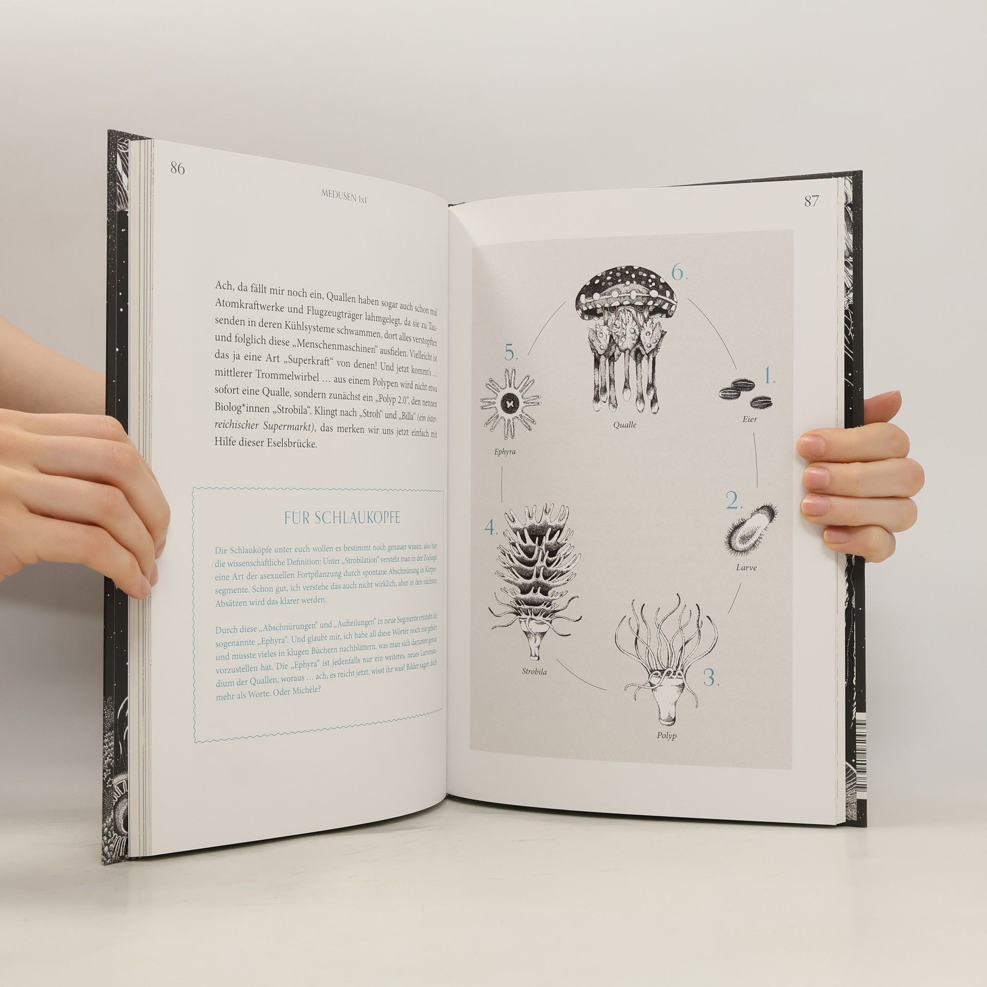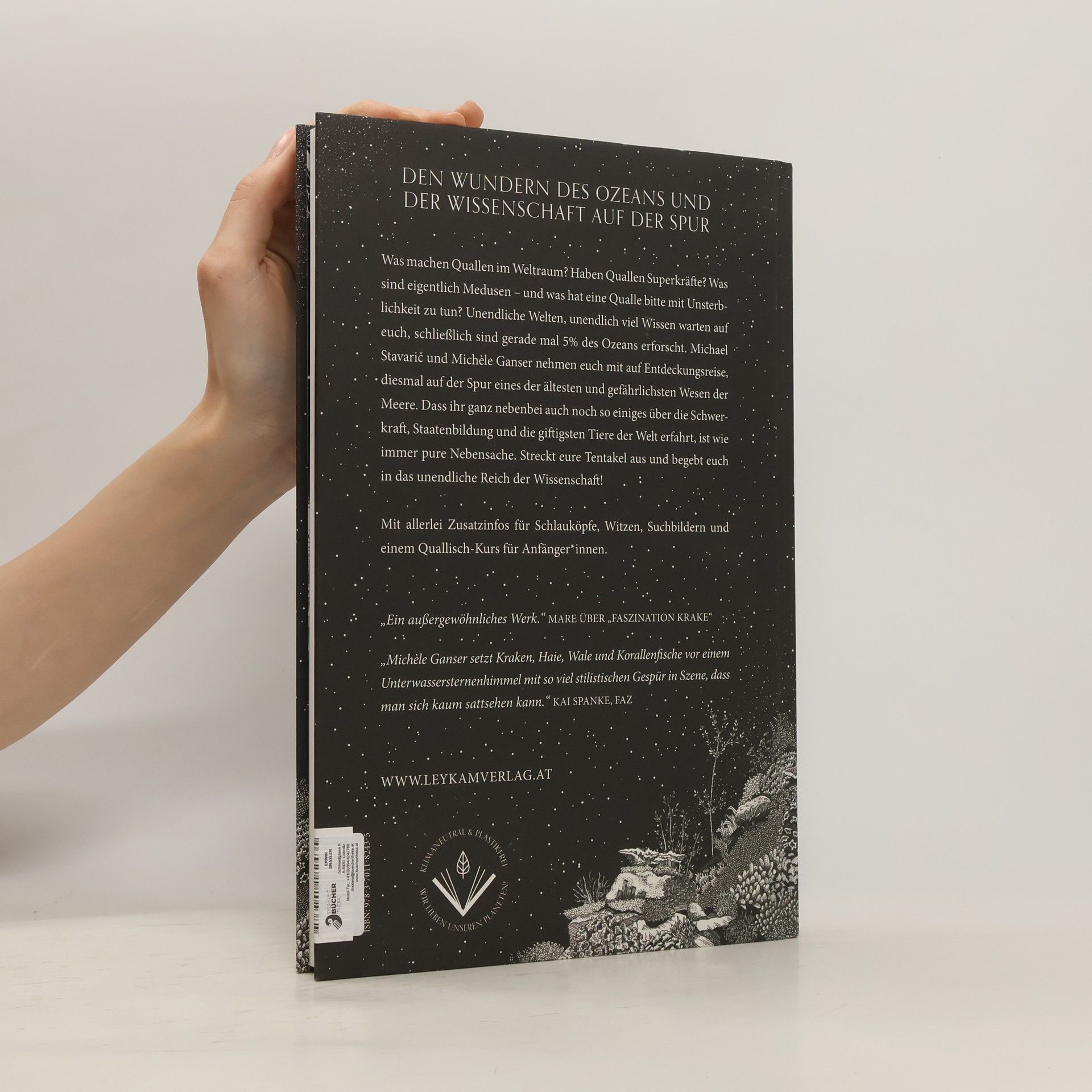 Die geheimnisvolle Welt der Quallen. Ein Buch über die unentdeckten Weiten des Ozeans und die Wunder der Wissenschaft. Mit Suchbildern, Stereogram und einem Quallisch-Kurs für Anfänger:innen. Was machen Quallen im Weltraum? Haben Quallen Superkräfte? Was sind eigentlich Medusen – und was hat eine Qualle bitte mit Unsterblichkeit zu tun? Unendliche Weiten, unendlich viel Wissen warten auf euch, schließlich sind gerade mal 5% des Ozeans erforscht. Michael Stavarič und Michèle Ganser nehmen euch mit auf Entdeckungsreise, diesmal auf der Spur eines der ältesten und gefährlichsten Wesen der Meere. Dass ihr ganz nebenbei euch noch so einiges über die Schwerkraft, Staatenbildung und die giftigsten Tiere der Welt erfahrt, ist wie immer pure Nebensache. Mit allerlei Zusatzinfos für Schlauköpfe, Witzen, Gedichten und Mitmachaufgaben. Streckt eure Tentakel aus und begebt euch in das unendliche Reich der Wissenschaft! Ein Buch zum Staunen, das die Lust an Wissenschaft entfacht: mit Mitmachaufgaben, Witzen und einem Quallisch-Kurs für Anfänger:innen. Den Wundern des Ozeans und noch viel mehr auf der Spur: Band 2 des erfolgreichen und mehrfach prämierten Vorgängers »Faszination Krake«.
