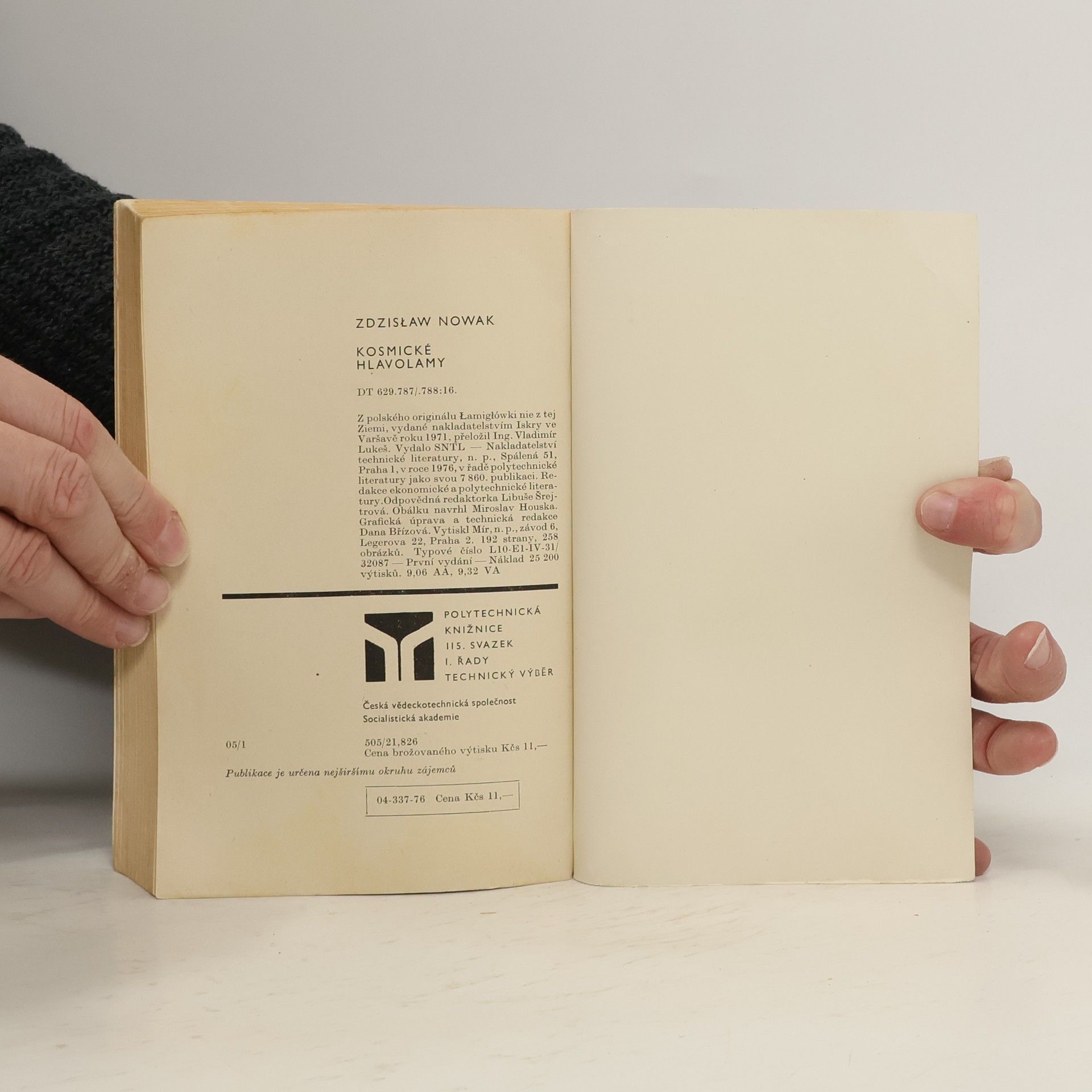 Kdo z nás si v duchu nepoložil otázku, zda by mohl být kosmonautem? V knize je popsáno, které vlastnosti a schopnosti musí mít člověk, aby si byl schopen poradit se situacemi, které nebylo na Zemi možné předvídat. U každé kapitoly jsou uvedeny úkoly a cvičení, které vycházejí z těch, jež se skutečně používají při zkoumání způsobilosti kandidátů pro kosmické lety. Z polského originálu „Łamigłówki nie z tej Ziemi“, vydaného nakladatelstvím „Iskry“ ve Varšavě roku 1971, přeložil Ing. Vladimír Lukeš. Překlad revidovali RNDr. Jiří Mrázek, CSc., Dr. Zdeněk Zizius a Ing. Zdeněk Tichý. 192 stran, 158 obrázků. První vydání.