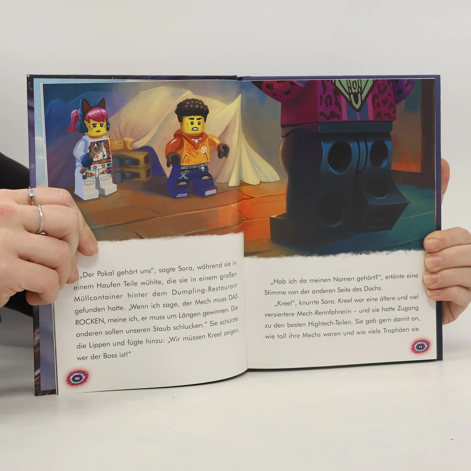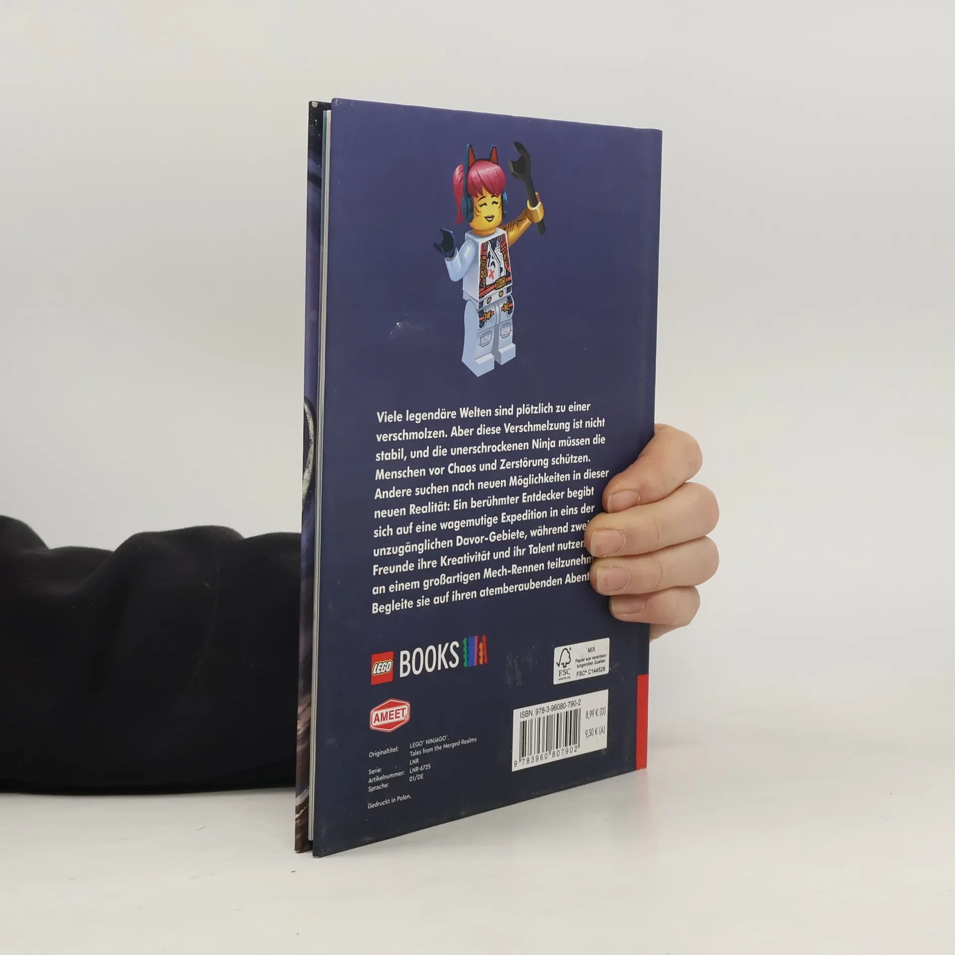 Die Welt von Ninjago steht Kopf Spannendes Lesebuch Treue Ninja-Fans erwarten neue aufregende Geschichten aus dem LEGO® NINJAGO® Universum! Denn eine neue Ninja-Generation wächst heran und muss sich beweisen. Für die tapferen Ninja-Helden ist nichts mehr wie es vorher war: Alle bekannten Reiche sind auf mysteriöse Weise mit der Welt von Ninjago verschmolzen. Das bringt einige Herausforderungen mit sich. Neue wie auch alte Helden müssen nun ihren Weg in der neuen Welt finden. So jagt der Entdecker Kevin Kiesel verschollenen Artefakten hinterher, die durch die Verschmelzung der Reiche wieder aufgetaucht sind. Währenddessen arbeiten die Nachwuchs-Ninja Sora und Arin an einem Mech, mit dem Sora ein Rennen gewinnen will. Lloyd und Kai versuchen, die Risse im Boden, die durch das Erdbeben während der Verschmelzung verursacht wurden, zu versiegeln. Kinder ab 6 Jahren können hier ihre Helden bei drei abgeschlossenen Abenteuern begleiten! Dabei werden die von Hand illustrierten bunten Szenen im Buch die Herzen der Ninja-Fans höherschlagen lassen. LEGO, the LEGO logo, the Brick and Knob configurations, the Minifigure and NINJAGO are trademarks of the LEGO Group. ©2023 The LEGO Group.