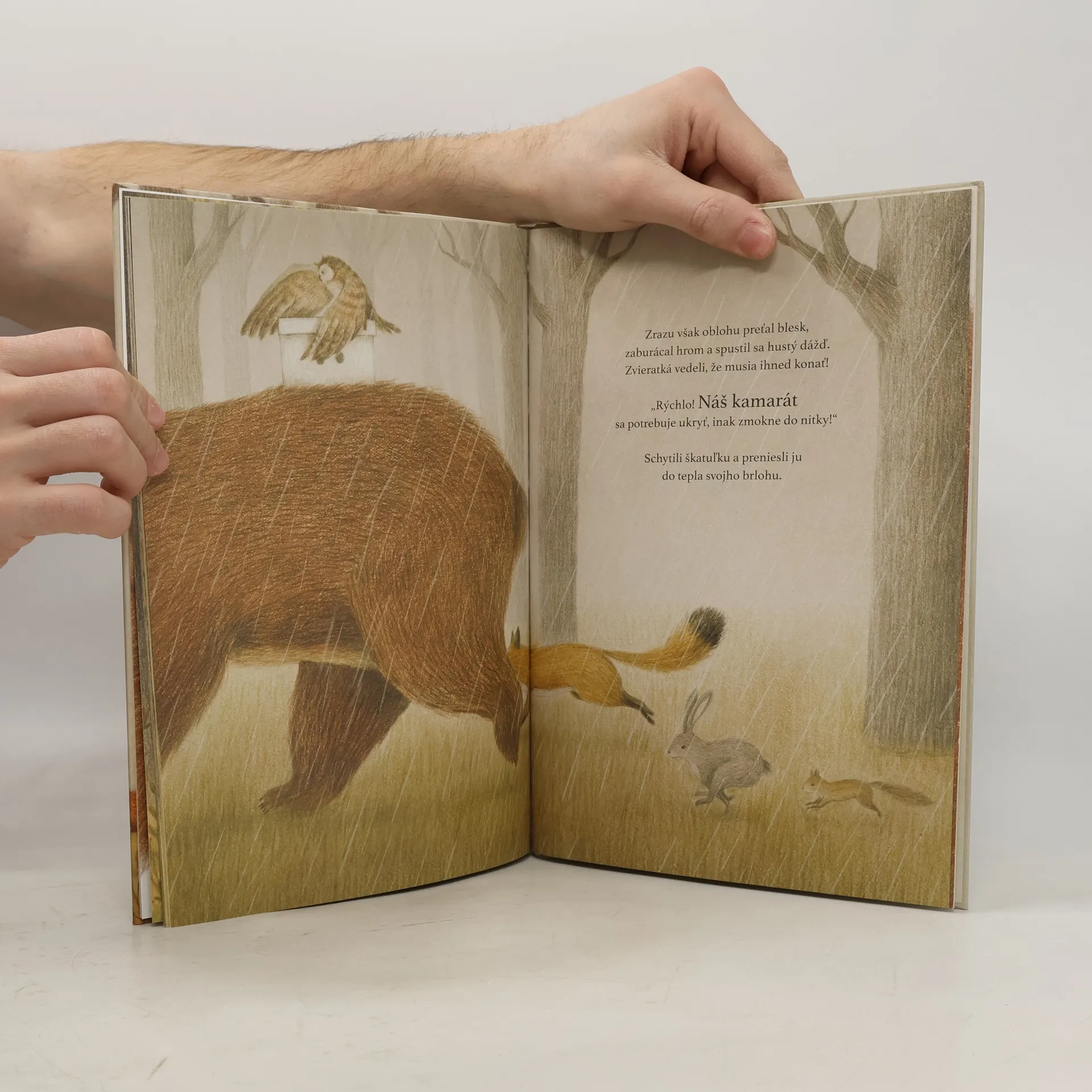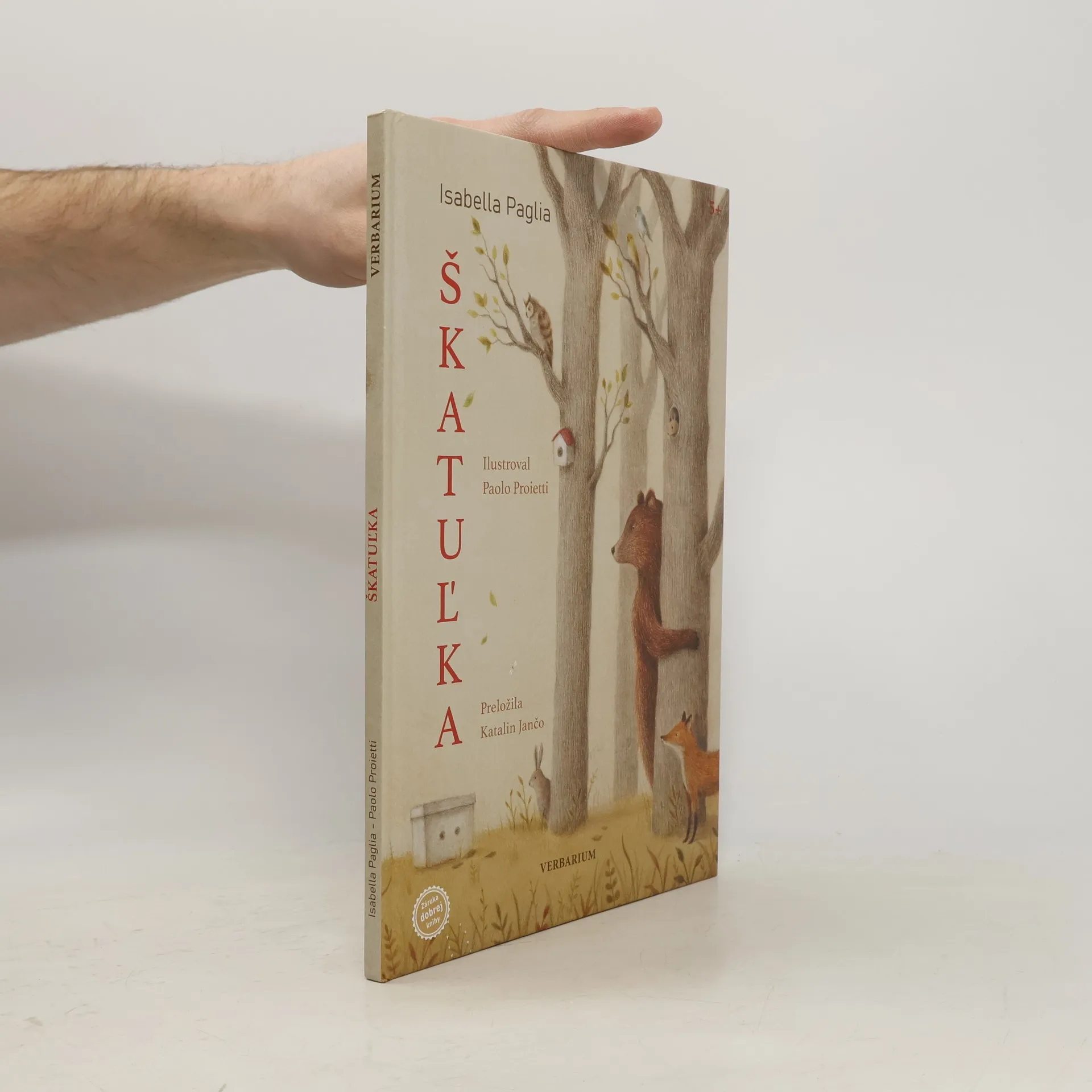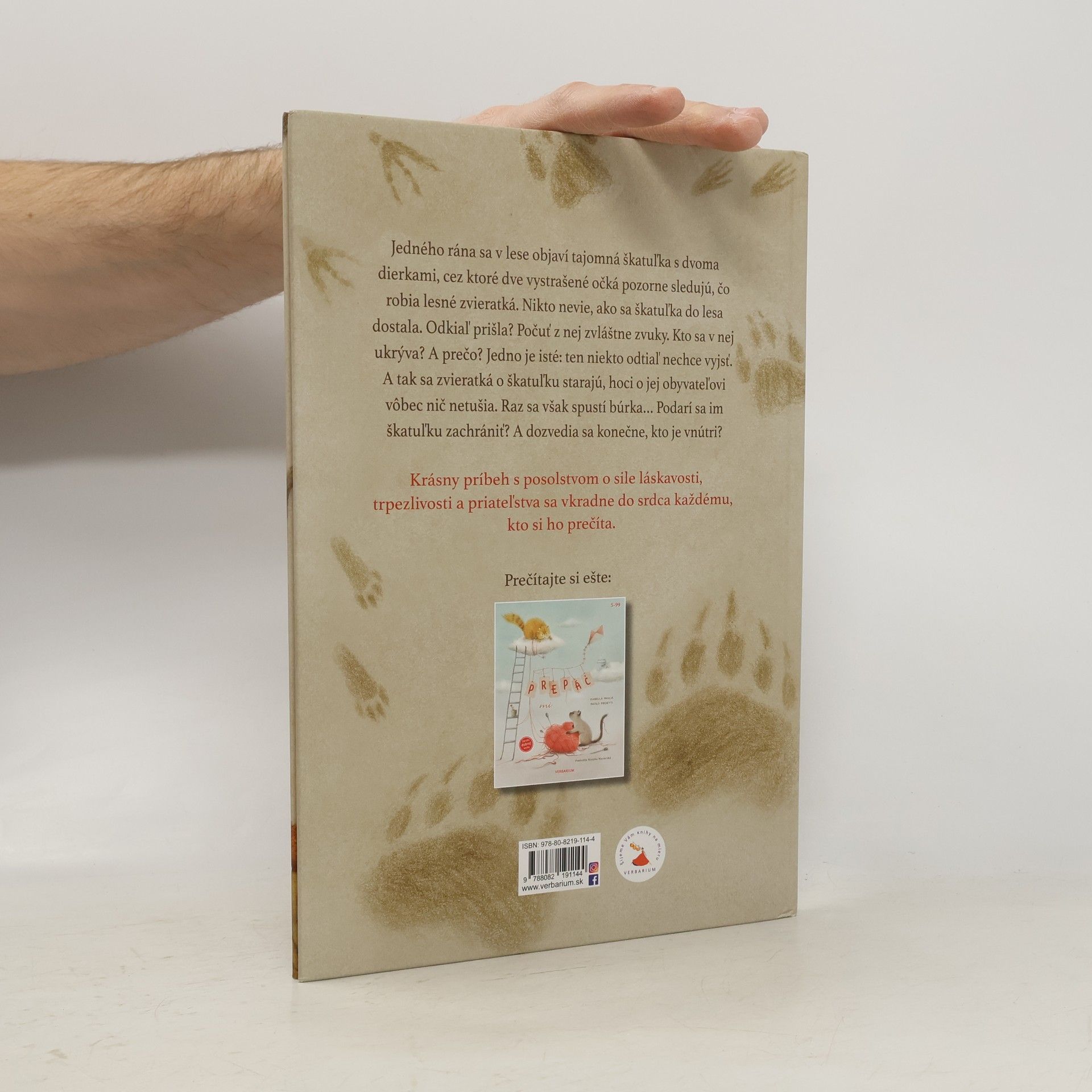 Jedného rána sa v lese objaví tajomná škatuľka s dvoma dierkami, cez ktoré dve vystrašené očká pozorne sledujú, čo robia lesné zvieratká. Nikto nevie, ako sa škatuľka do lesa dostala. Odkiaľ prišla? Počuť z nej zvláštne zvuky. Kto sa v nej ukrýva? A prečo? Jedno je isté: ten niekto odtiaľ nechce vyjsť. A tak sa zvieratká o škatuľku starajú, hoci o jej obyvateľovi vôbec nič netušia. Raz sa však spustí búrka… Podarí sa im škatuľku zachrániť? A dozvedia sa konečne, kto je vnútri? Krásny príbeh s posolstvom o sile láskavosti, trpezlivosti a priateľstva sa vkradne do srdca každému, kto si ho prečíta.