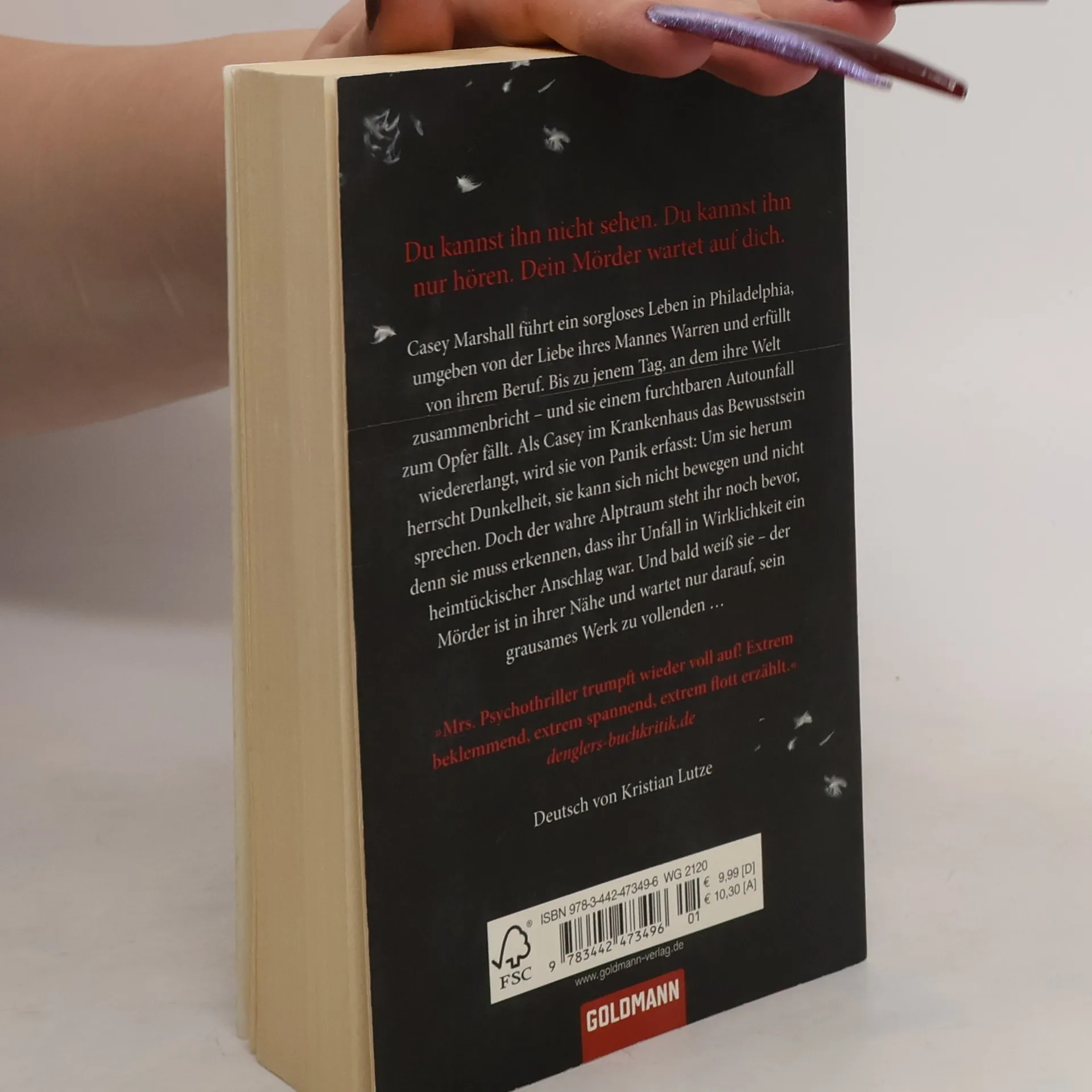 Du kannst ihn nicht sehen. Du kannst ihn nur hören. Dein Mörder wartet auf dich ... Casey Marshall führt ein sorgloses Leben in Philadelphia, umgeben von der Liebe ihres Mannes Warren und erfüllt von ihrem Beruf. Bis zu jenem Tag, an dem ihre Welt zusammenbricht – und sie einem furchtbaren Autounfall zum Opfer fällt. Als Casey im Krankenhaus das Bewusstsein wiedererlangt, wird sie von Panik erfasst: Um sie herum herrscht Dunkelheit, sie kann sich nicht bewegen und nicht sprechen. Doch der wahre Alptraum steht ihr noch bevor, denn sie muss erkennen, dass ihr Unfall in Wirklichkeit ein heimtückischer Anschlag war. Und bald weiß sie – der Mörder ist in ihrer Nähe und wartet nur darauf, sein grausames Werk zu vollenden …