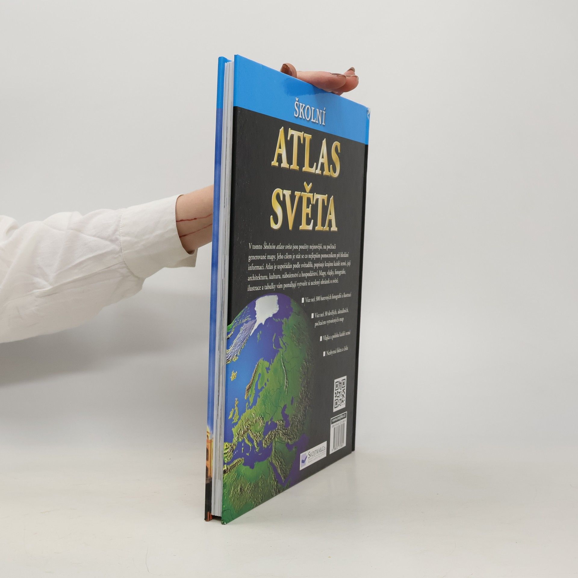 V tomto školním atlase světa jsou použity mapy s cílem stát se co nejnovějším pomocníkem při hledání informací. Atlas je uspořádaný podle světadílů, popisuje krajinu každé země, její architekturu, kulturu, náboženství a hospodářství.