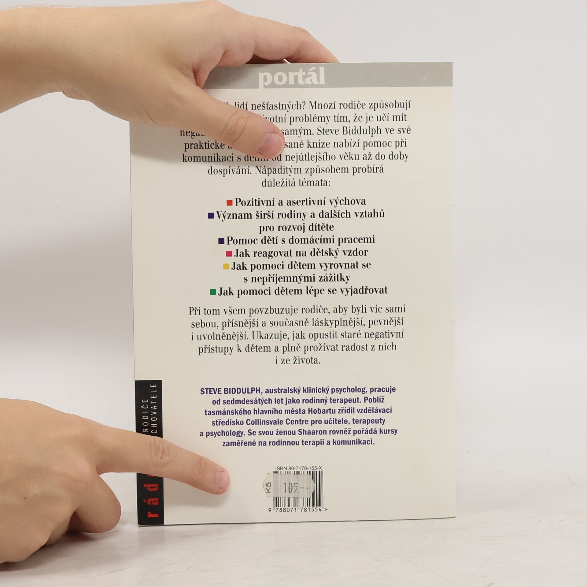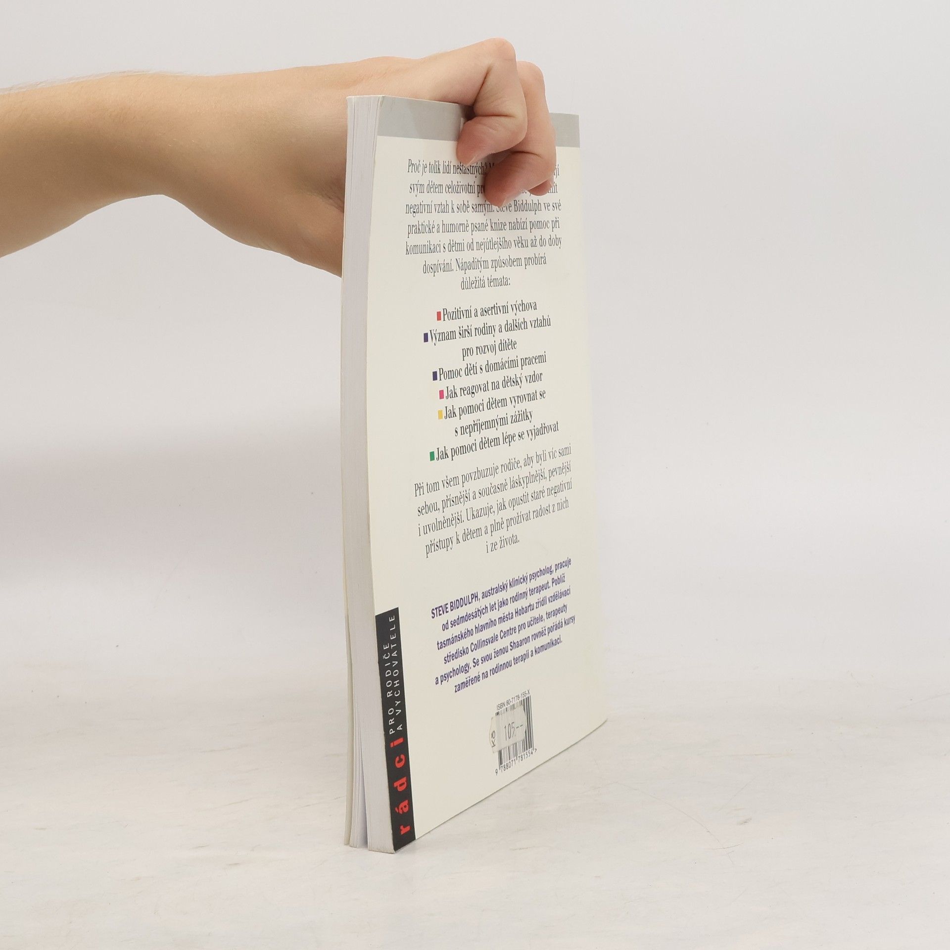 Proč je tolik lidí nešťastných? Mnozí rodiče způsobují svým dětem celoživotní problémy tím, že je učí mít negativní vztah k sobě samým. Steve Biddulph ve své praktické a humorně napsané knize nabízí pomoc při komunikaci s dětmi od nejútlejšího věku až do doby dospívání. Nápaditým způsobem probírá důležitá témata: pozitivní a asertivní výchova, význam širší rodiny a dalších vztahů pro rozvoj dítěte pomoc dětí s domácími prácemi, jak reagovat na dětský vzdor, jak pomoci dětem vyrovnat se s nepříjemnými zážitky, jak pomoci dětem lépe se vyjadřovat. Při tom všem povzbuzuje rodiče, aby byli víc sami sebou, přísnější a současně láskyplnější, pevnější i uvolněnější. Ukazuje, jak opustit staré negativní přístupy k dětem a plně prožívat radost z nich i ze života.