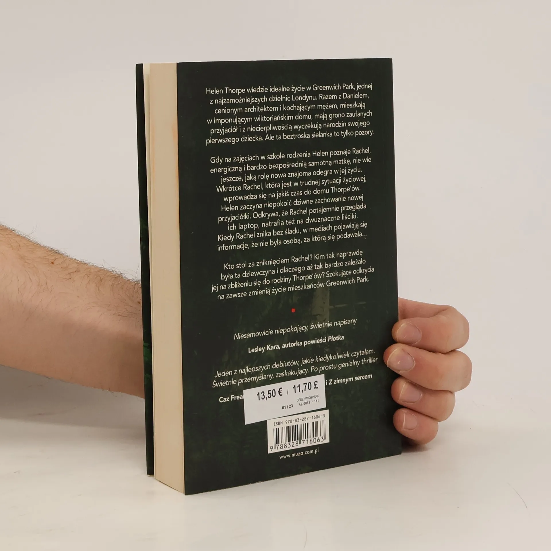 Wciąga, zaskakuje i nie pozwala oderwać się od lektury! To znakomity debiut brytyjskiej dziennikarki śledczej, który zachwyci miłośników thrillerów małżeńskich. Katherine Faulkner bezbłędnie pokazuje, jak kruche jest szczęście budowane na kłamstwie. Helen Thorpe wiedzie idealne życie w Greenwich Park, jednej z najzamożniejszych dzielnic Londynu. Razem z Danielem, cenionym architektem i kochającym mężem, cieszą się z narodzin swojego pierwszego dziecka. Jednak ta beztroska sielanka to tylko pozory. Na zajęciach w szkole rodzenia Helen poznaje Rachel, energiczną samotną matkę, która wprowadza się do ich domu. Helen zaczyna niepokoić dziwne zachowanie nowej przyjaciółki, odkrywając, że Rachel przegląda ich laptop i znajduje dwuznaczne liściki. Kiedy Rachel znika bez śladu, w mediach pojawiają się informacje, że nie była tym, za kogo się podawała. Kto stoi za jej zniknięciem? Kim tak naprawdę była ta dziewczyna i dlaczego pragnęła zbliżyć się do rodziny Thorpe'ów? Szokujące odkrycia na zawsze zmienią życie mieszkańców Greenwich Park. Niesamowicie niepokojący, świetnie napisany thriller, który zaskakuje i intryguje.