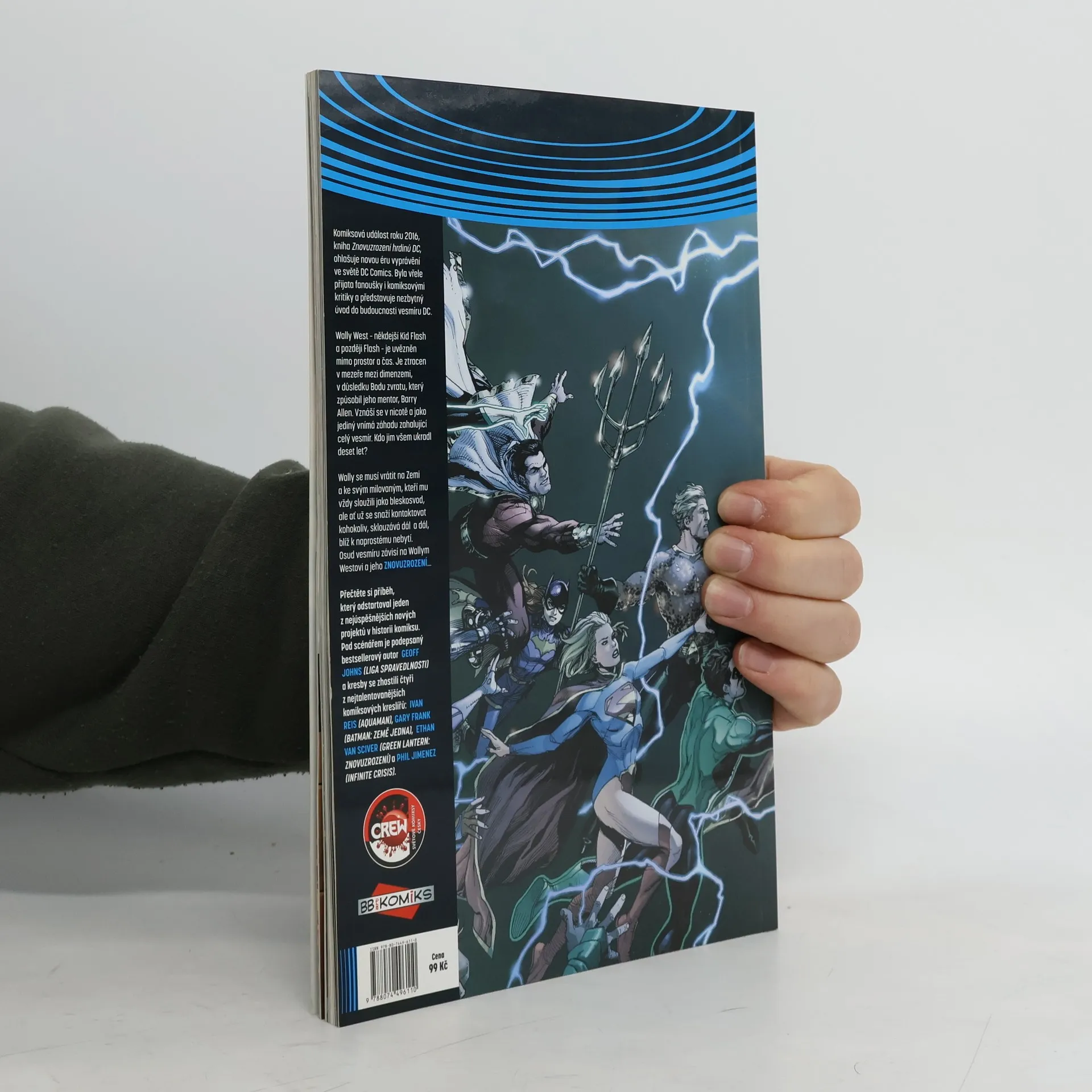 Komiksová událost roku 2016, kniha Znovuzrození hrdinů DC, ohlašuje novou éru vyprávění ve světě DC Comics. Byla vřele přijata fanoušky i komiksovými kritiky a představuje nezbytný úvod do budoucnosti vesmíru DC. Wally West – někdejší Kid Flash a později Flash – je uvězněn mimo prostor a čas. Je ztracen v mezeře mezi dimenzemi, v důsledku Bodu zvratu, který způsobil jeho mentor, Barry Allen. Vznáší se v nicotě a jako jediný vnímá záhadu zasahující celý vesmír. Kdo jim všem ukradl deset let? Wally se musí vrátit na Zemi a ke svým milovaným, kteří mu vždy sloužili jako bleskosvod, ale ať už se snaží kontaktovat kohokoliv, sklouzává dál a dál, blíž k naprostému nebytí. Osud vesmíru závisí na Wallym Westovi a jeho Znovuzrození... Přečtěte si příběh, který odstartoval jeden z nejúspěšnějších nových projektů v historii komiksu. Pod scénářem je podepsaný bestsellerový autor Geoff Johns (Liga spravedlnosti) a kresby se zhostili čtyři z nejtalentovanějších komiksových kreslířů: Ivan Reis (Aquaman), Gary Frank (Batman: Země jedna), Ethan Van Sciver (Green Lantern: Znovuzrození) a Phil Jimenez (Infinite Crisis).