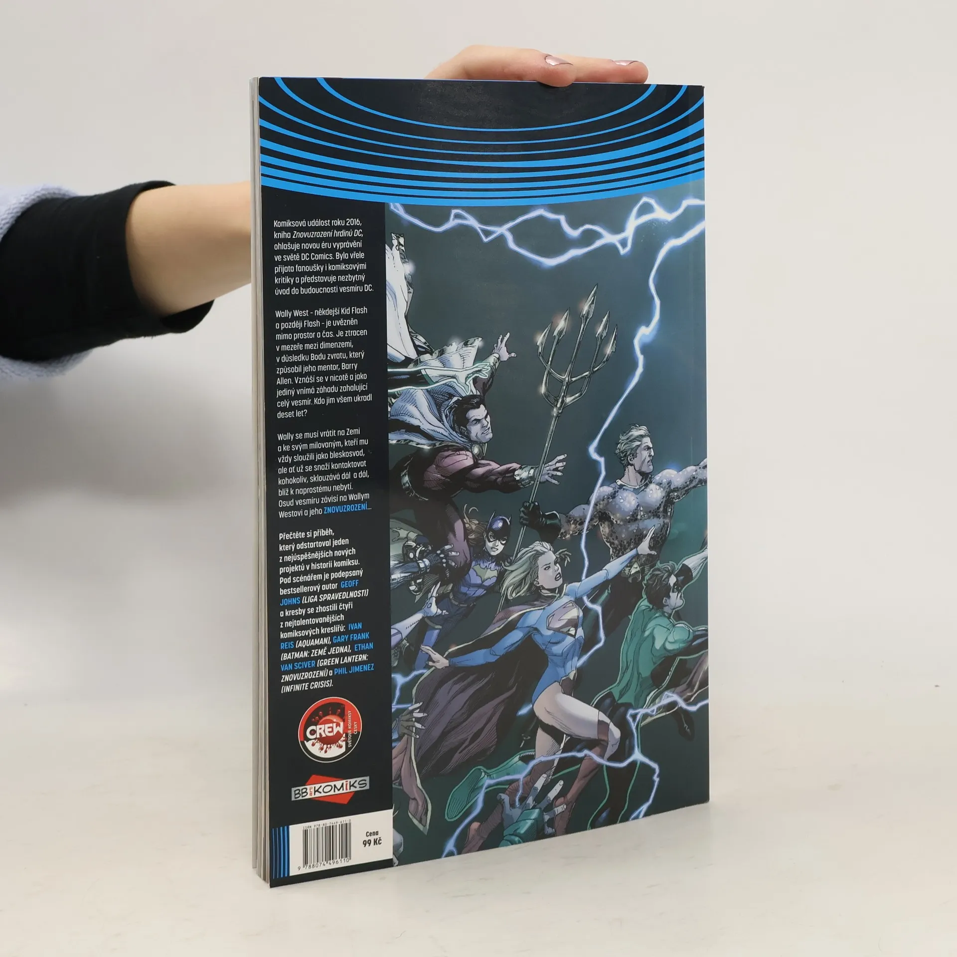 Komiksová událost roku 2016, kniha Znovuzrození hrdinů DC, ohlašuje novou éru vyprávění ve světě DC Comics. Byla vřele přijata fanoušky i komiksovými kritiky a představuje nezbytný úvod do budoucnosti vesmíru DC. Wally West – někdejší Kid Flash a později Flash – je uvězněn mimo prostor a čas. Je ztracen v mezeře mezi dimenzemi, v důsledku Bodu zvratu, který způsobil jeho mentor, Barry Allen. Vznáší se v nicotě a jako jediný vnímá záhadu zasahující celý vesmír. Kdo jim všem ukradl deset let? Wally se musí vrátit na Zemi a ke svým milovaným, kteří mu vždy sloužili jako bleskosvod, ale ať už se snaží kontaktovat kohokoliv, sklouzává dál a dál, blíž k naprostému nebytí. Osud vesmíru závisí na Wallym Westovi a jeho Znovuzrození... Přečtěte si příběh, který odstartoval jeden z nejúspěšnějších nových projektů v historii komiksu. Pod scénářem je podepsaný bestsellerový autor Geoff Johns (Liga spravedlnosti) a kresby se zhostili čtyři z nejtalentovanějších komiksových kreslířů: Ivan Reis (Aquaman), Gary Frank (Batman: Země jedna), Ethan Van Sciver (Green Lantern: Znovuzrození) a Phil Jimenez (Infinite Crisis).