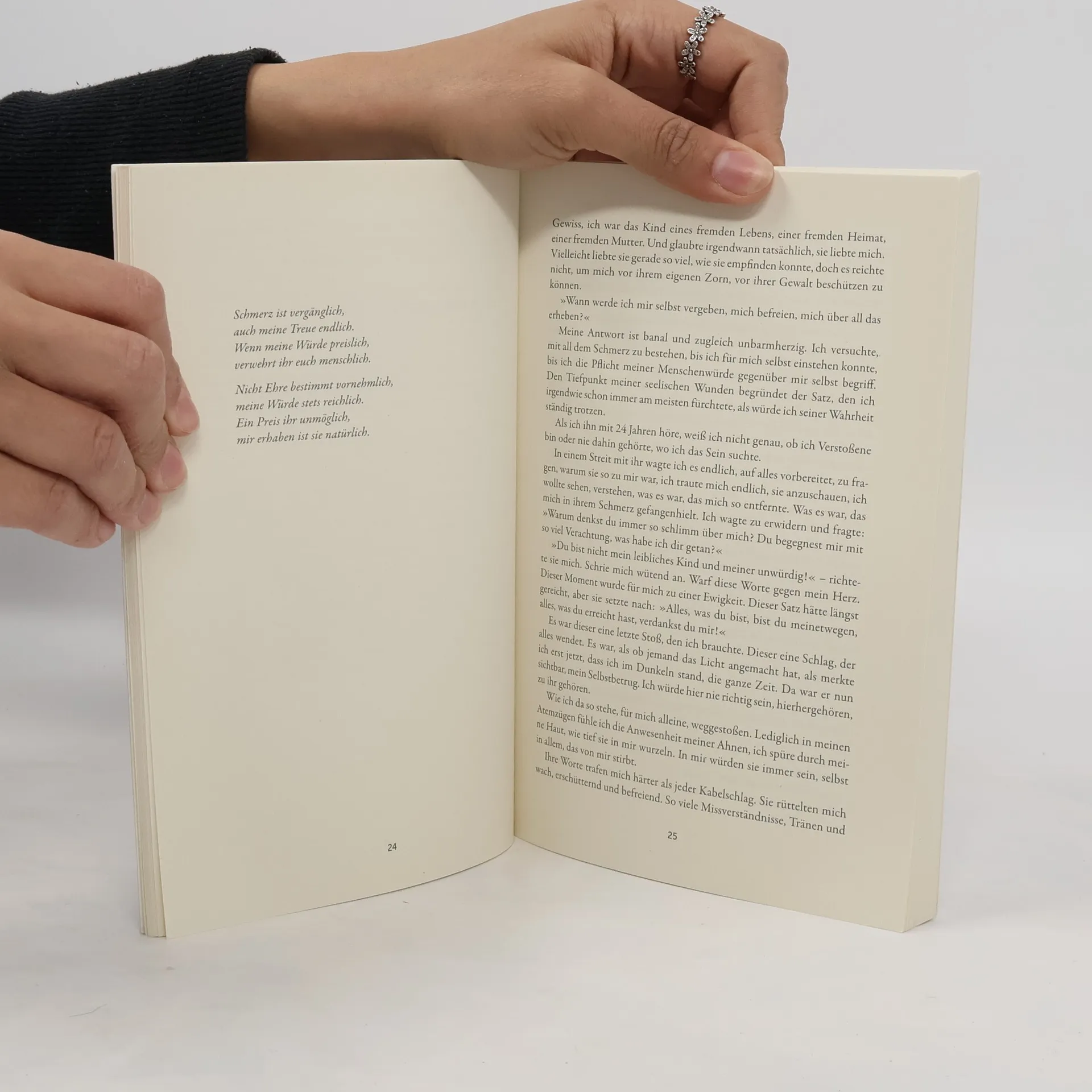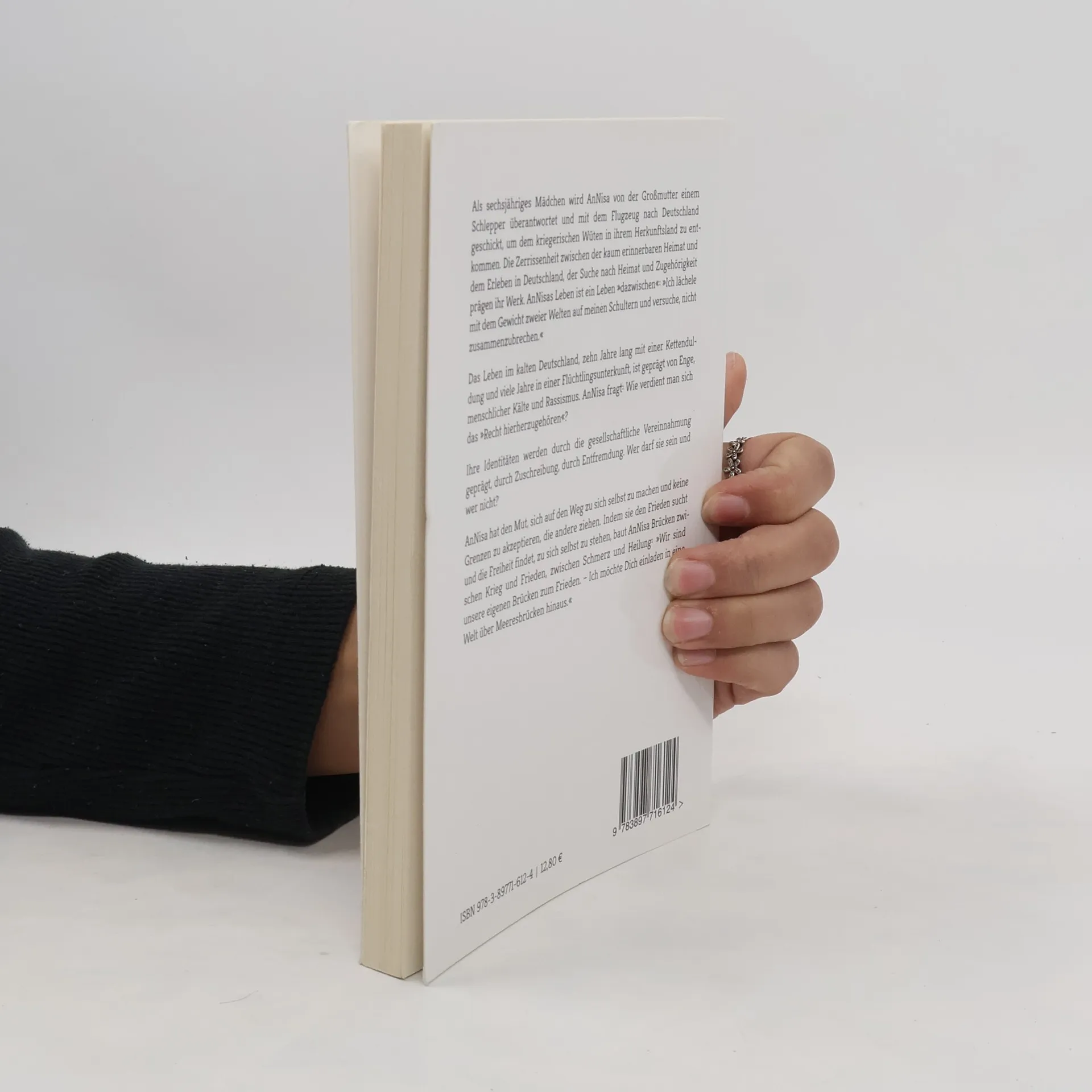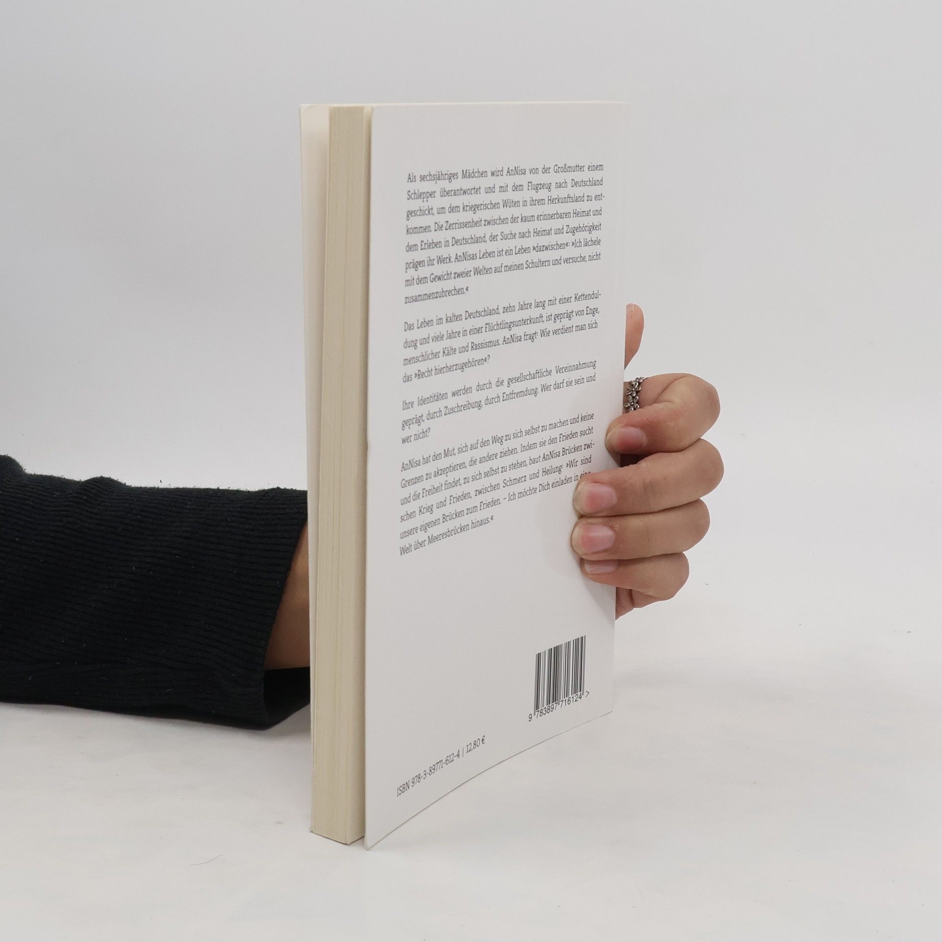 Als sechsjähriges Mädchen wird AnNisa von der Großmutter einem Schlepper überantwortet und mit dem Flugzeug nach Deutschland geschickt, um dem kriegerischen Wüten in ihrem Herkunftsland zu entkommen. Die Zerrissenheit zwischen der kaum erinnerbaren Heimat und dem Erleben in Deutschland, der Suche nach Heimat und Zugehörigkeit prägen ihr Werk. AnNisas Leben ist ein Leben »dazwischen«: »Ich lächele mit dem Gewicht zweier Welten auf meinen Schultern und versuche, nicht zusammenzubrechen.« Das Leben im kalten Deutschland, zehn Jahre lang mit einer Kettenduldung und viele Jahre in einer Flüchtlingsunterkunft, ist geprägt von Enge, menschlicher Kälte und Rassismus. AnNisa fragt: Wie verdient man sich das »Recht hierherzugehören«? Ihre Identitäten werden durch die gesellschaftliche Vereinnahmung geprägt, durch Zuschreibung, durch Entfremdung. Wer darf sie sein und wer nicht? AnNisa hat den Mut, sich auf den Weg zu sich selbst zu machen und keine Grenzen zu akzeptieren, die andere ziehen. Indem sie den Frieden sucht und die Freiheit findet, zu sich selbst zu stehen, baut AnNisa Brücken zwischen Krieg und Frieden, zwischen Schmerz und Heilung: »Wir sind unsere eigenen Brücken zum Frieden. – Ich möchte Dich einladen in eine Welt über Meeresbrücken hinaus.«
