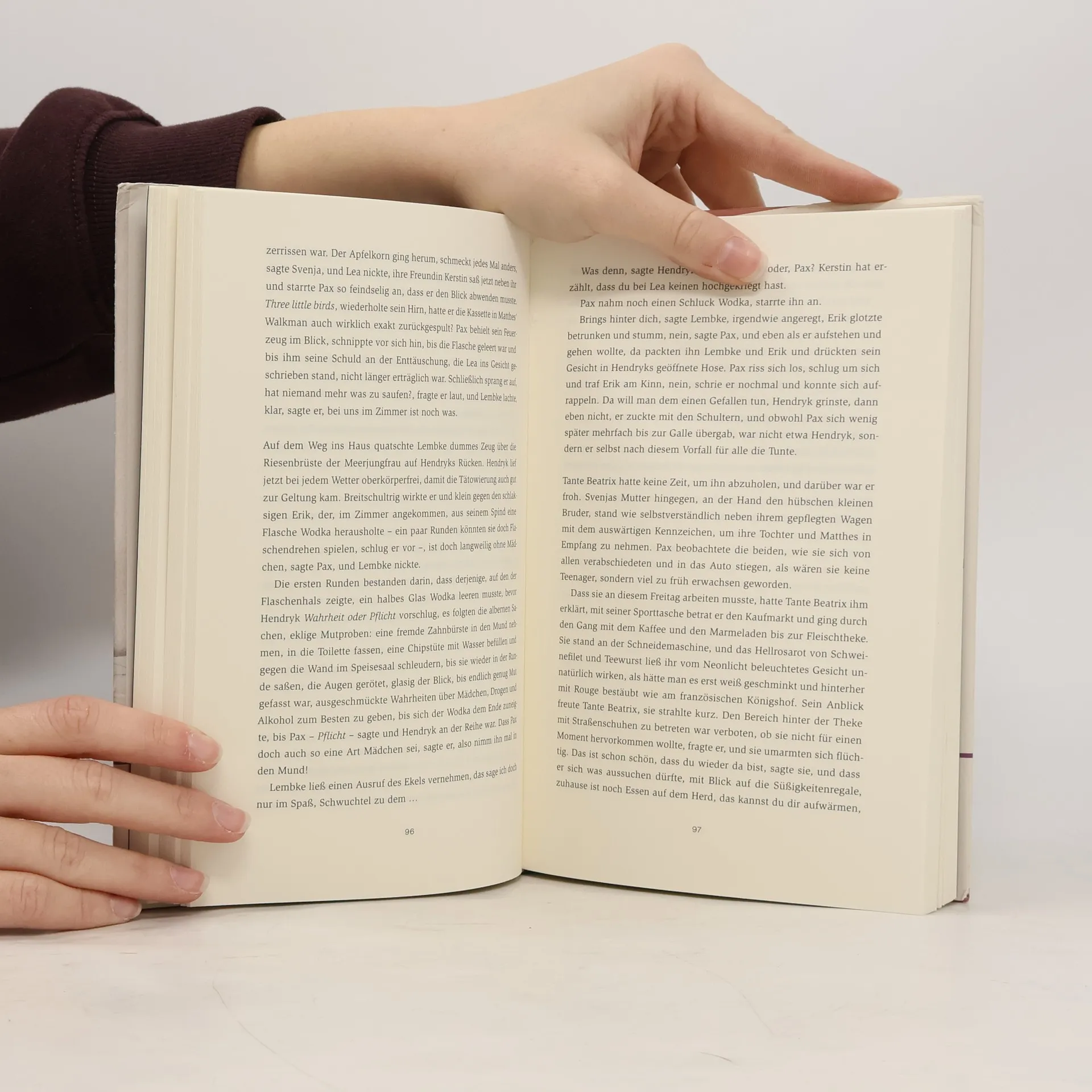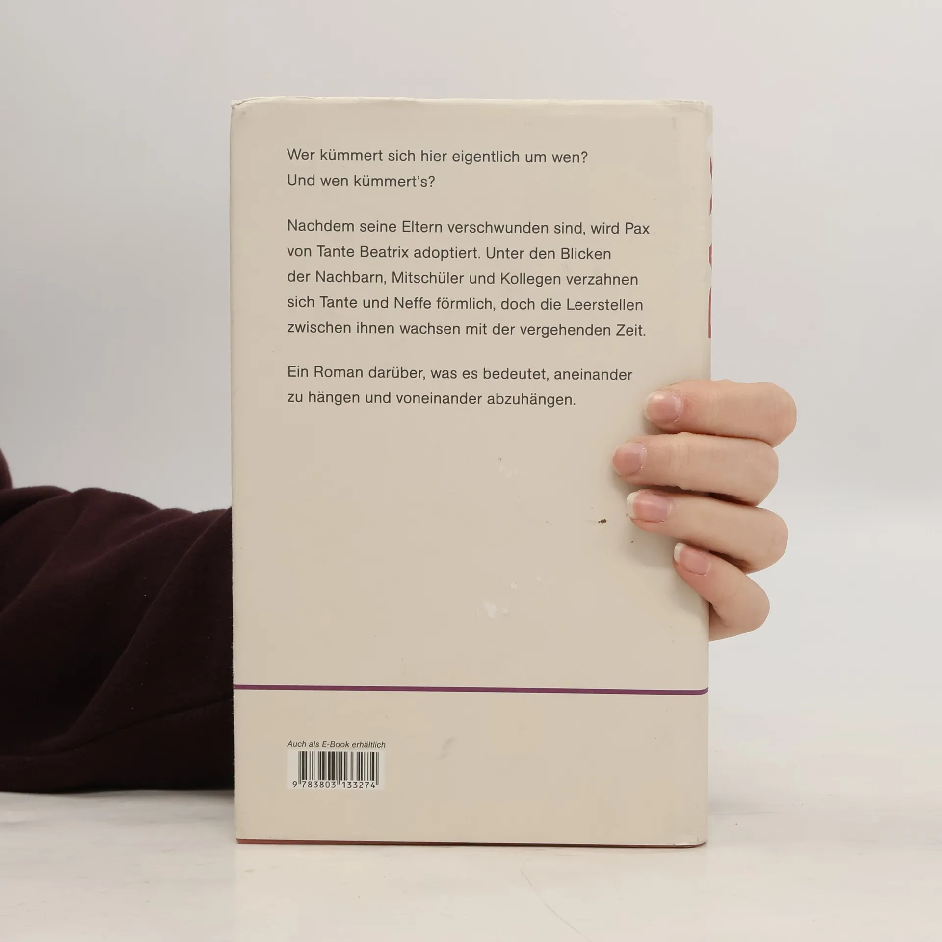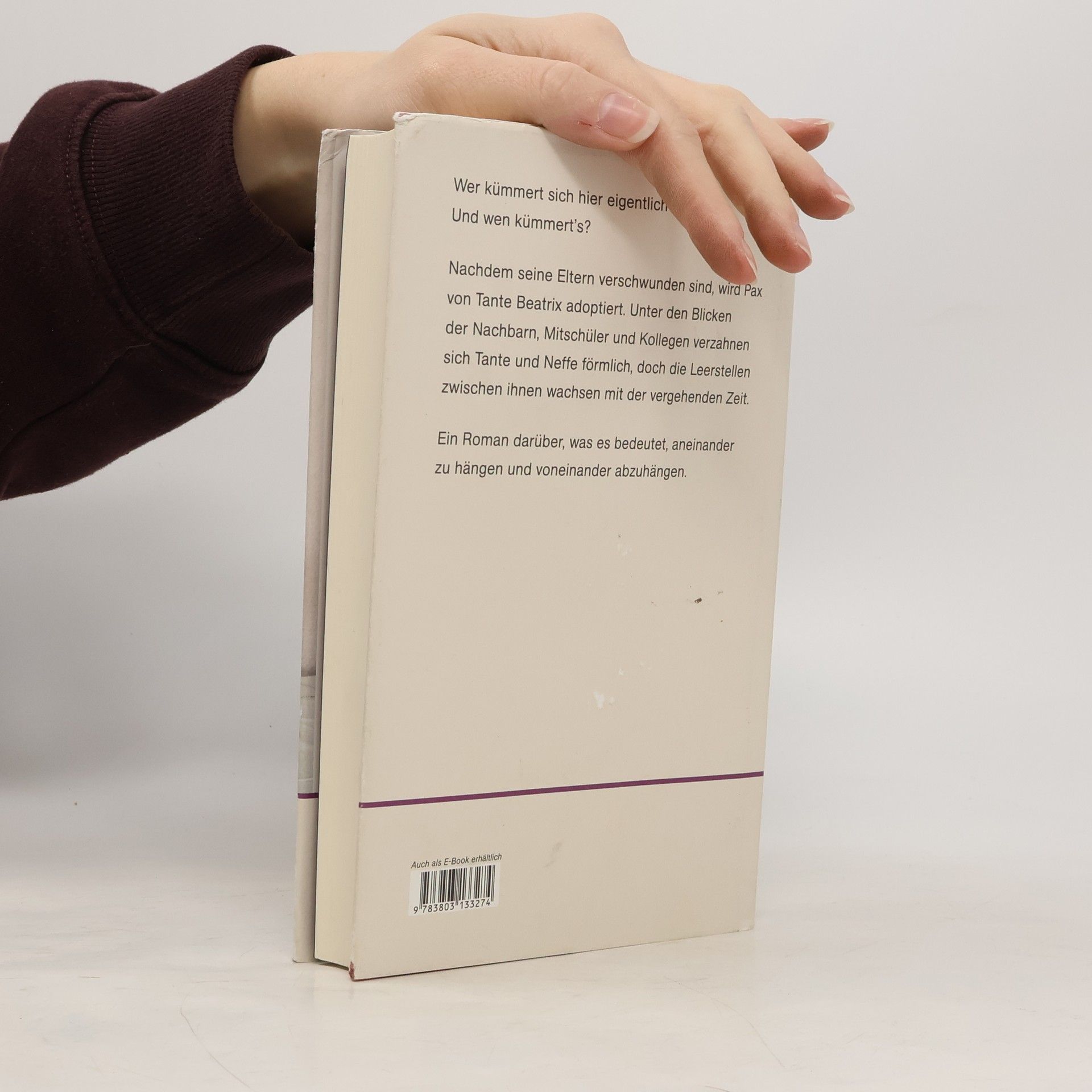 Was es bedeutet, aneinander zu hängen und voneinander abzuhängen: Nachdem seine Eltern verschwunden sind, wird Pax von Tante Beatrix adoptiert. Unter den Blicken der Nachbarn, Mitschüler und Kollegen verzahnen sich Tante und Neffe förmlich, doch die Leerstellen zwischen ihnen wachsen mit der vergehenden Zeit.Pax wächst in einer Kleinstadt auf. An seine Eltern und den großen Bruder hat er keine Erinnerungen, sie sind von einer Afrikareise nicht zurückgekehrt. Tante Beatrix, seltsam altjüngferlich und einigermaßen verklemmt, arbeitet als Verkäuferin im örtlichen Kaufmarkt und zieht Pax groß, so gut sie eben kann.Dessen Kindheit und Jugend verlaufen zunächst ganz gewöhnlich provinziell. Sie ernährt und erzieht ihn, er sorgt dafür, dass er ihr keine Sorgen macht, und deckt sie zu, wenn sie vor dem Fernseher einschläft. Manchmal träumt er von einer echten Familie, er hat einen Kanarienvogel, eine beste Freundin Leni und außerdem, das wird ihm allmählich klar, etwas, wovon die anderen lieber nichts wissen sollten.Pax lernt früh, sich zu schämen, für alles und nichts, sich zu verstellen, um es anderen recht zu machen. Er will weg, kann aber Tante Beatrix nicht alleinlassen.Eva Roman erzählt sensibel und in fast greifbaren Bildern mit sehr genauem Blick fürs Detail. Ihr Roman handelt in vielen Facetten von Sorge und Fürsorge, von Generationenverantwortung und sozialer Normierung.