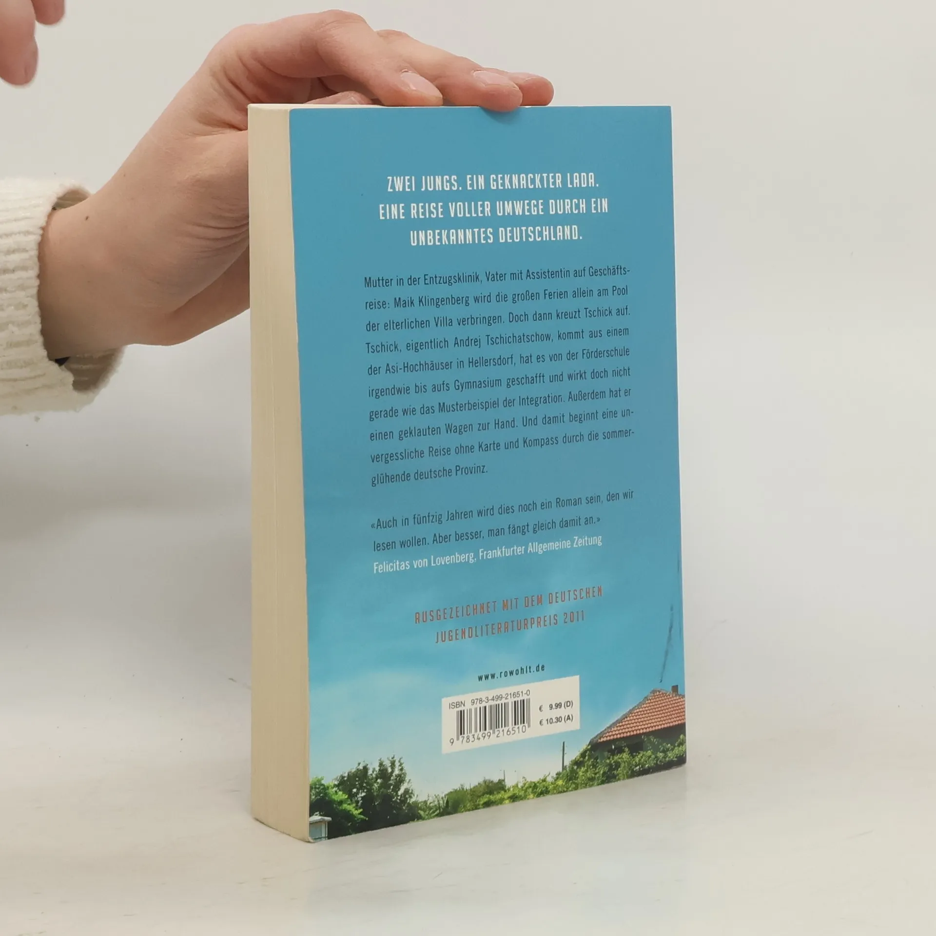 Zwei Jungs. Ein geknackter Lada. Eine Reise voller Umwege durch ein unbekanntes Deutschland.Mutter in der Entzugsklinik, Vater mit Assistentin auf Geschäftsreise: Maik Klingenberg wird die großen Ferien allein am Pool der elterlichen Villa verbringen. Doch dann kreuzt Tschick auf. Tschick, eigentlich Andrej Tschichatschow, kommt aus einem der Asi-Hochhäuser in Hellersdorf, hat es von der Förderschule irgendwie bis aufs Gymnasium geschafft und wirkt doch nicht gerade wie das Musterbeispiel der Integration. Außerdem hat er einen geklauten Wagen zur Hand. Und damit beginnt eine unvergessliche Reise ohne Karte und Kompass durch die sommerglühende deutsche Provinz.«Auch in fünfzig Jahren wird dies noch ein Roman sein, den wir lesen wollen. Aber besser, man fängt gleich damit an.» Felicitas von Lovenberg, Frankfurter Allgemeine ZeitungAusgezeichnet mit dem Deutschen Jugendliteraturpreis 2011