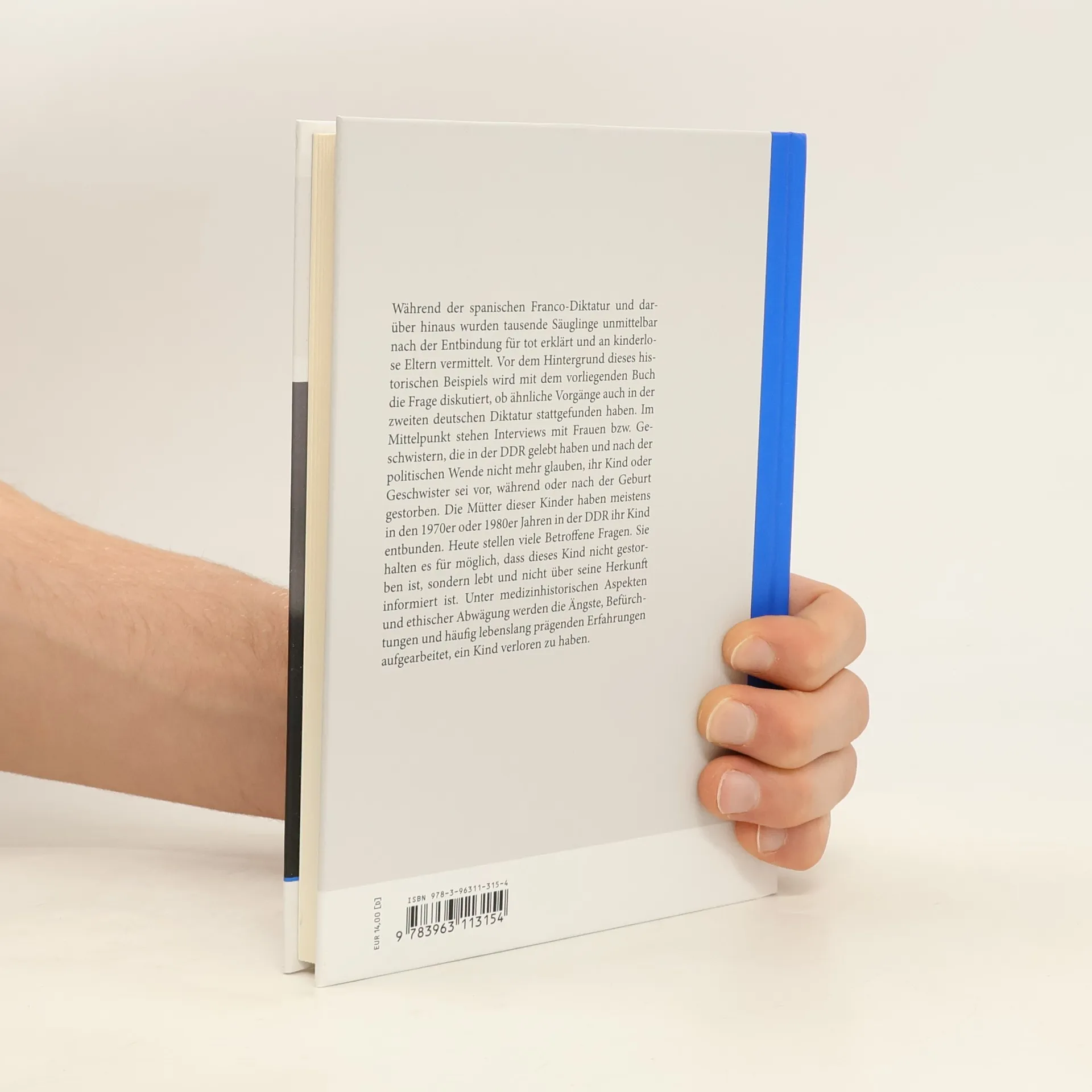 "Während der spanischen Franco-Diktatur und darüber hinaus wurden tausende Säuglinge unmittelbar nach der Entbindung für tot erklärt und an kinderlose Eltern vermittelt. Vor dem Hintergrund dieses historischen Beispiels wird mit dem vorliegenden Buch die Frage diskutiert, ob ähnliche Vorgänge auch in der zweiten deutschen Diktatur stattgefunden haben. Im Mittelpunkt stehen Interviews mit Frauen bzw. Geschwistern, die in der DDR gelebt haben und nach der politischen Wende nicht mehr glauben, ihr Kind oder Geschwister sei vor, während oder nach der Geburt gestorben. Die Mütter dieser Kinder haben meistens in den 1970er oder 1980er Jahren in der DDR ihr Kind entbunden. Heute stellen viele Betroffene Fragen. Sie halten es für möglich, dass dieses Kind nicht gestorben ist, sondern lebt und nicht über seine Herkunft informiert ist. Unter medizinhistorischen Aspekten und ethischer Abwägung werden die Ängste, Befürchtungen und häufig lebenslang prägenden Erfahrungen aufgearbeitet, ein Kind verloren zu haben."--Back cover