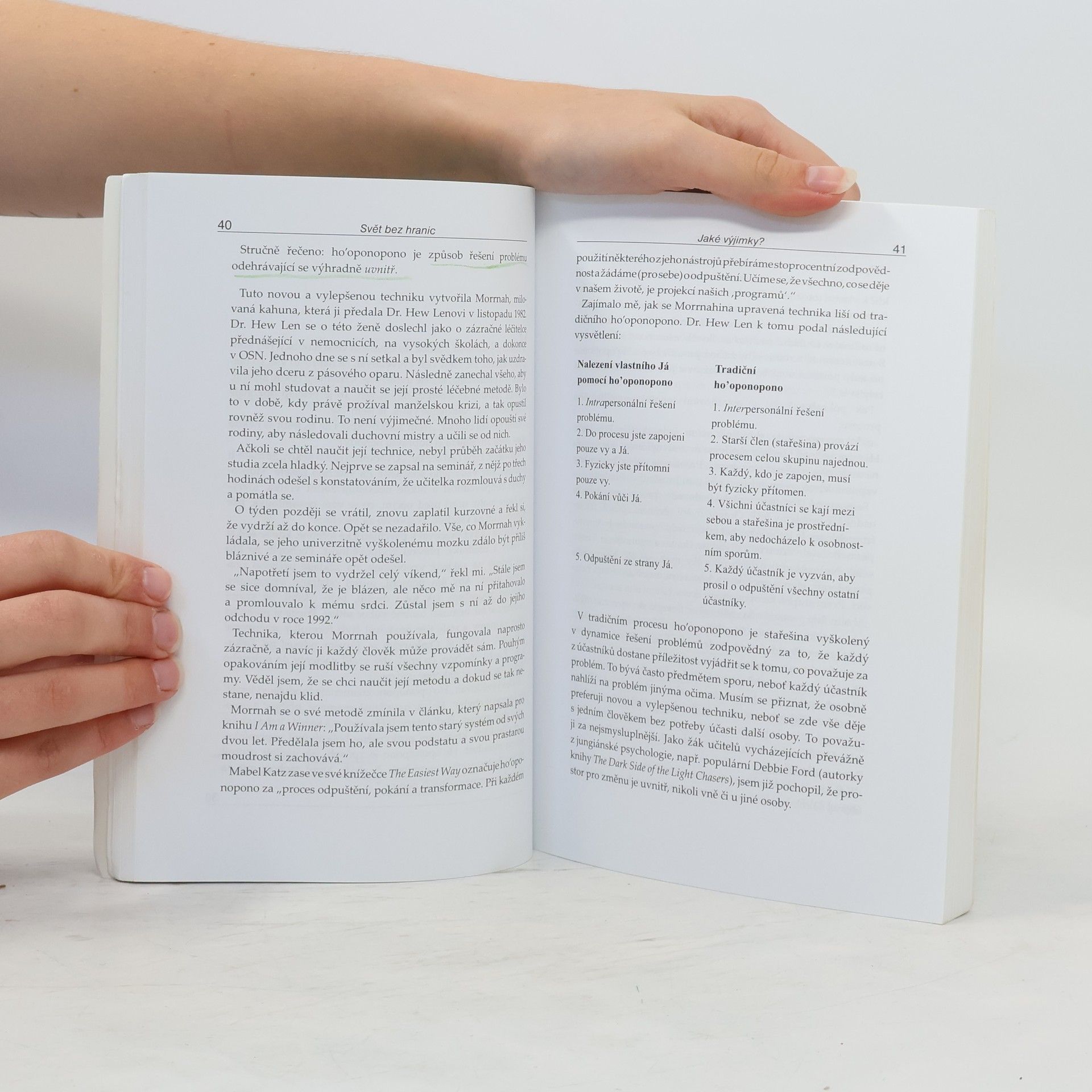 Joe Vitale, autor světového bestselleru Síla přitažlivosti, ve své další knize Svět bez hranic vypráví neobyčejný příběh Dr. Ihaleakala Hew Lena, terapeuta, který vyléčil celé oddělení mentálně postižených recidivistů, aniž by kteréhokoliv z nich viděl. Kniha popisuje jeho metodu. Popisuje skutečnou příčinu všeho, co se vám přihodí a jak "očistit" negativitu, abyste se mohli znovu spojit s Božskou podstatou. "Dr. Hew Len mi vysvětlil, že přijmout absolutní zodpovědnost za svůj život, tedy za vše, co se v mém životě objeví, znamená uznat, že vše kolem mne je mým vlastním výtvorem." Vím, že to je obtížné to pochopit, natož to přijmout nebo podle toho opravdu žít. Vinit druhé nebo své okolí je mnohem snažší, než přijmout naprostou zodpovědnost. Během rozhovoru s Hew Lenem jsem začal chápat, že léčení z jeho pohledu a v duchu ho'oponopono znamená milovat sám sebe. Chcete-li zlepšit svůj život, musíte jej vyléčit. Chcete-li někoho uzdravit, a může jít klidně o mentálně chorého vězně, musíte nejprve vyléčit sebe." Joe Vitale Kniha Svět bez hranic je jednou z nejúchvatnějších knih, která kdy vůbec byla napsána.