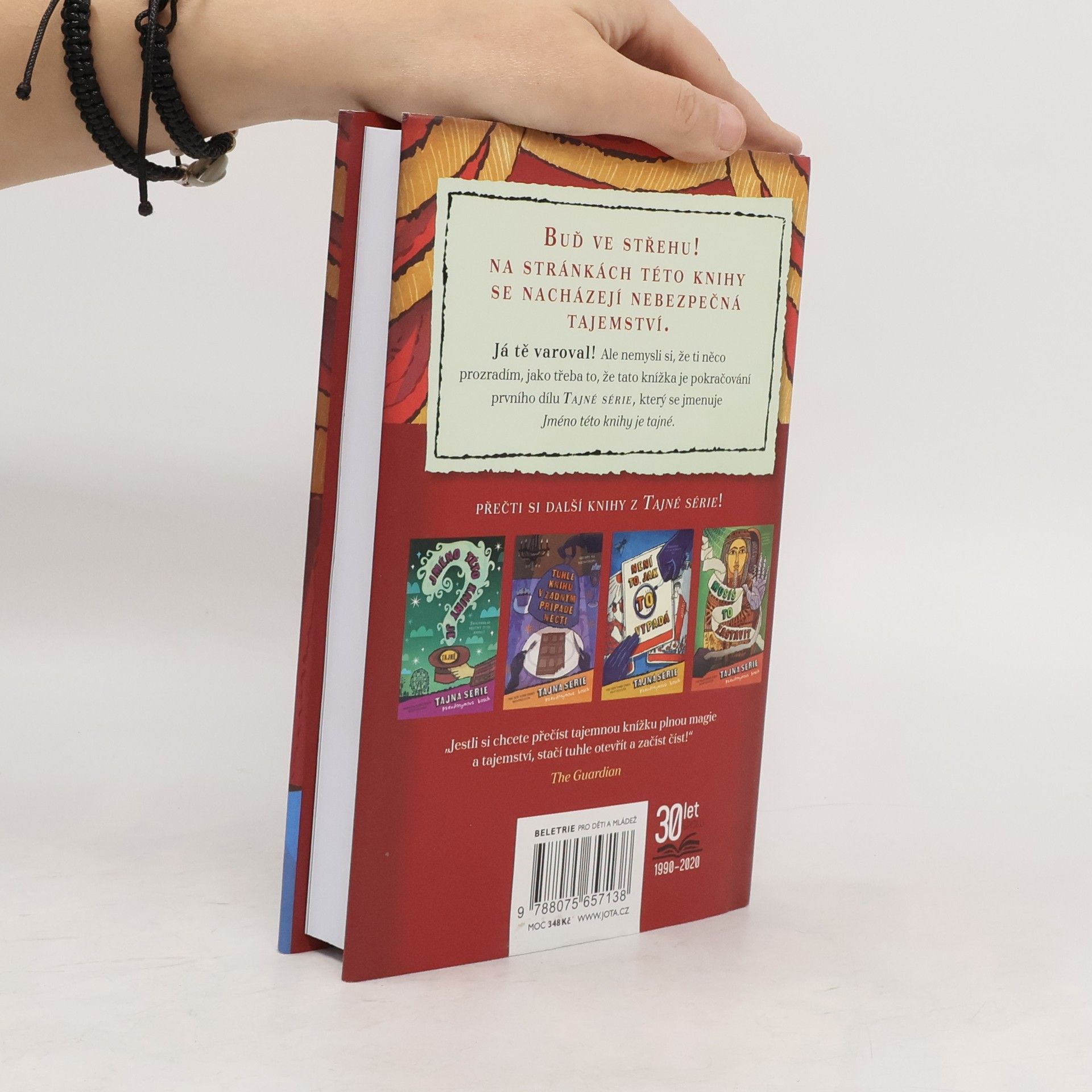 Buď ve střehu! Na stránkách této knihy se nacházejí nebezpečná tajemství! Já tě varoval! Ale nemysli si, že ti něco prozradím, jako třeba to, že tato knížka je pokračování prvního dílu Tajné série, který se jmenuje Jméno této knihy je tajné. Proč bych ti měl připomínat, že když jsme se s našimi hrdiny v první knize rozloučili, Kas a Max Ernest se právě stali členy tajemného Bratrstva Muterces a začali se připravovat na další boj proti zlovolnému doktoru L. a jeho kumpánce slečně Mauvaisové? A už vůbec ode mě neuslyšíš nic o tom, jak Kas a Max Ernest navštívili Muzeum kouzel a konečně se setkali s úžasným starým kouzelníkem jménem Pietro. Ach, do prkýnka! Zase jsem nedokázal udržet jazyk za zuby! Tak aspoň rozhodně nepočítej s tím, že ti něco vyzvoním o ztraceném Zvukovém hranolu, krutém Lordu Faraonovi a tajuplném tvorovi, který se před pěti sty lety narodil v lahvi (fakt nekecám!) a je klíčem k největšímu tajemství všech dob… Ach jo, já si prostě neumím pomoct! Jsem vážně slepičí prdelka. Ale co si budeme povídat, jestli toto čteš, tak už je stejně pozdě.