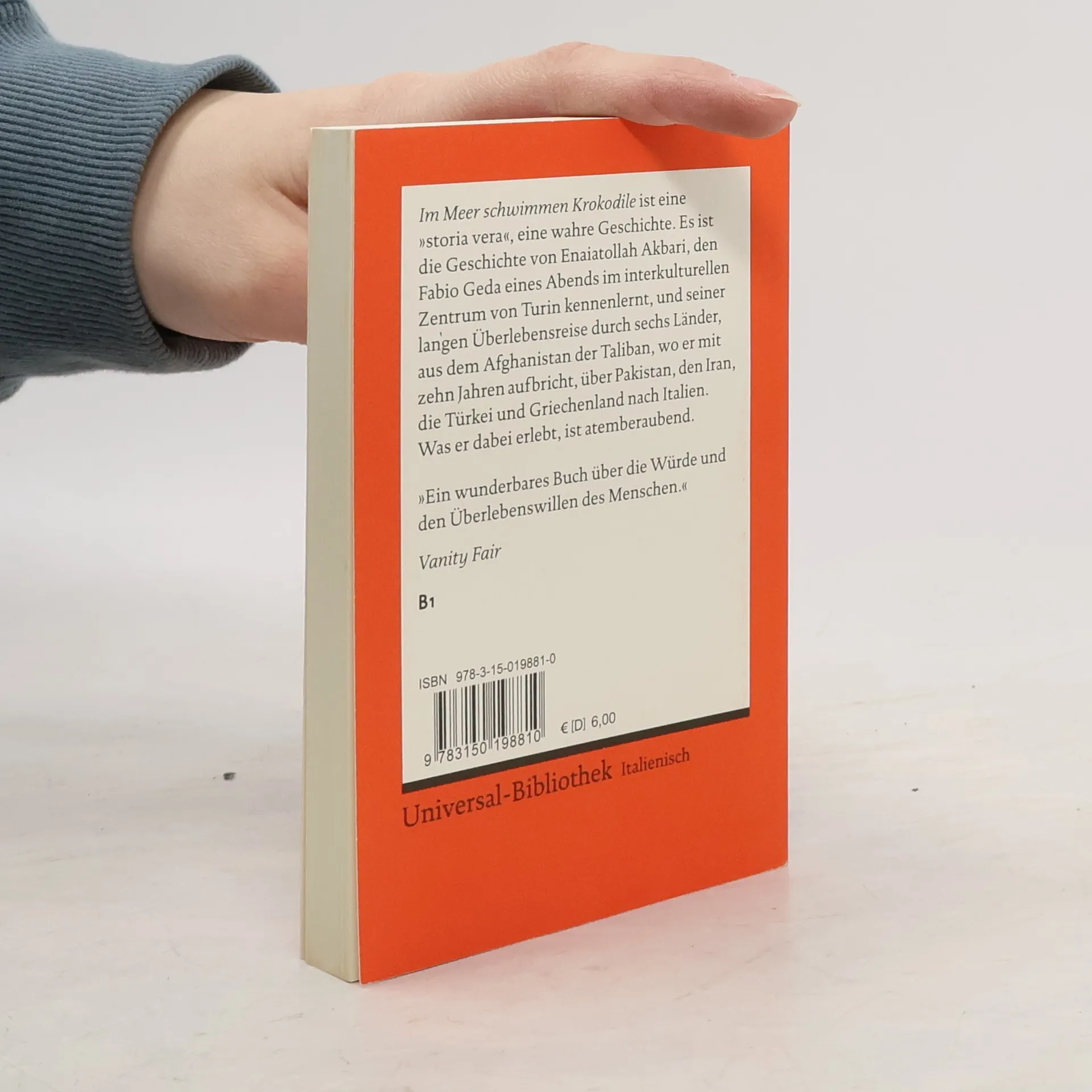 Italienische Literatur in Reclams Roter Reihe: das ist der italienische Originaltext – ungekürzt und unbearbeitet mit Worterklärungen am Fuß jeder Seite, Nachwort und Literaturhinweisen. »Im Meer schwimmen Krokodile« ist eine wahre Geschichte, eine ›storia vera‹. Es ist die Geschichte von Enaiatollah Akbari, den Fabio Geda eines Abends im interkulturellen Zentrum von Turin kennenlernt, und seiner langen Überlebensreise durch sechs Länder, aus dem Afghanistan der Taliban, wo er mit 10 Jahren aufbricht, über Pakistan, den Iran, die Türkei und Griechenland nach Italien. Was er dabei erlebt, ist atemberaubend. Italienische Lektüre: Niveau B1 (GER) Sprachen: Italienisch, Deutsch