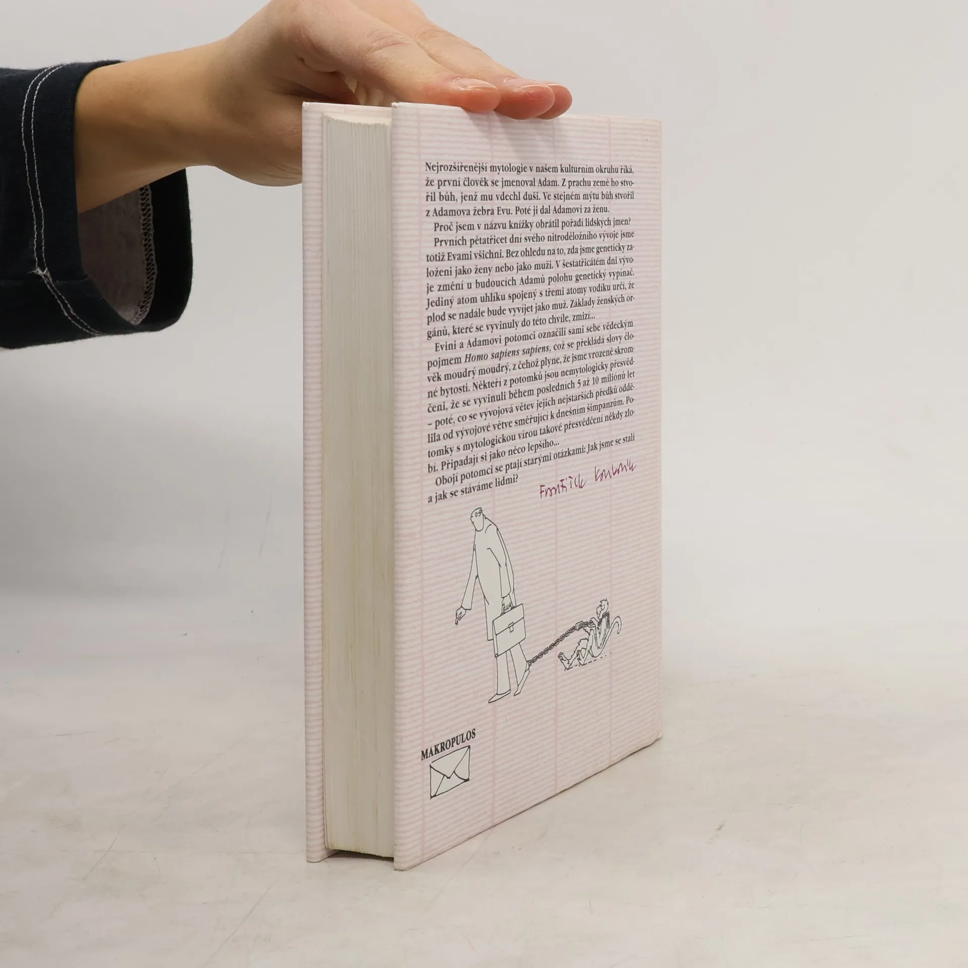 Z úvodu: Nejrozšířenější mytologie v našem kulturním okruhu říká, že první člověk se jmenoval Adam. Z prachu země ho stvořil bůh, jenž mu vdechl duši. Ve stejném mýtu bůh stvořil z Adamova žebra Evu. Poté ji dal Adamovi za ženu. Proč jsem v názvu knížky obrátil pořadí lidských jmen? Prvních pětatřicet dní svého nitroděložního vývoje jsme totiž Evami všichni. Bez ohledu na to, zda jsme geneticky založeni jako ženy nebo jako muži. V šestatřicátém dni vývoje změní u budoucích Adamů polohu genetický vypínač. Jediný atom uhlíku spojený s třemi atomy vodíku určí, že plod se nadále bude vyvíjet jako muž. Základy ženských orgánů, které se vyvinuly do této chvíle, zmizí... Evini a Adamovi potomci označili sami sebe vědeckým pojmem Homo sapiens sapiens, což se překládá slovy člověk moudrý moudrý, z čehož plyne, že jsme vrozeně skromné bytosti. Někteří z potomků jsou nemytologicky přesvědčení, že se vyvinuli během posledních 5 až 10 miliónů let - poté, co se vývojová větev jejich nejstarších předků oddělila od vývojové větve směřující k dnešním šimpanzům. Potomky s mytologickou vírou takové přesvědčení někdy zlobí. Připadají si jako něco lepšího... Obojí potomci se ptají starými otázkami: Jak jsme se stali a jak se stáváme lidmi? autor