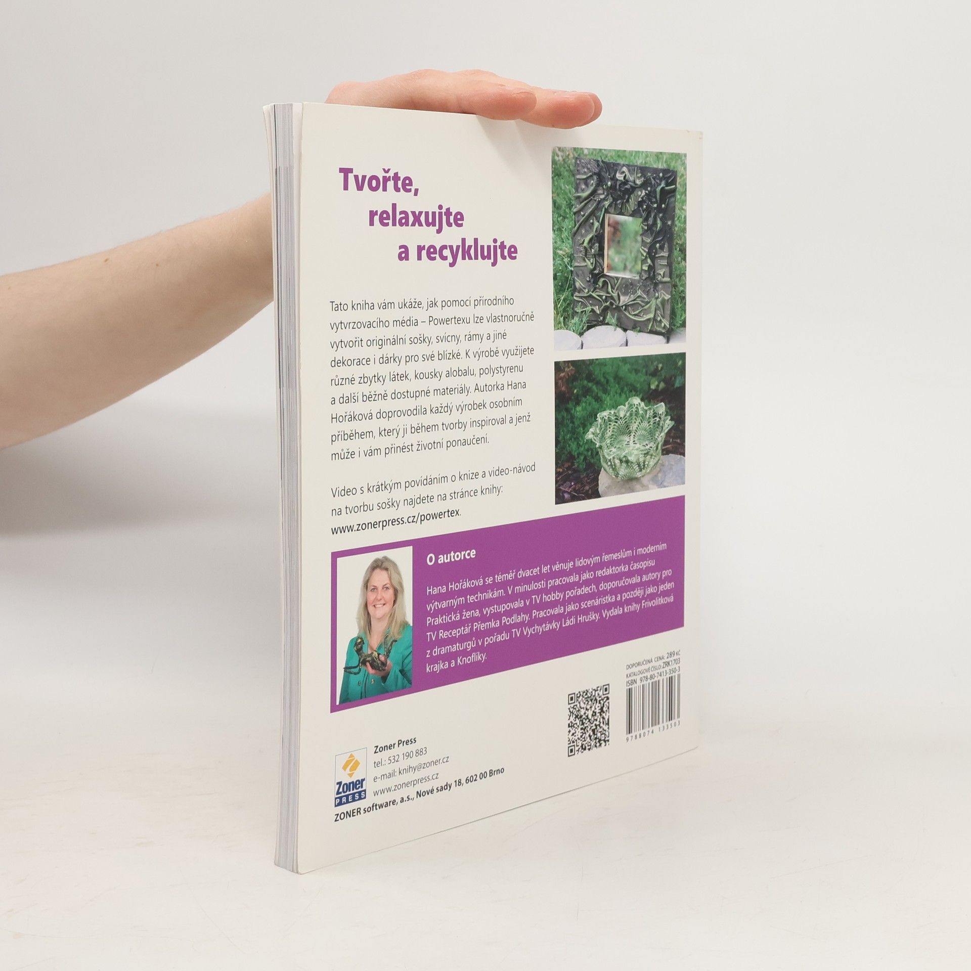 Vytvořte si unikátní sošky, dekorace a dárky Powertex je revoluční výrobek založený na vodní bázi, netoxický, šetrný k přírodě a vhodný i pro děti. Představuje textilní tužidlo, které existuje v mnoha barvách, dá se kombinovat s mnoha barevnými pigmenty a je použitelné na všechny savé materiály. Pro tvorbu s Powertexem využijete různé odstřižky, kousky polystyrenu, dřeva, drátky a další všemožné zbytky a věci na vyhození, kterým tak vdechnete nový život. Ne jen tak pro nic za nic se tvorbě s Powertexem říká technika recyklační. Autorka Hana Hořáková vám ve svých návodech v knize Powertex: Vytvořte si unikátní sošky, dekorace a dárky ukazuje široké využití tohoto textilního tužidla. Za jeden den si můžete vytvořit překrásnou, téměř profesionální sochu, oživíte staré rámy, vytvarujete si jednoduchou ozdobnou misku z krajek, vytvoříte si svícen z papírové role nebo svíčkové hodiny, naučíte se vytvarovat postavu nebo třeba objevíte konzervační schopnosti Powertexu. Důležitou součástí knihy jsou příběhy, které psal sám život. Ke každému výrobku se váže nějaká historka nebo myšlenka, o kterou se s vámi autorka chce podělit a předat vám tak jisté ponaučení, téma pro zamyšlení nebo jen tak pro pobavení. Speciálně ke knize vznikla videa, ve kterých Hana Hořáková svoji knihu představuje a ukazuje vám návod, jak vytvořit sošku z Powertexu. Zde si můžete stáhnout šablony k návodům .