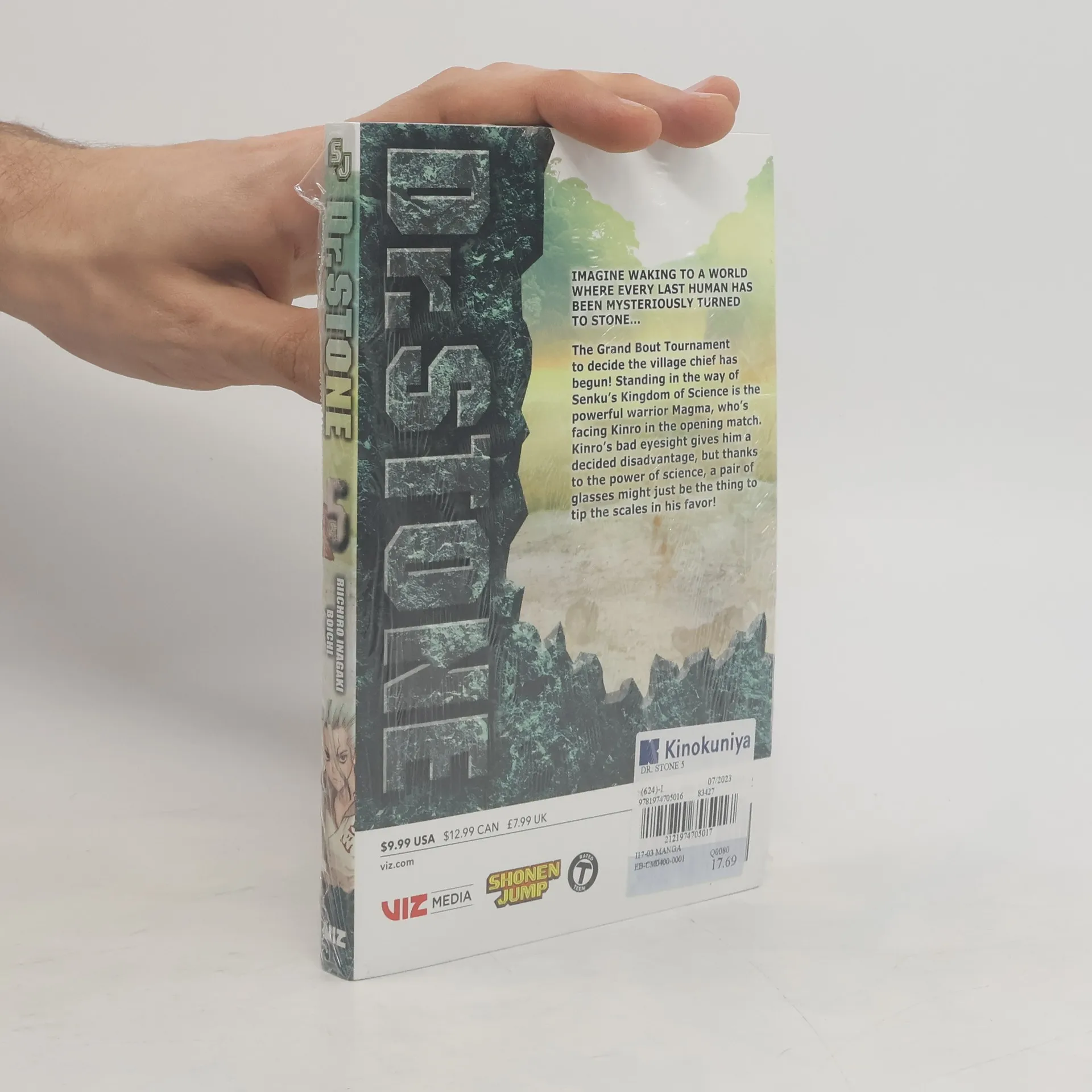 Imagine waking to a world where every last human has been mysteriously turned to stone... One fateful day, all of humanity turned to stone. Many millennia later, Taiju frees himself from the petrification and finds himself surrounded by statues. The situation looks grim-until he runs into his science-loving friend Senku! Together they plan to restart civilization with the power of science! The Grand Bout has begun! For Senku's Kingdom of Science to succeed, they need to win, but standing in their way is the ferocious and powerful Magma! Kinro's first up against him, but his bad eyesight severely handicaps him. A pair of science eyes might be just the thing to turn this battle around!