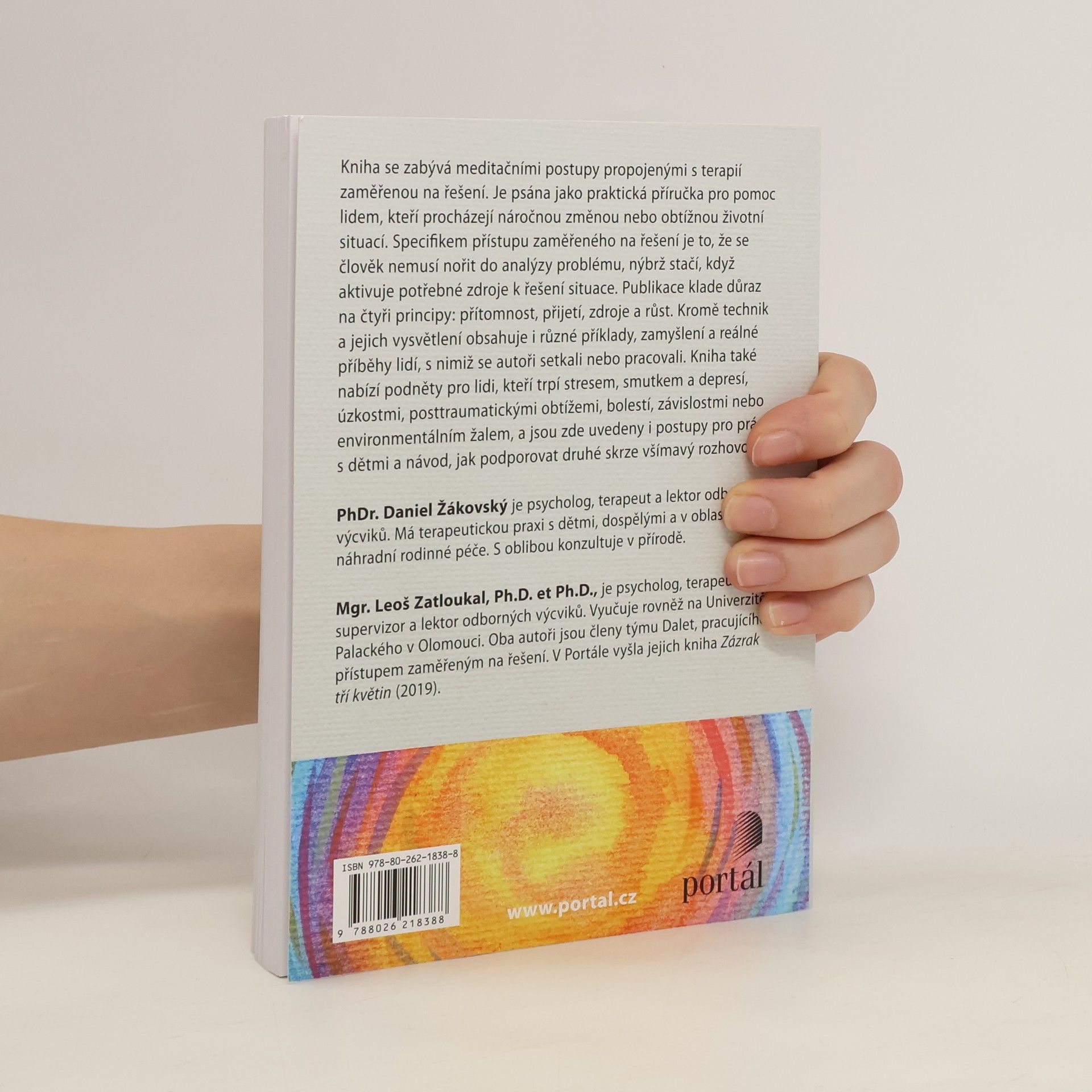 Kniha se zabývá meditačními postupy propojenými s terapií zaměřenou na řešení. Je psána jako praktická příručka pro pomoc lidem, kteří procházejí náročnou změnou nebo obtížnou životní situací. Specifikem přístupu zaměřeného na řešení je to, že se člověk nemusí nořit do analýzy problému, nýbrž stačí, když aktivuje potřebné zdroje k řešení situace. Publikace klade důraz na čtyři principy: přítomnost, přijetí, zdroje a růst. Kromě technik a jejich vysvětlení obsahuje i různé příběhy, zamyšlení a reálné příběhy lidí, s nimiž se autoři setkali nebo pracovali. Kniha nabízí také podněty pro lidi, kteří trpí stresem, smutkem a depresí, úzkostmi, posttraumatickými obtížemi, bolestí, závislostmi nebo environmentálním žalem, a jsou zde uvedeny i postupy pro práci s dětmi a návod, jak podporovat druhé skrze všímavý rozhovor. PhDr. Daniel Žákovský je psycholog, terapeut a lektor odborných výcviků. Má terapeutickou praxi s dětmi, dospělými a v oblasti náhradní rodinné péče. S oblibou konzultuje v přírodě. Mgr. Leoš Zatloukal, Ph.D. et Ph.D. je psycholog, terapeut, supervizor a lektor odborných výcviků. Vyučuje rovněž na Univerzitě Palackého v Olomouci. Oba autoři jsou členy týmu Dalet, pracujícího přístupem zaměřeným na řešení. V Portálu vyšla jejich kniha Zázrak tří květin.