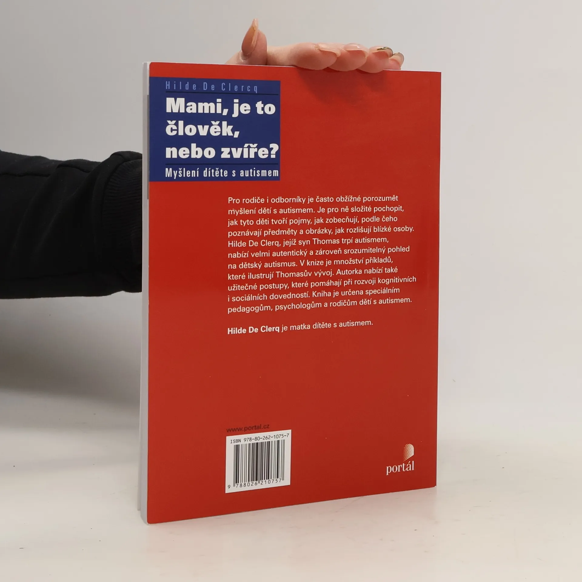 Myšlení dítěte s autismem. Pro rodiče i odborníky je často obtížné porozumět myšlení dětí s autismem. Je pro ně složité pochopit, jak tyto děti tvoří pojmy, jak zobecňují, podle čeho poznávají předměty a obrázky, jak rozlišují blízké osoby. Hilde De Clerq, jejíž syn Thomas trpí autismem, nabízí velmi autentický a zároveň srozumitelný pohled na dětský autismus. V knize je množství příkladů, které ilustrují Thomasův vývoj. Autorka předkládá také užitečné postupy, které pomáhají při rozvoji kognitivních i sociálních dovedností. Kniha je určena speciálním pedagogům, psychologům a rodičům dětí s autismem.