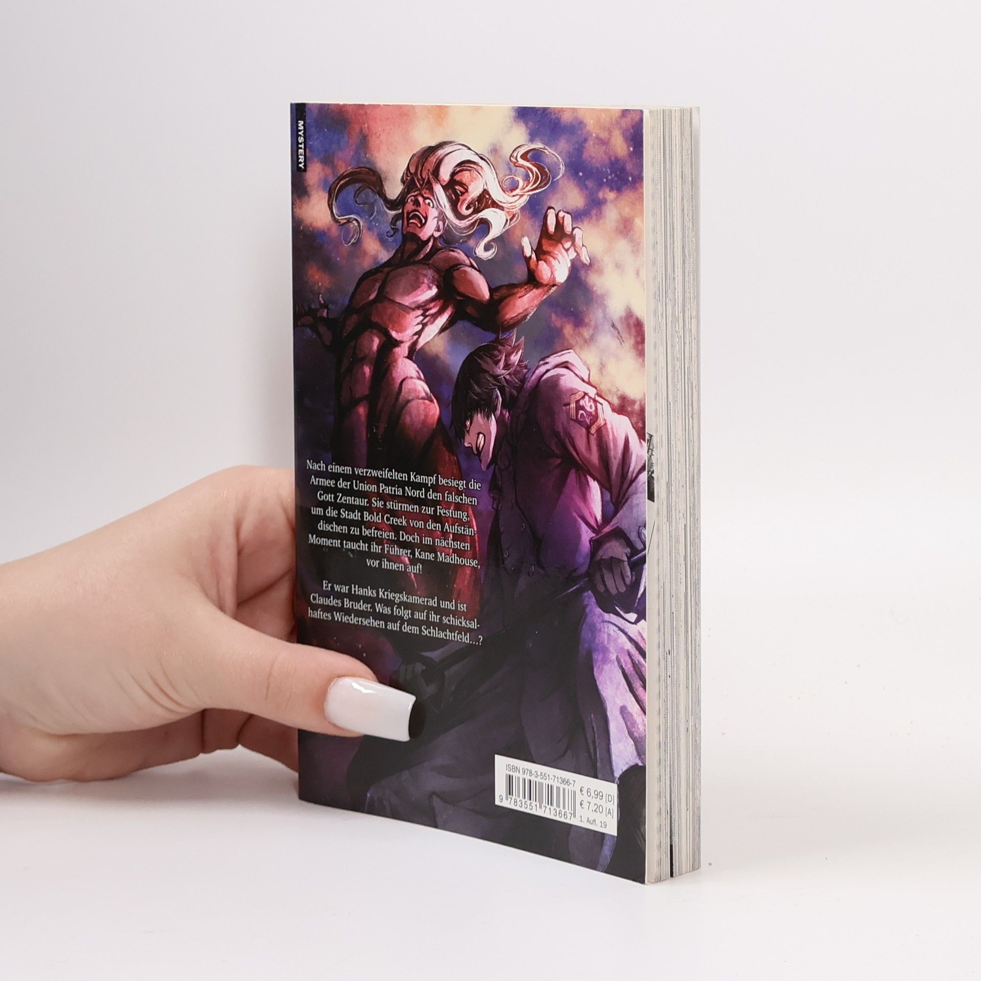 Soldaten aus falschen Göttern – diese Krieger waren einst Menschen, doch durch verbotene Praktiken der dunklen Magie wurden sie zu künstlich geschaffenen Fabelwesen – zu Superkriegern mit Kräften den Göttern gleich. Carlsen präsentiert den neuen Dark Fantasy-Hammer von Maybe (DUSK MAIDEN OF AMNESIA)! Nach einem verzweifelten Kampf besiegt die Armee der Union Patria Nord den falschen Gott Zentaur. Sie stürmen zur Festung, um die Stadt Bold Creek von den Aufständischen zu befreien. Doch im nächsten Moment taucht ihr Führer, Kane Madhouse, vor ihnen auf! Er war Hanks Kriegskamerad ist Claudes Bruder. Was folgt auf ihr schicksalhaftes Wiedersehen auf dem Schlachtfeld…? Ein düsteres Horror-Action-Spektakel, perfekt für Fans von "Attack on Titan" und "Promised Neverland". Weitere Informationen: - Empfohlen ab 14 Jahren - Der Manga zum Anime-Erfolg auf Crunchyroll - Bisher 13 Bände erschienen