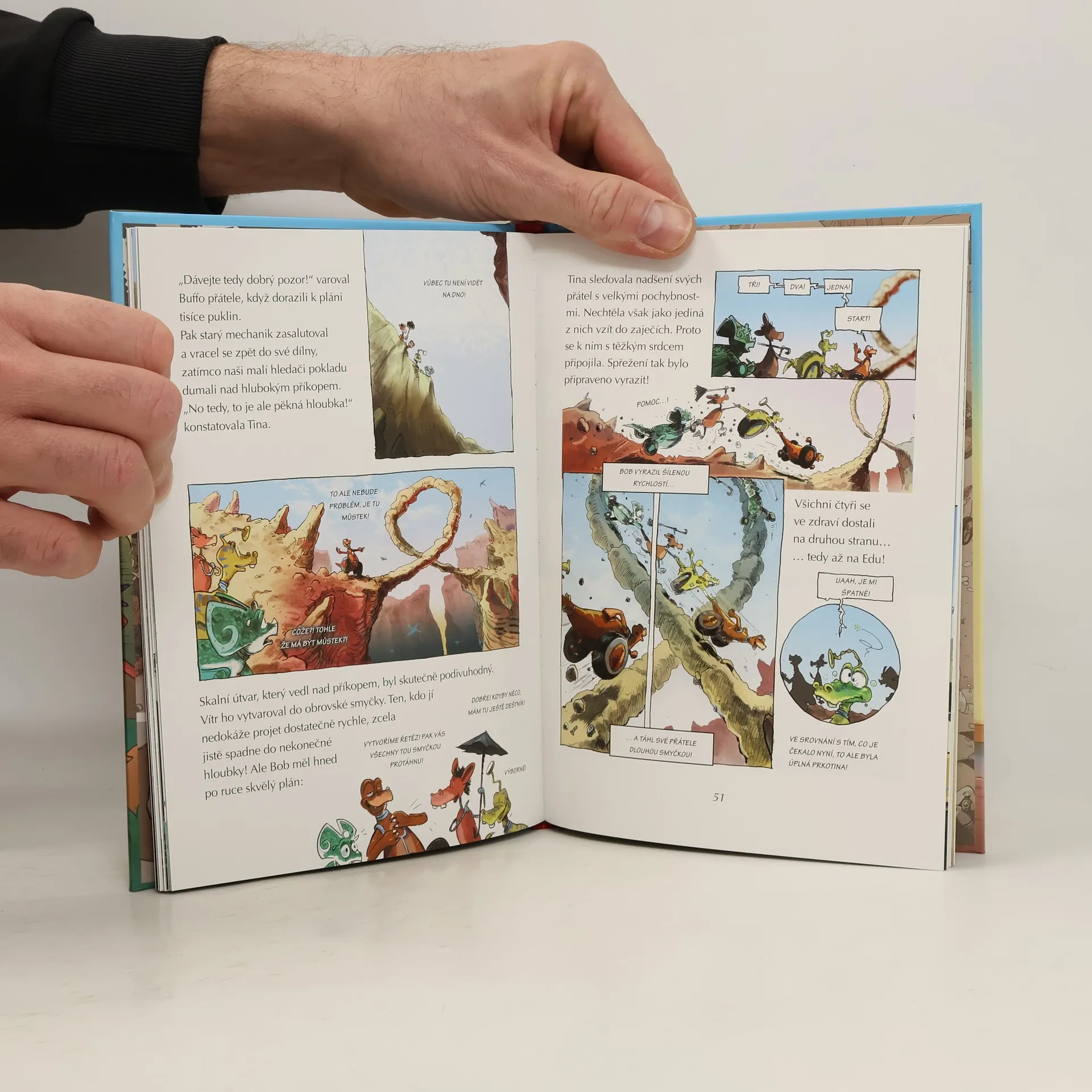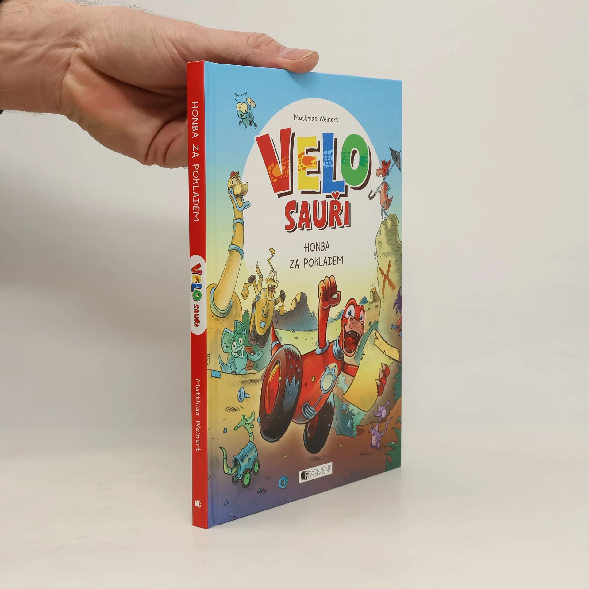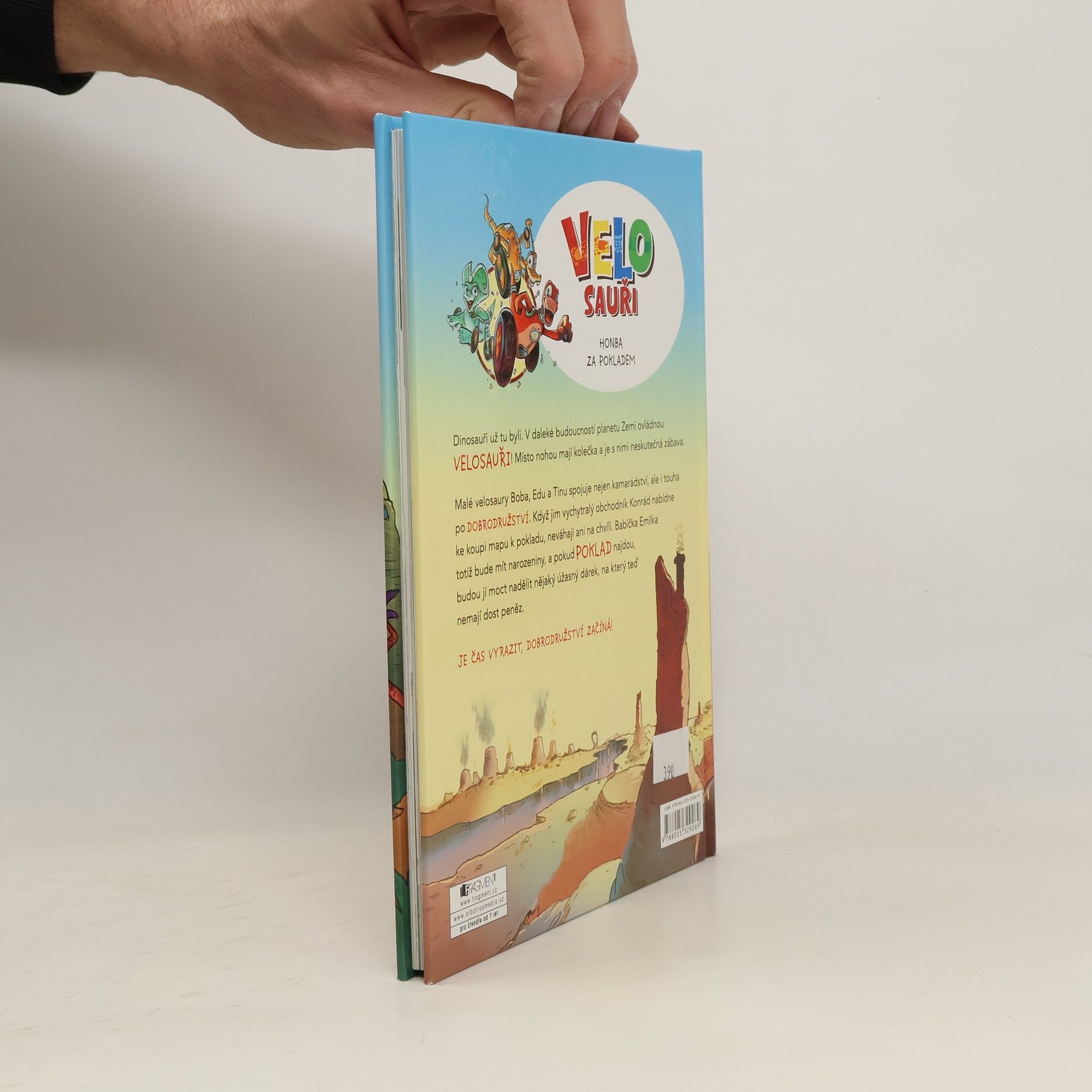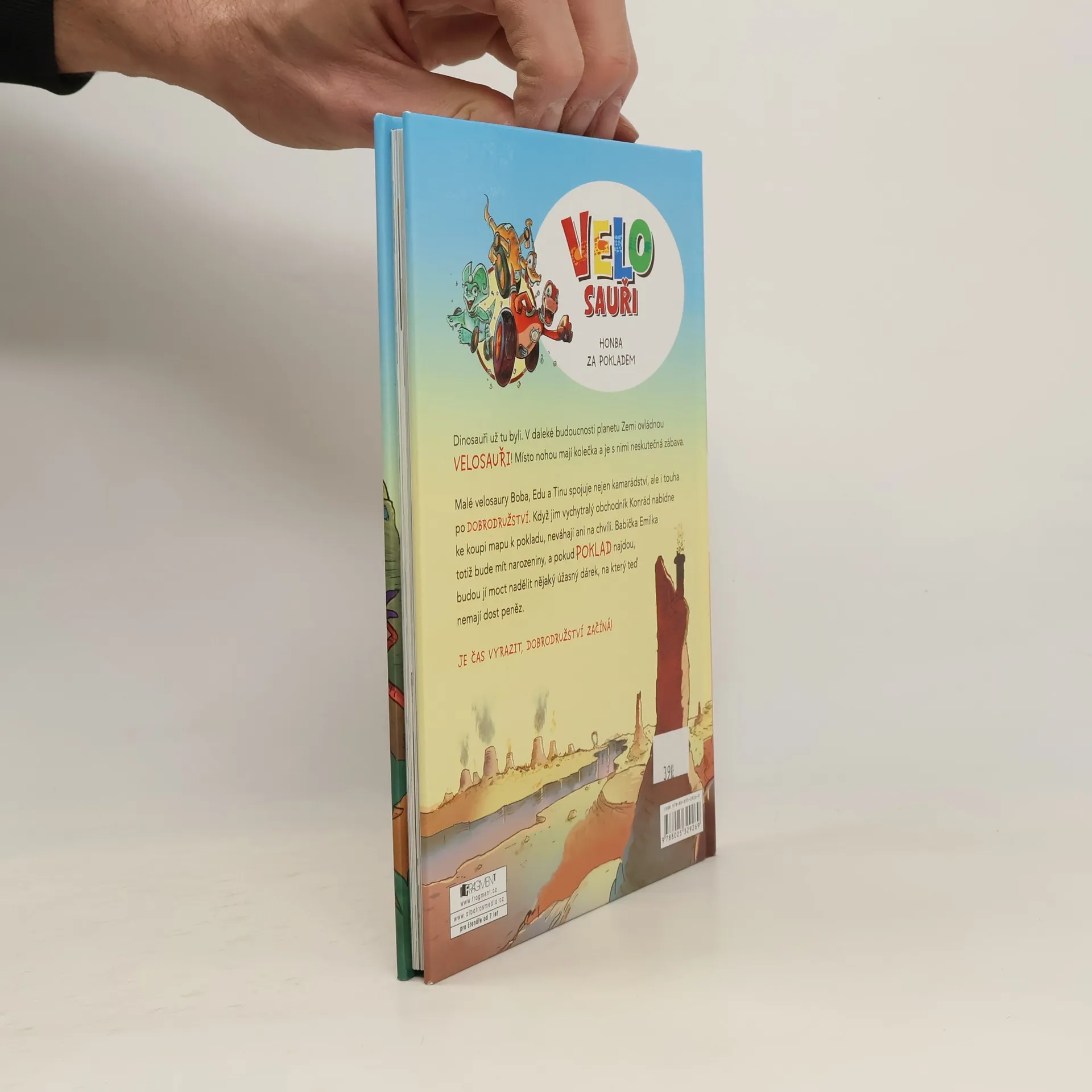 Dinosauři už tu byli. V daleké budoucnosti planetu Zemi ovládnou VELOSAUŘI! Místo nohou mají kolečka a je s nimi neskutečná zábava. Malé velosaury Boba, Edu a Tinu spojuje nejen kamarádství, ale i touha po dobrodružství. Když jim vychytralý obchodník Konrád nabídne ke koupi mapu k pokladu, neváhají ani na chvíli. Babička Emilka totiž bude mít narozeniny, a pokud poklad najdou, budou jí moct nadělit nějaký úžasný dárek, na který teď nemají dost peněz. Je čas vyrazit, dobrodružství začíná!